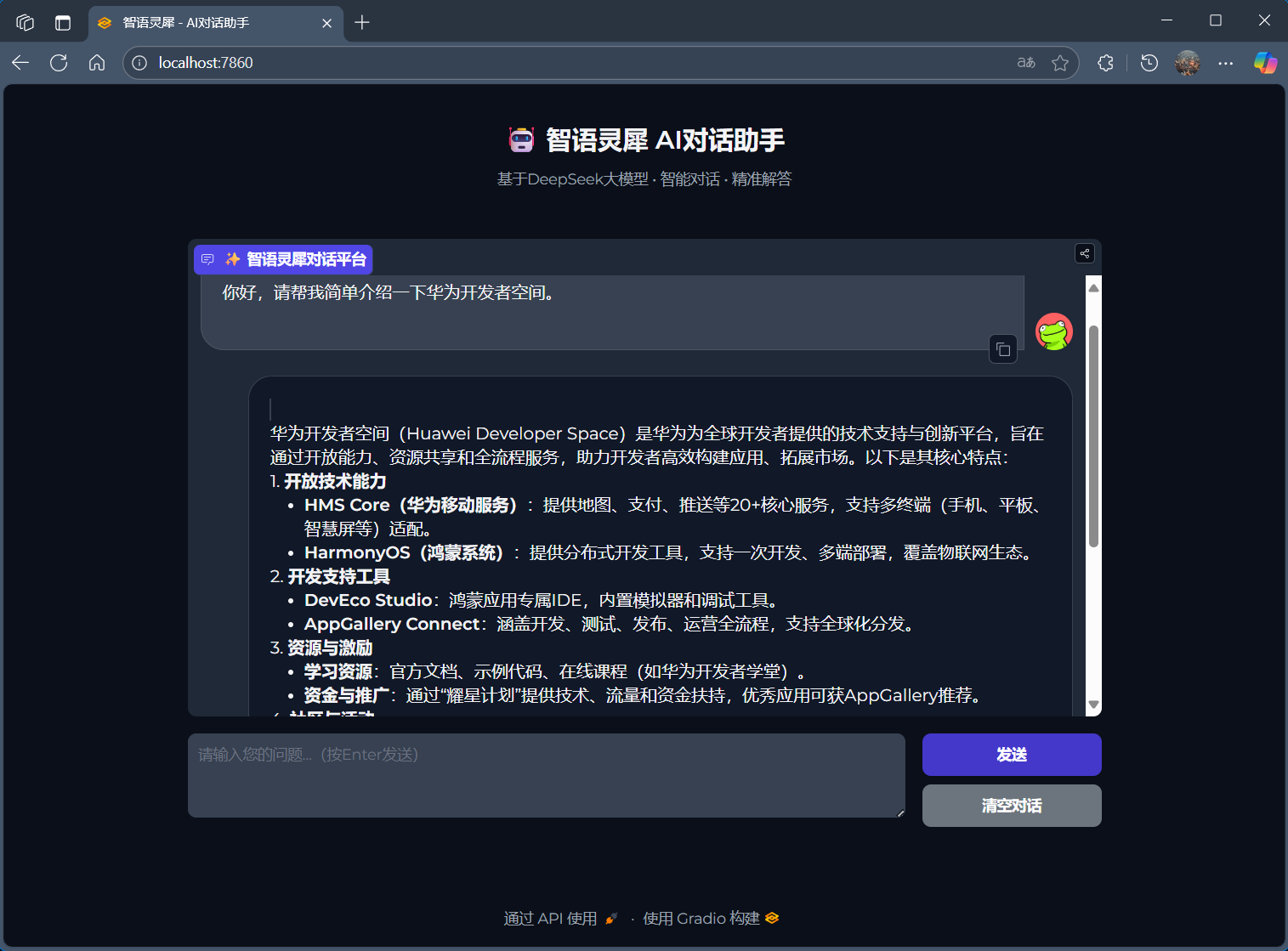 AI智能对话助手技术架构上,项目采用Python+Gradio技术栈,基于华为MaaS平台的强大算力支持,实现了高性能的智能对话服务。