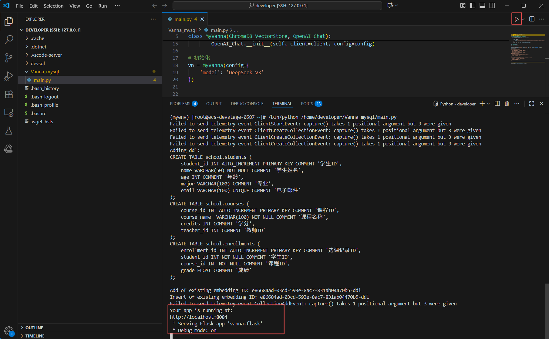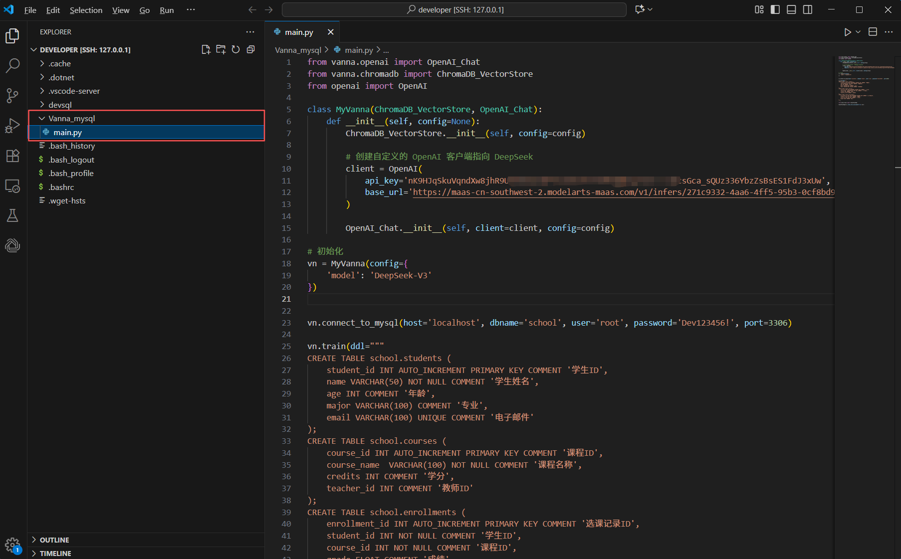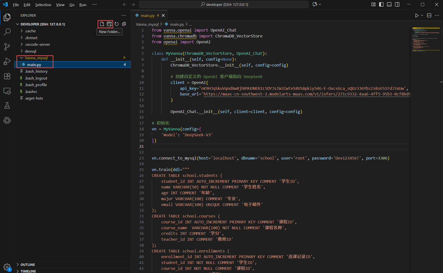 完成上述步骤后,在VS Code左侧/home/developer文件目录下点New Folder,创建Vanna_mysql目录,并在该目录下点New File,创建main.py。