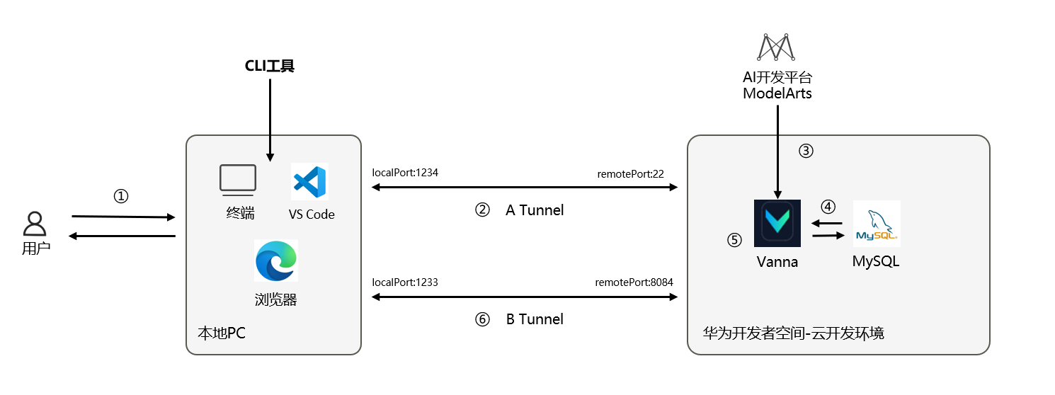 - 创建隧道A,配置VS Code远程连接,进入云开发环境;