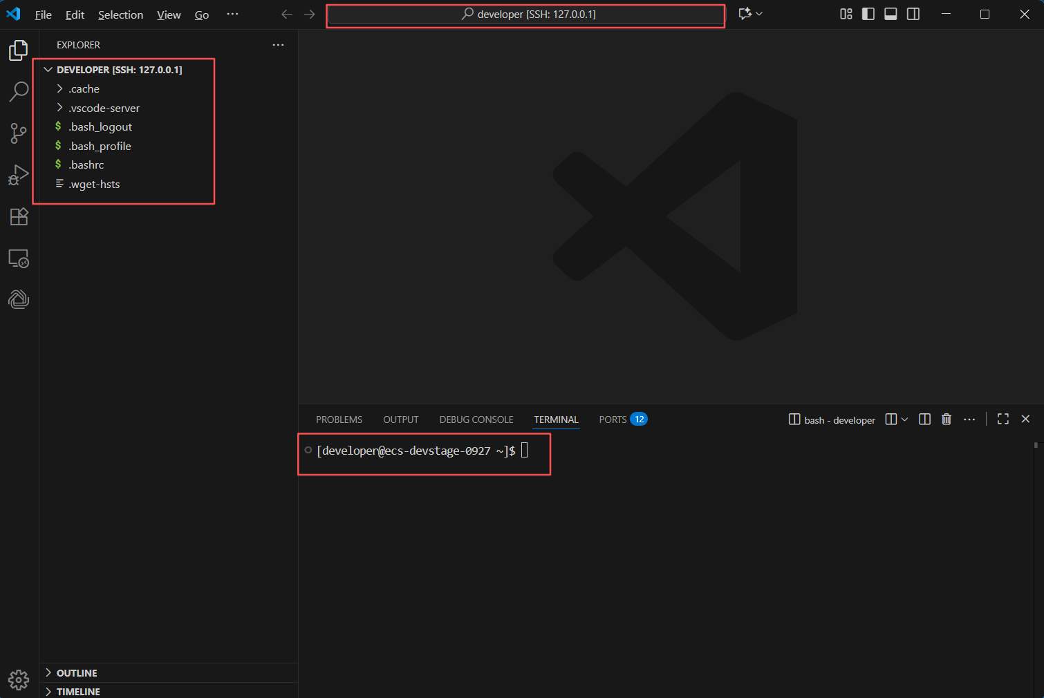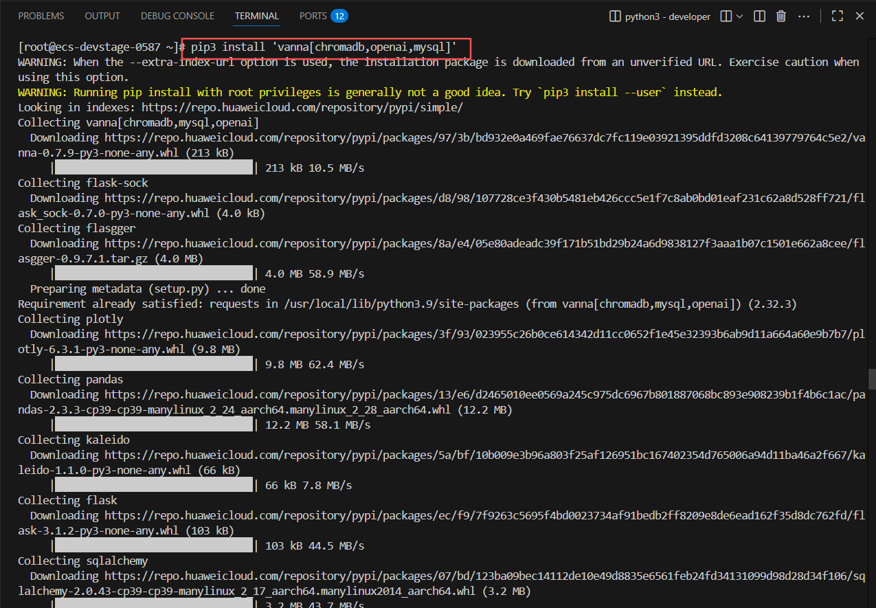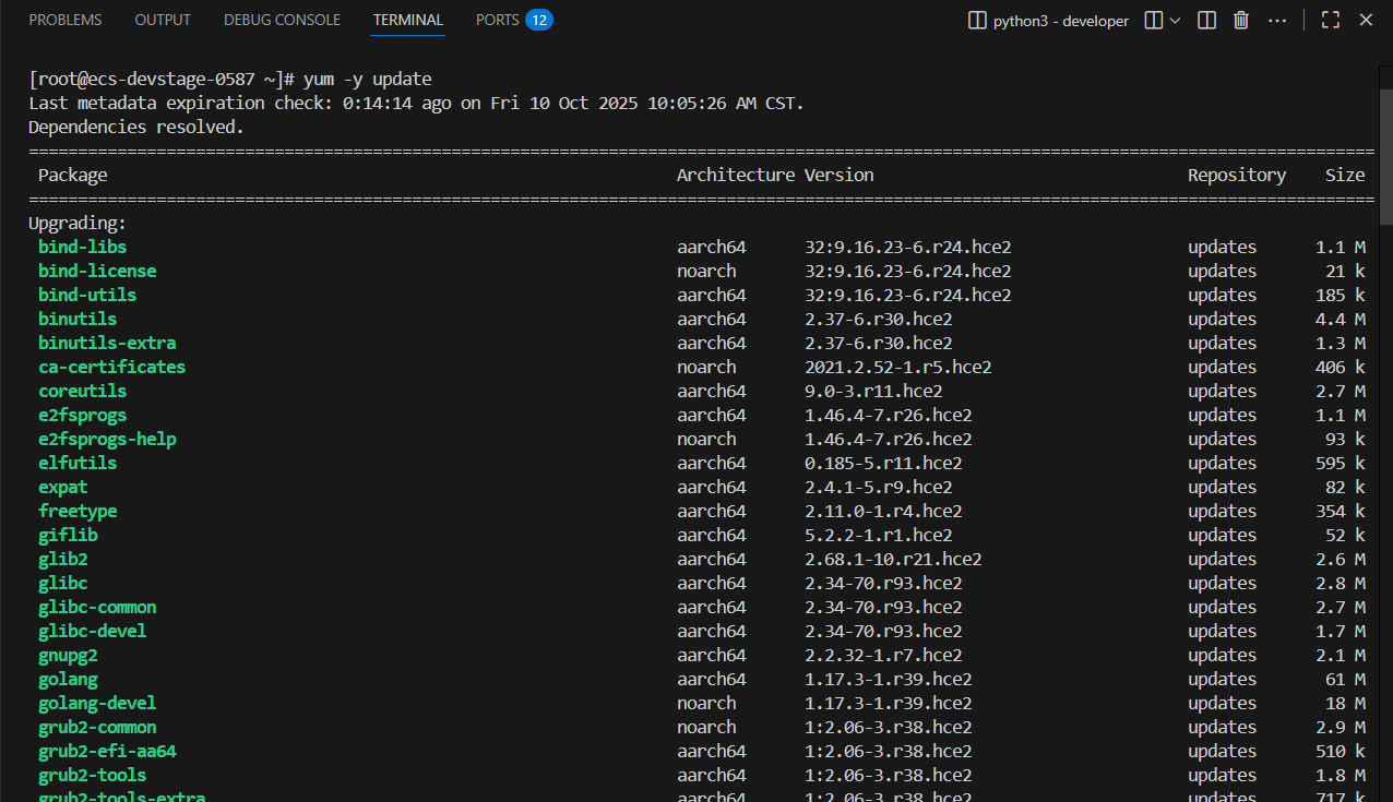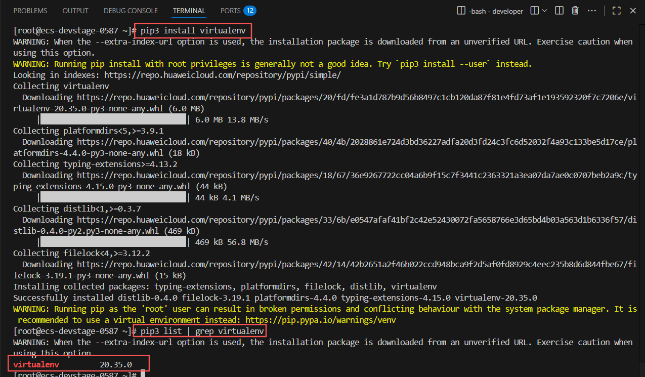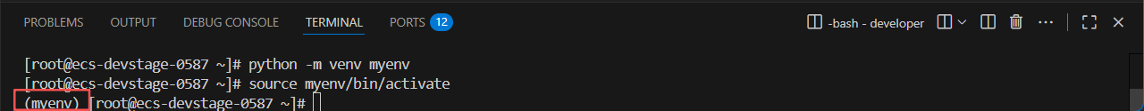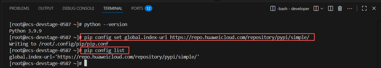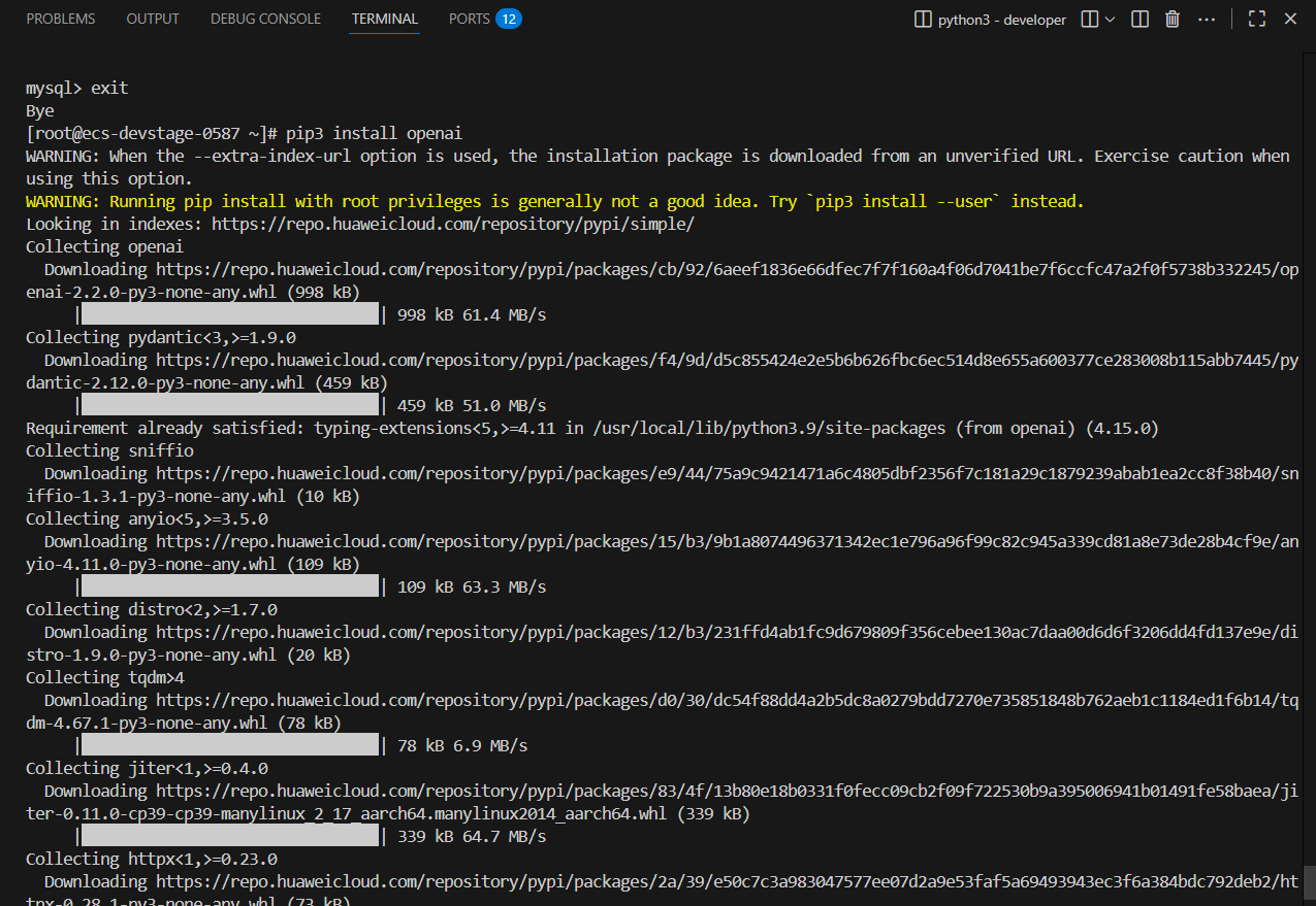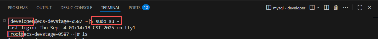 - 本案例在云开发环境root用户下进行,系统默认使用developer用户权限,需要手动切换到root用户权限。VS Code远程连接,进入云开发环境后,在控制台输入如下指令: