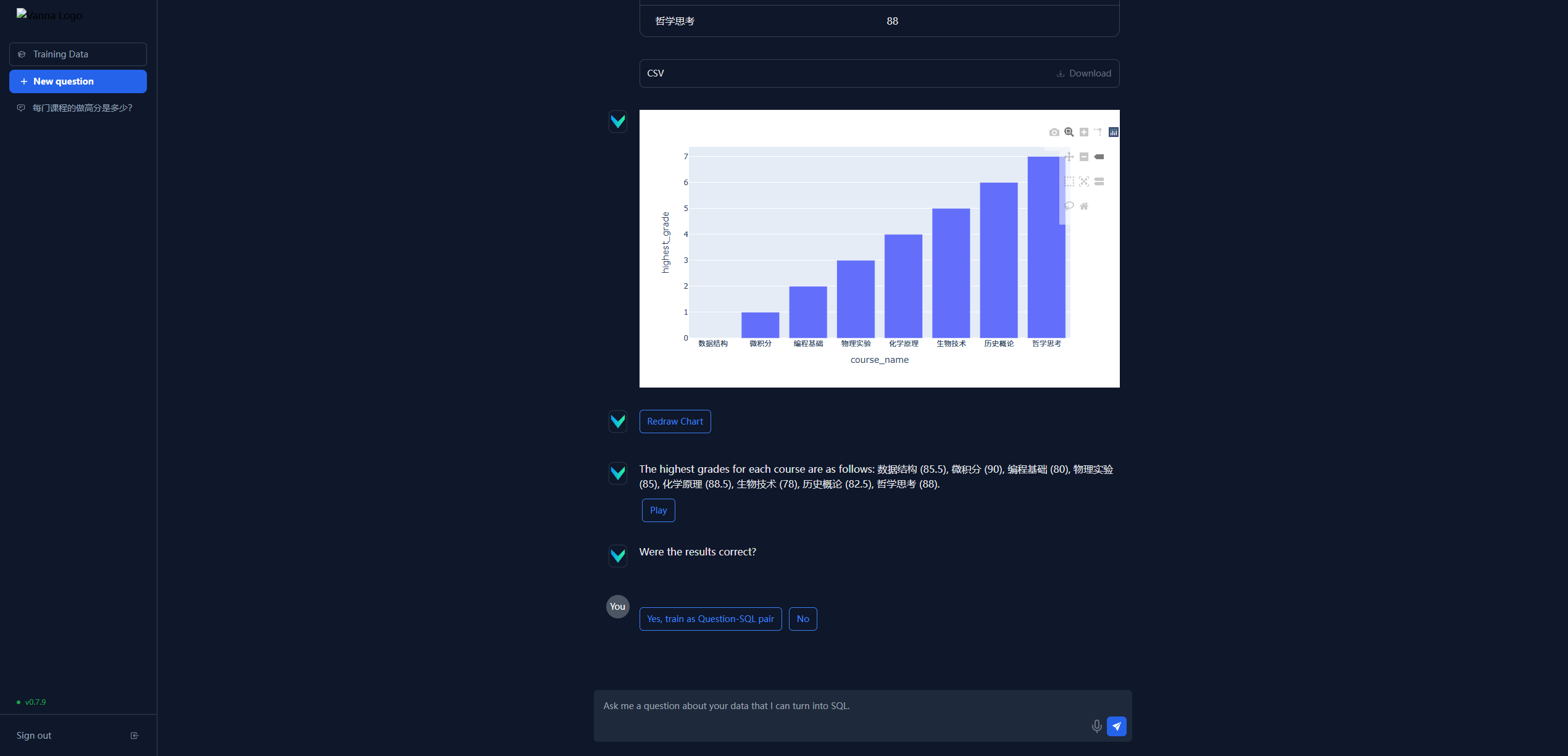 在PC本地打开浏览器,访问:http://127.0.0.1:1233/,然后对Vanna提问:“每门课程的最高分是多少?”。