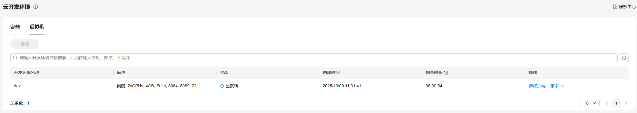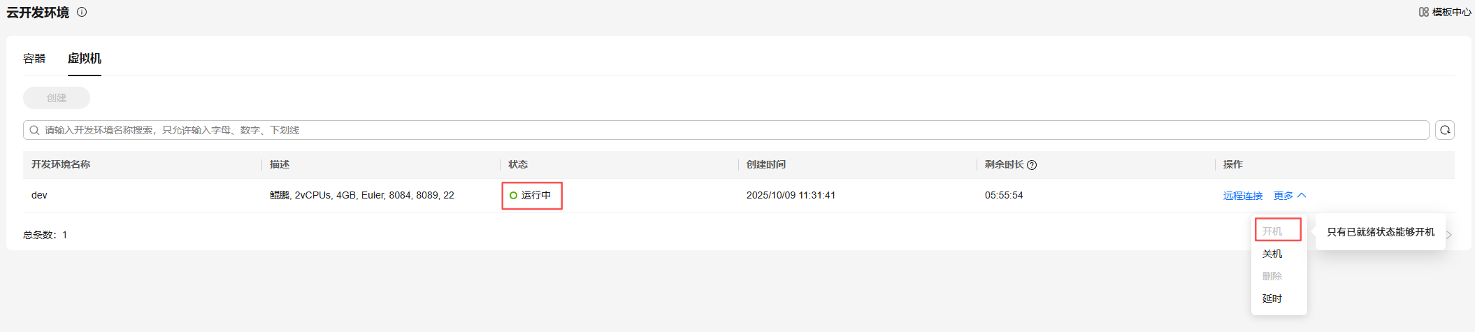 创建配置完成后,参考案例《开发者空间 - 云开发环境使用指导》的“3. 管理云开发环境”,操作云开发环境开机,开机后状态如下: