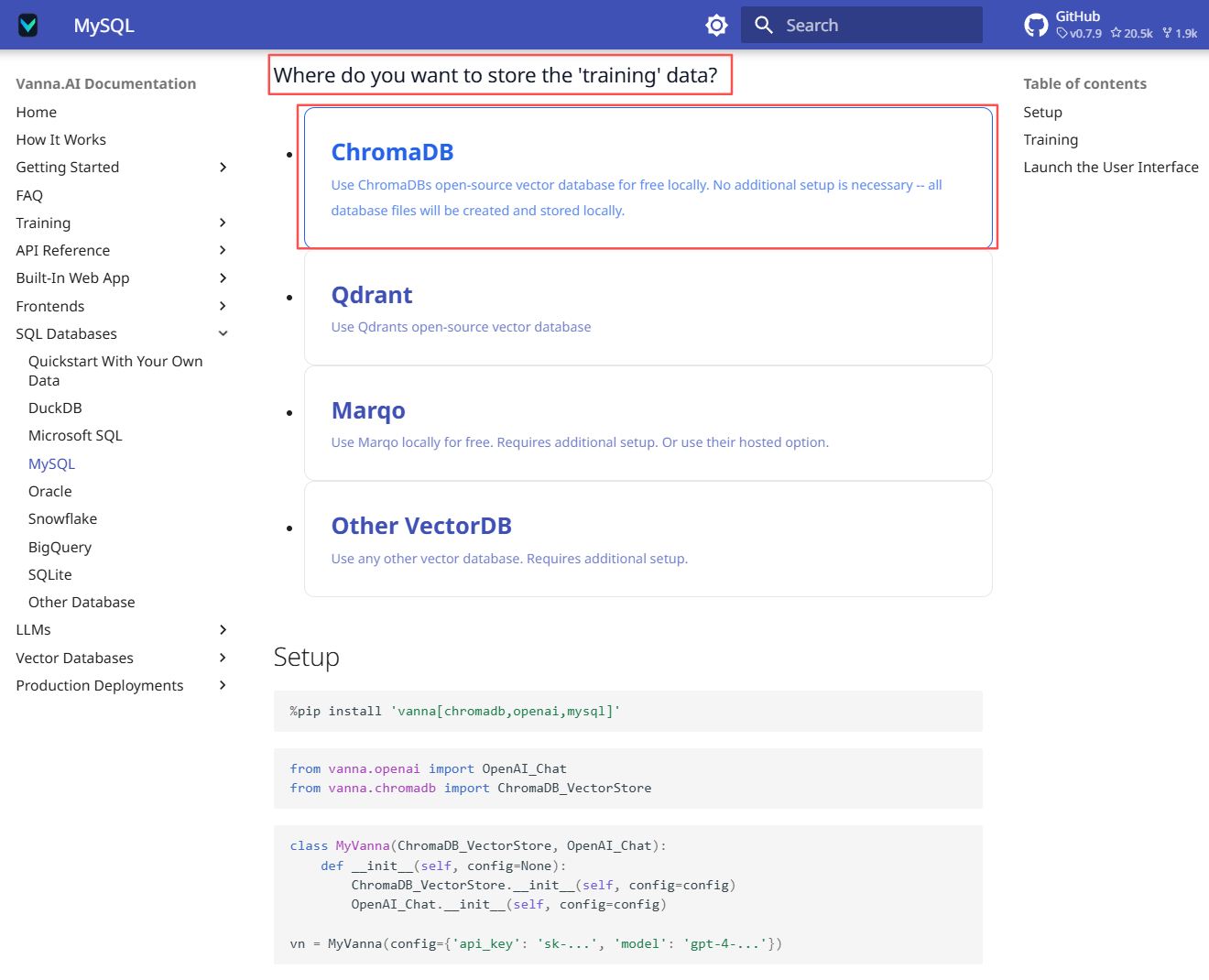 由此我们获取到Vanna安装、创建、调用、训练等样例代码。下一步我们将先开始安装Vanna。
