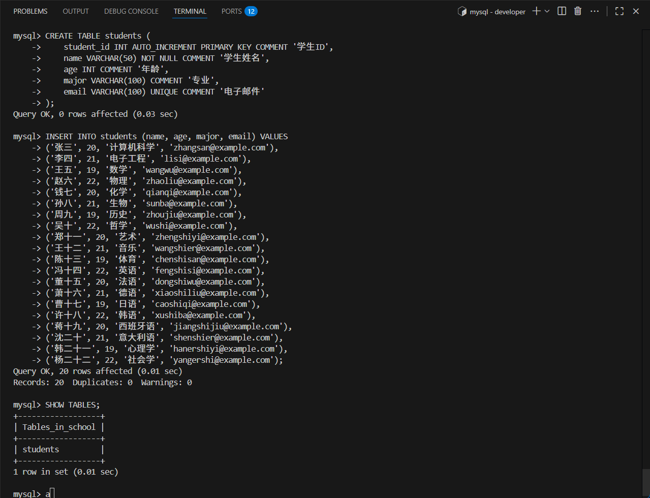 ('张三', 20, '计算机科学', 'zhangsan@example.com'),