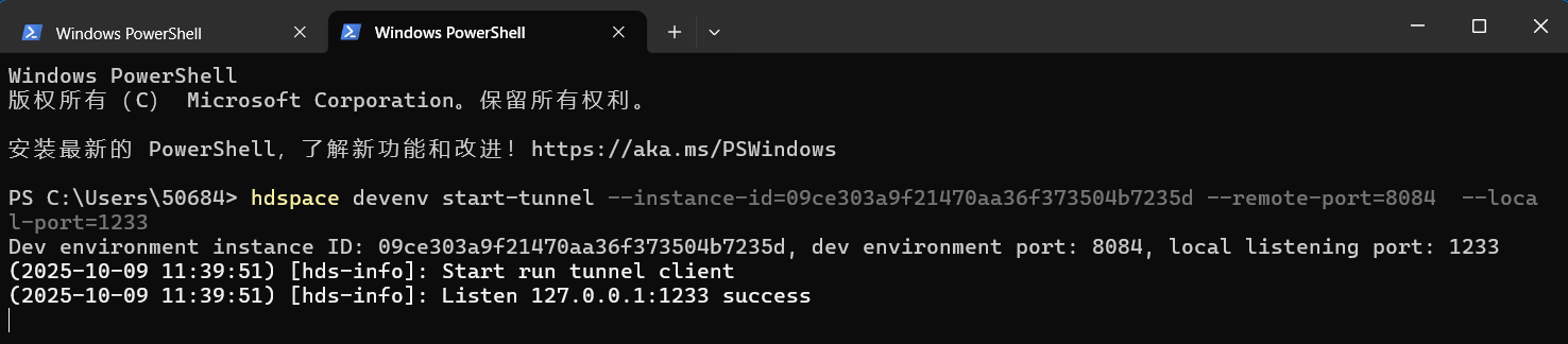 hdspace devenv start-tunnel --instance-id={InstanceId} --remote-port=8084 --local-port=1233