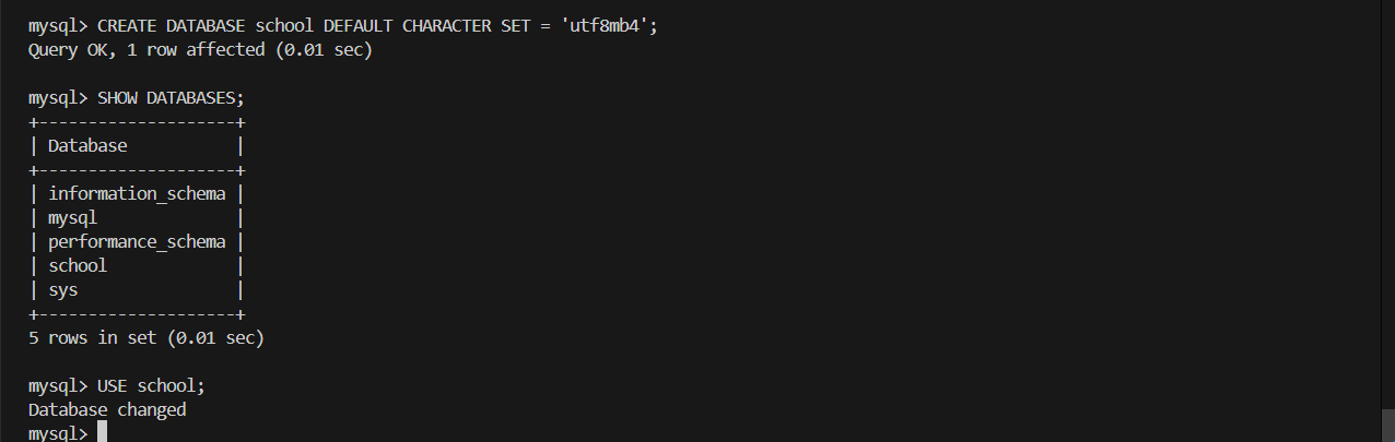 CREATE DATABASE school DEFAULT CHARACTER SET = 'utf8mb4';