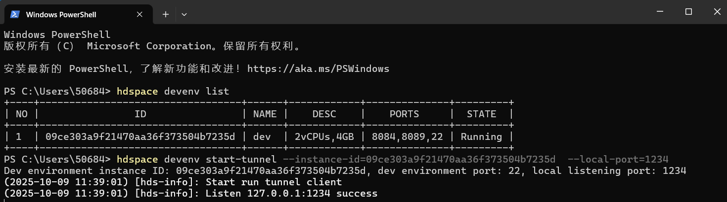 hdspace devenv start-tunnel --instance-id={InstanceId} --local-port=1234