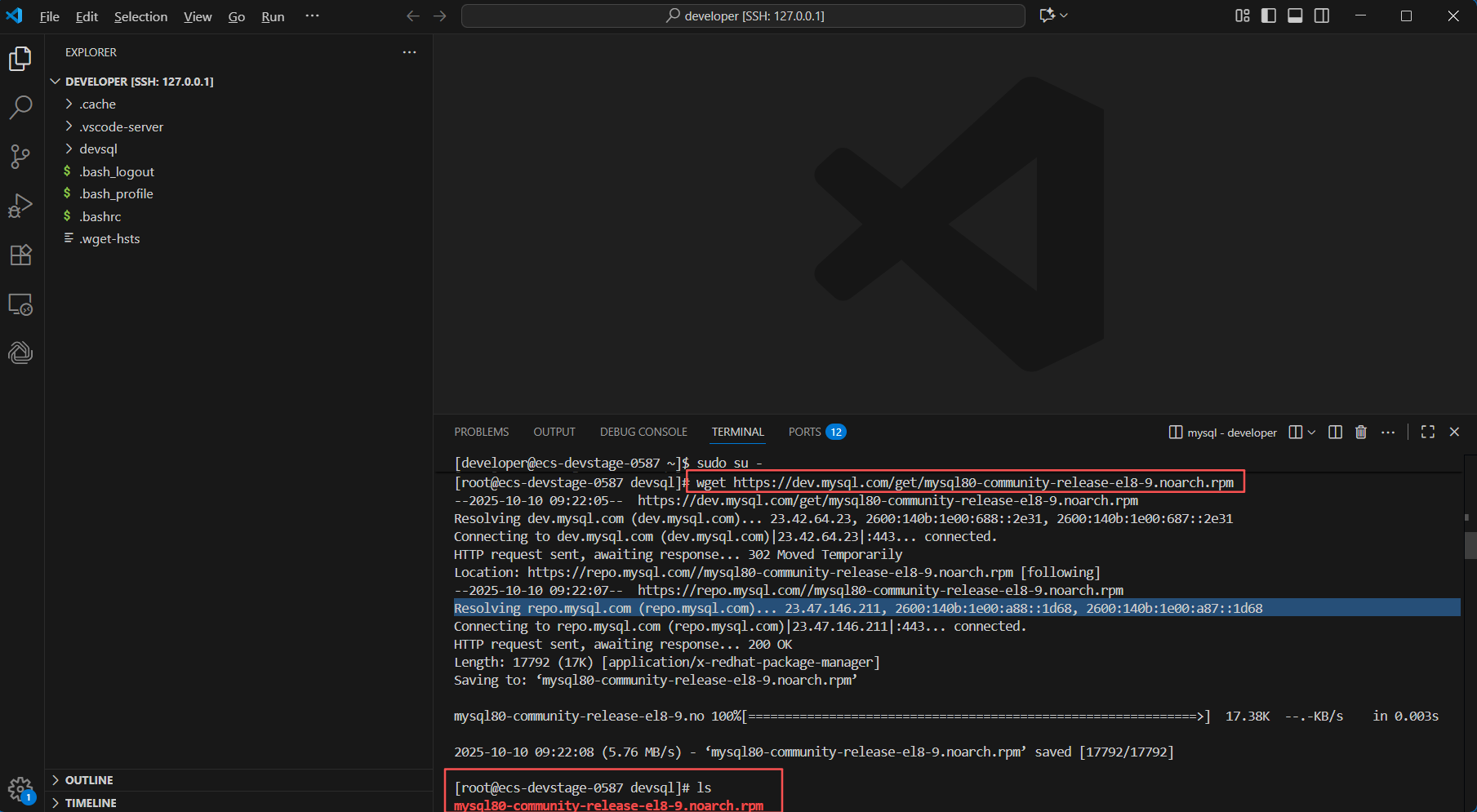/home/developer/目录下创建devsql文件夹,并进入到该文件目录中,然后通过wget命令下载mysql80-community-release-el8-9.noarch.rpm。