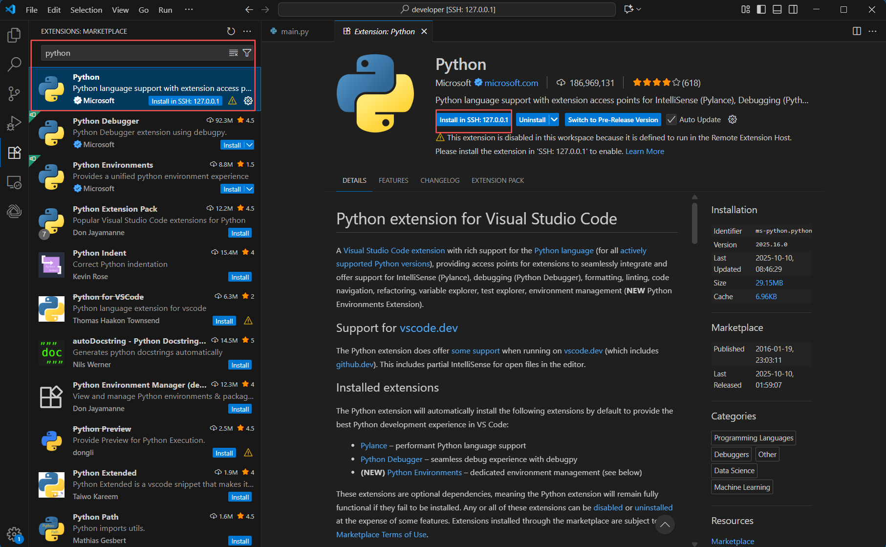 在VS Code远程连接窗口中,点插件市场,搜索python,然后选中插件,点Install in SSH: 127.0.0.1。