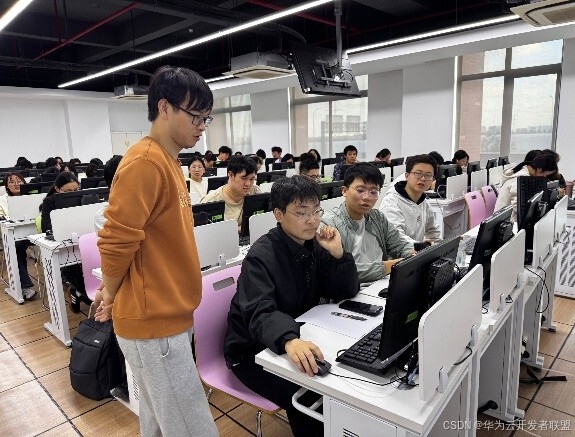 在上海杉达学院,一场别开生面的技术推广活动正在展开。食堂门口的“华为开发者空间”主题展位前聚集了众多感兴趣的同学,华为云HCSD校园大使金泽和宋凯怡现场指导同学们完成开发者空间的免费领取与配置。并向同学们详细介绍:“华为开发者空间不仅提供便捷的开发桌面,更是一个功能完备的创新平台。”活动的热烈氛围延续到了实验室,老师正带领学生实践,从开发者空间的网络连通性检查到基础命令操作,同学们在陈老师的指导下逐步搭建稳定的开发环境。当同学们成功运行第一个“Hello World”程序时,在场同学们无比自豪。