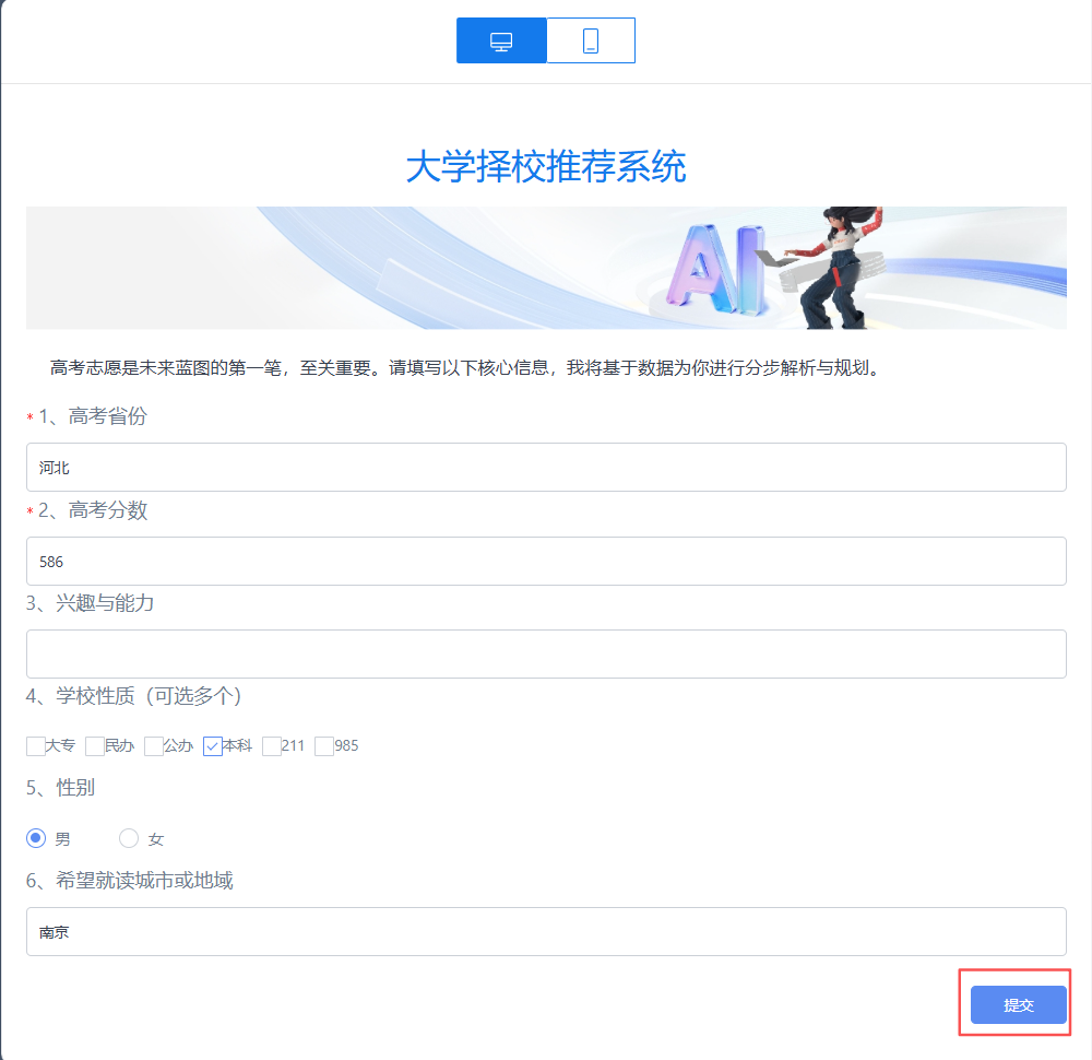 点预览后,自动打开大学择校推荐系统预览页面,正常填写表单,然后点提交。样例数据: