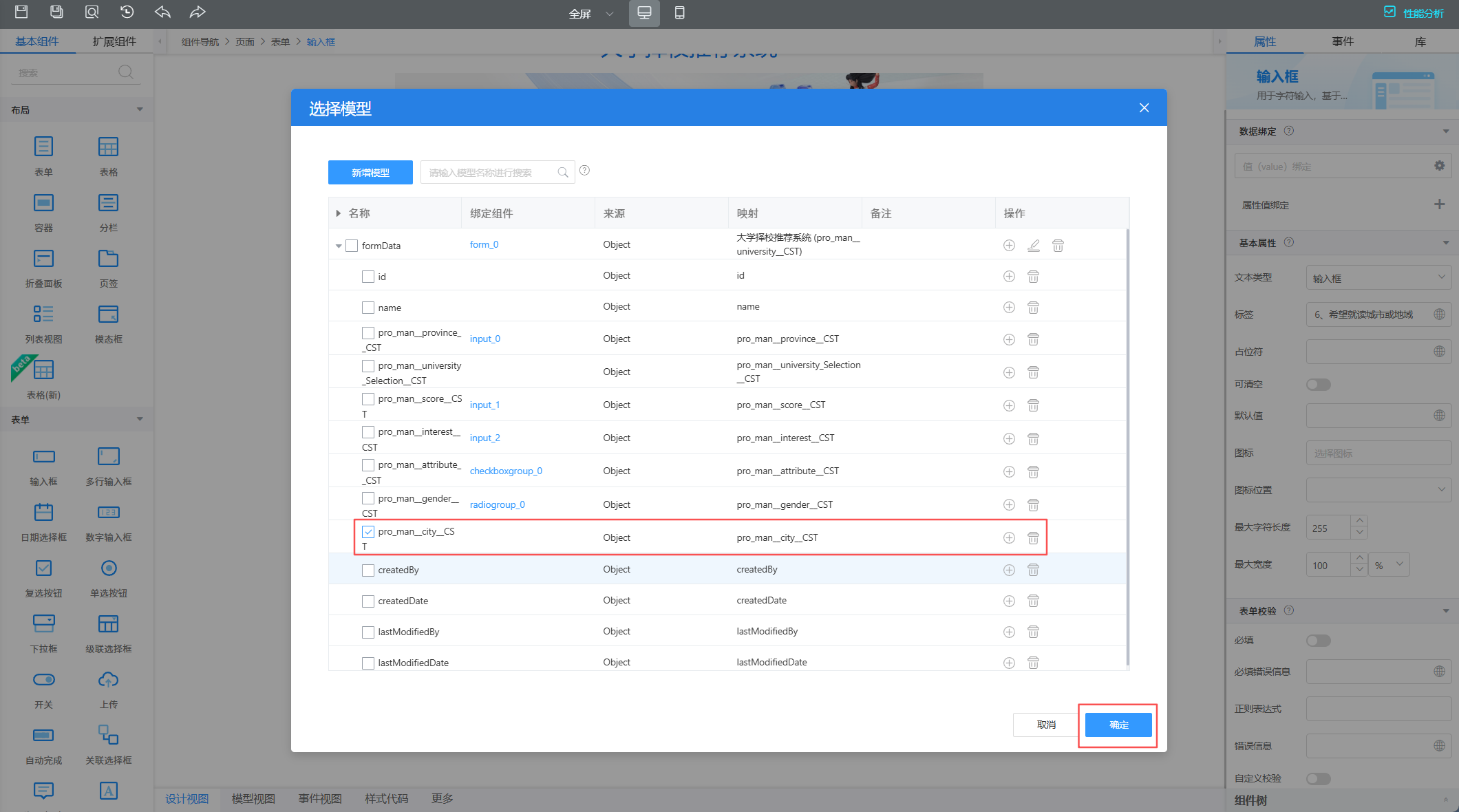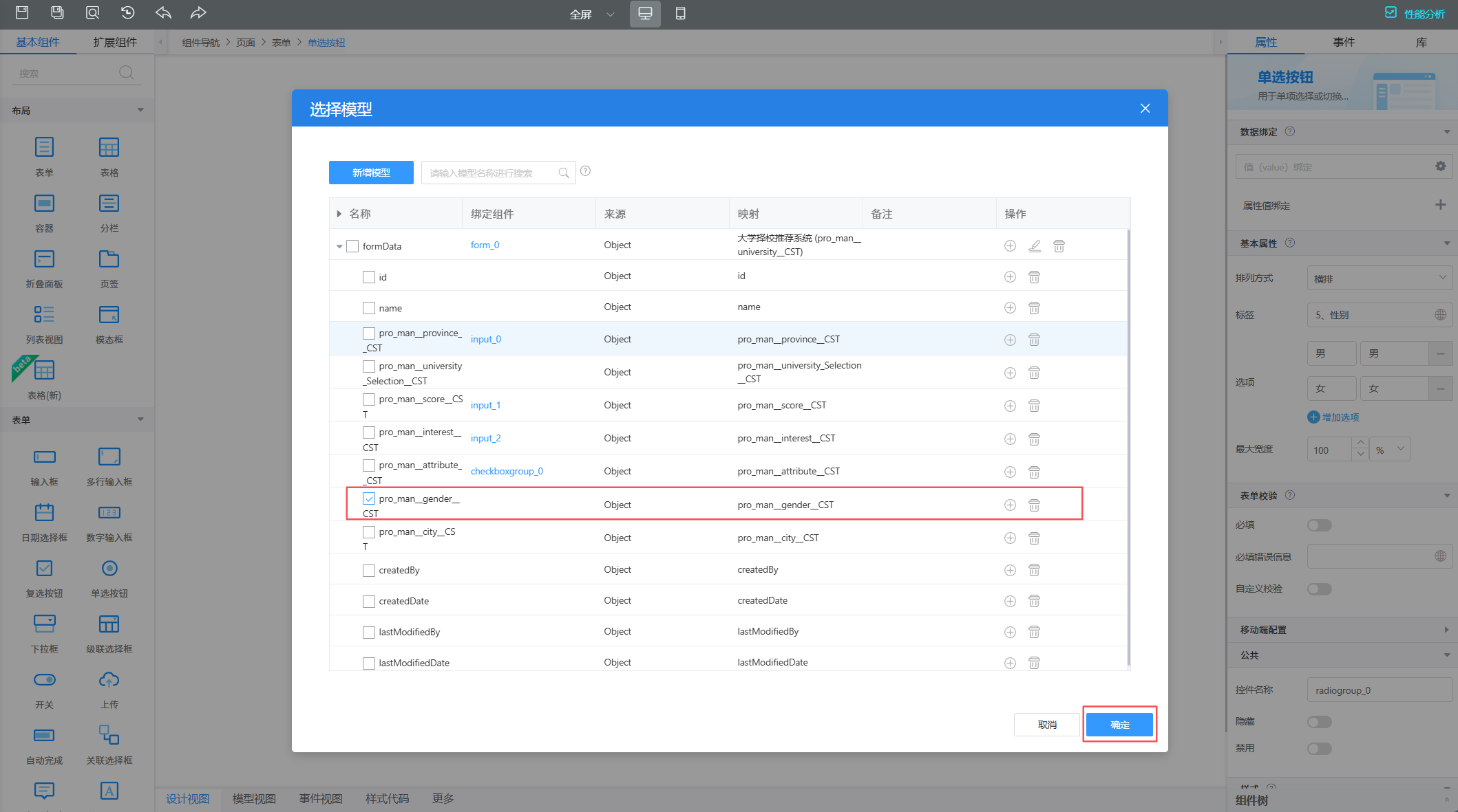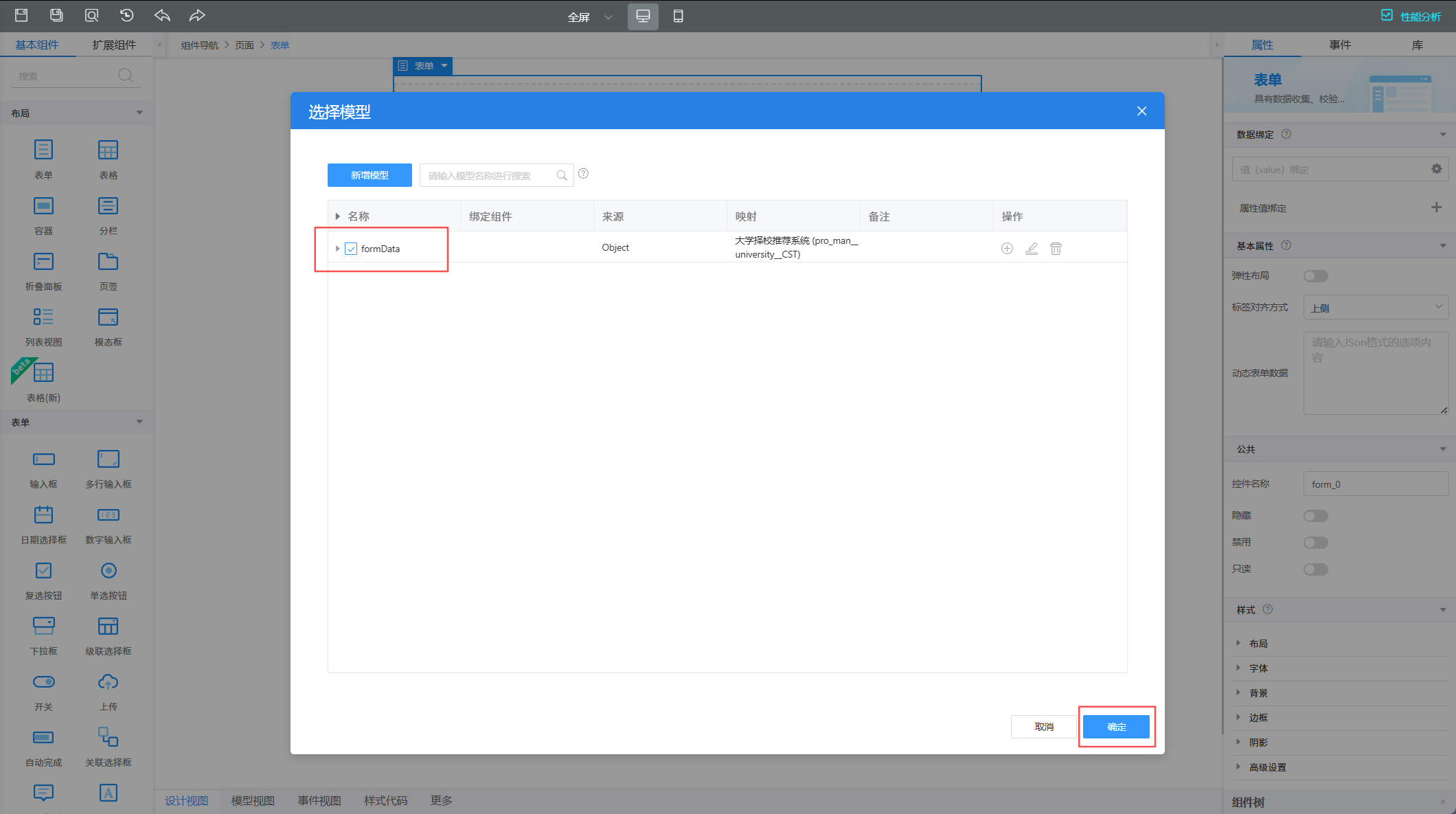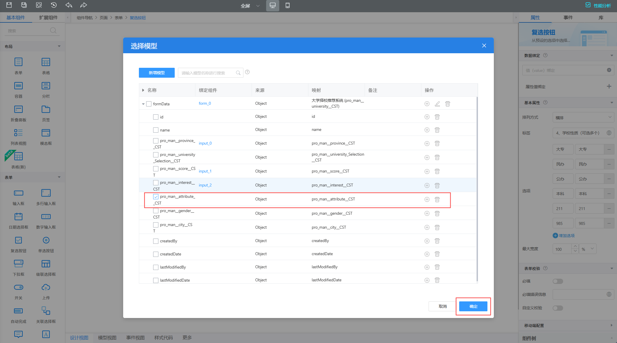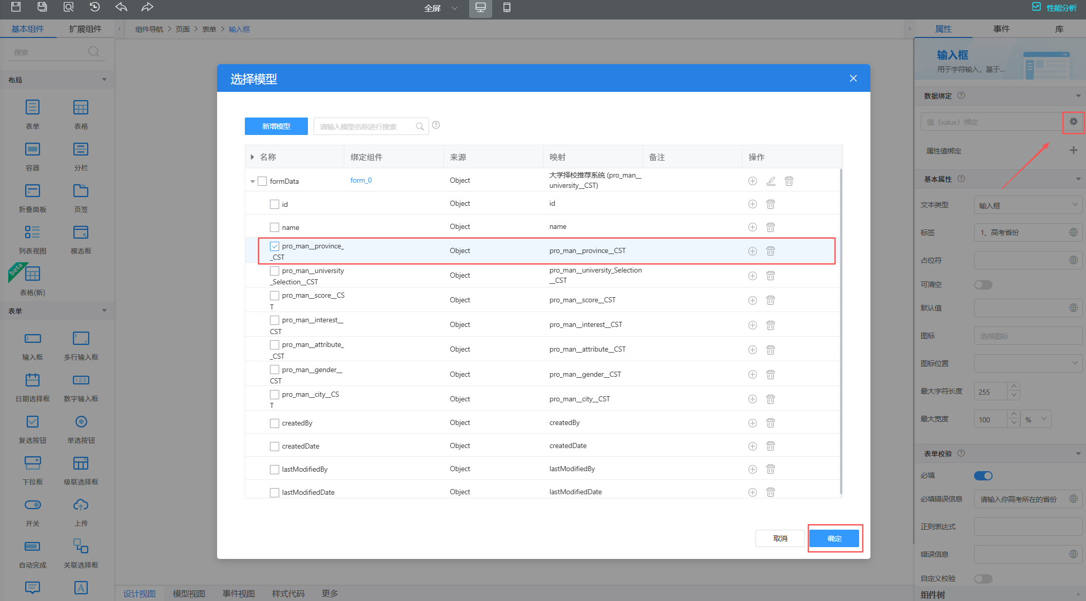 在右侧属性 > 数据绑定,点设置图标。在弹出的选择模型对话框中勾选,formData > xxxx__university_Selection__CST,然后单击确定。