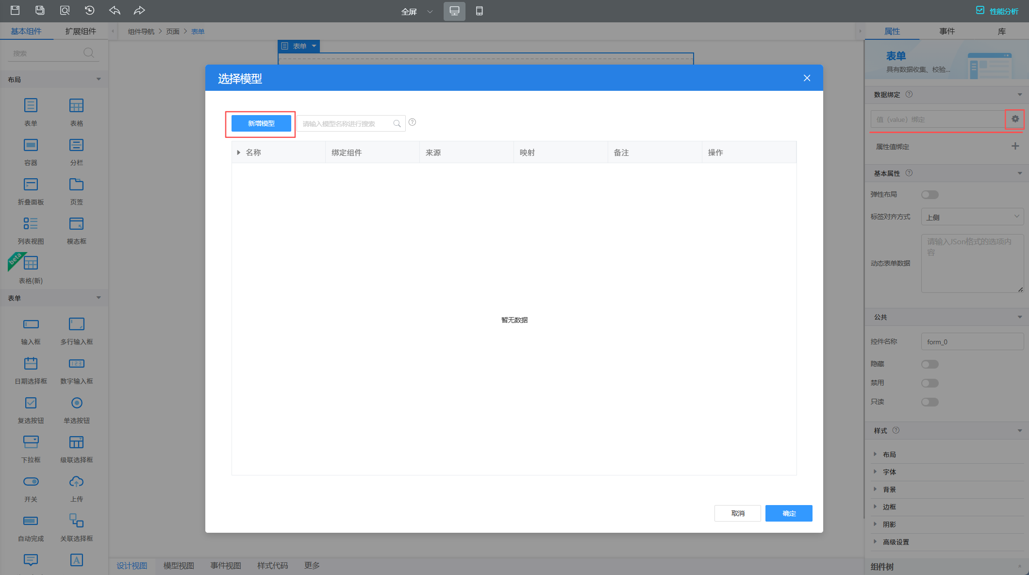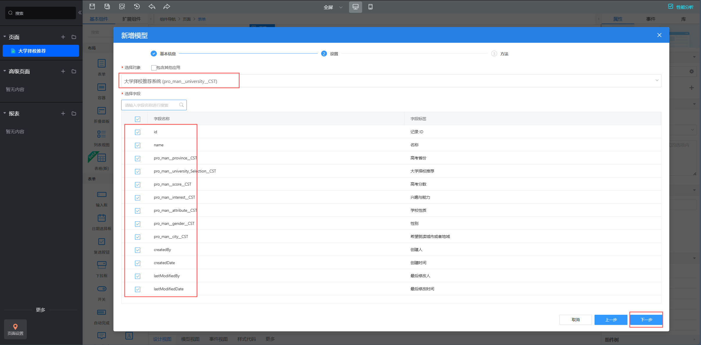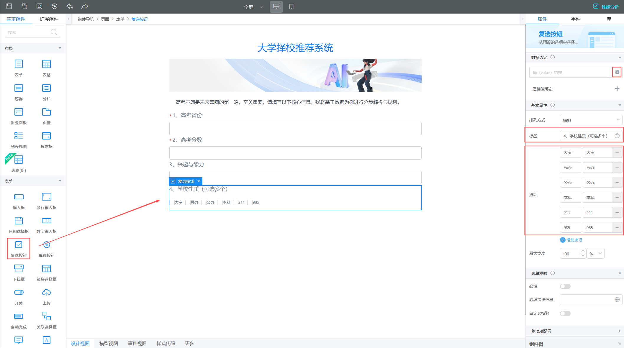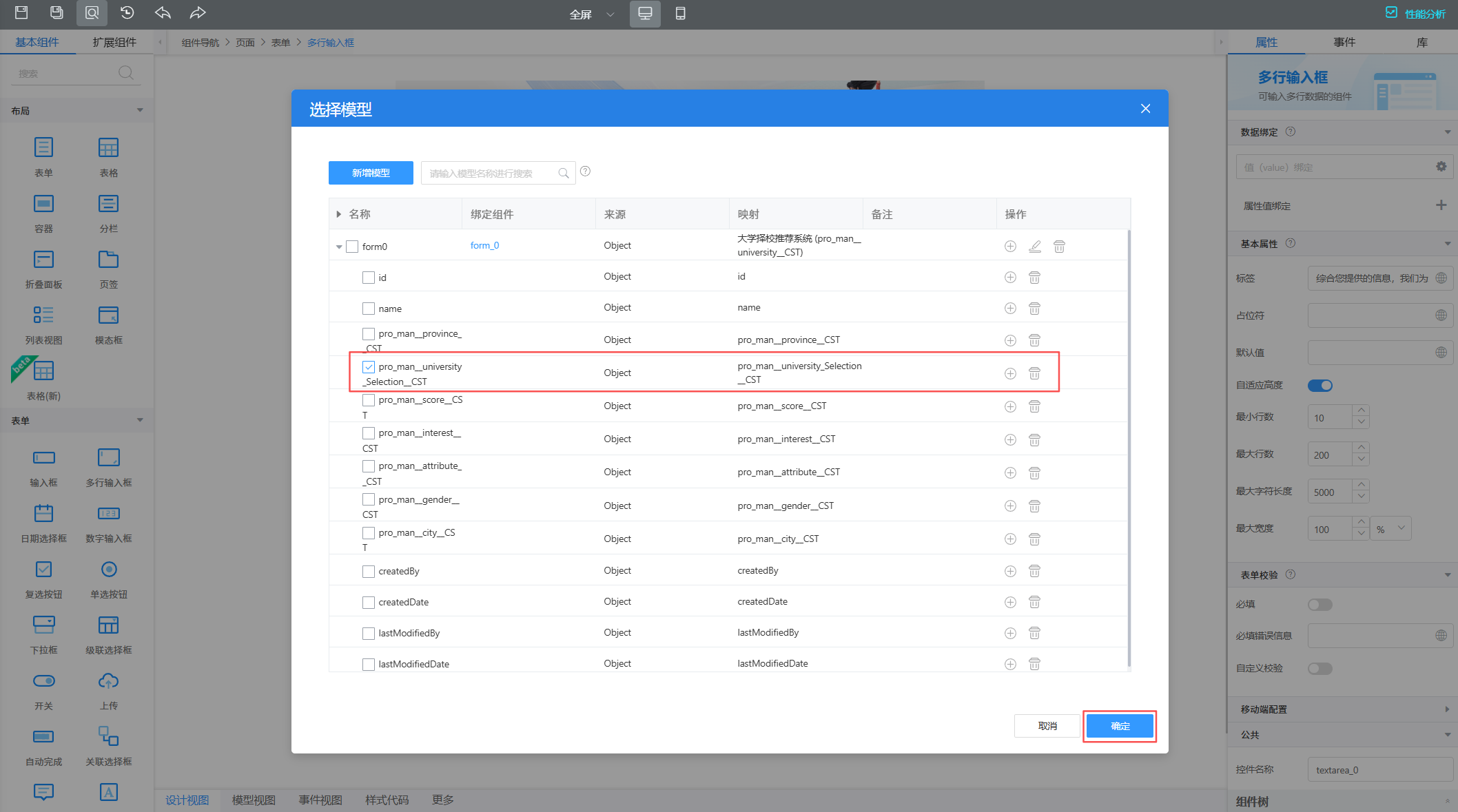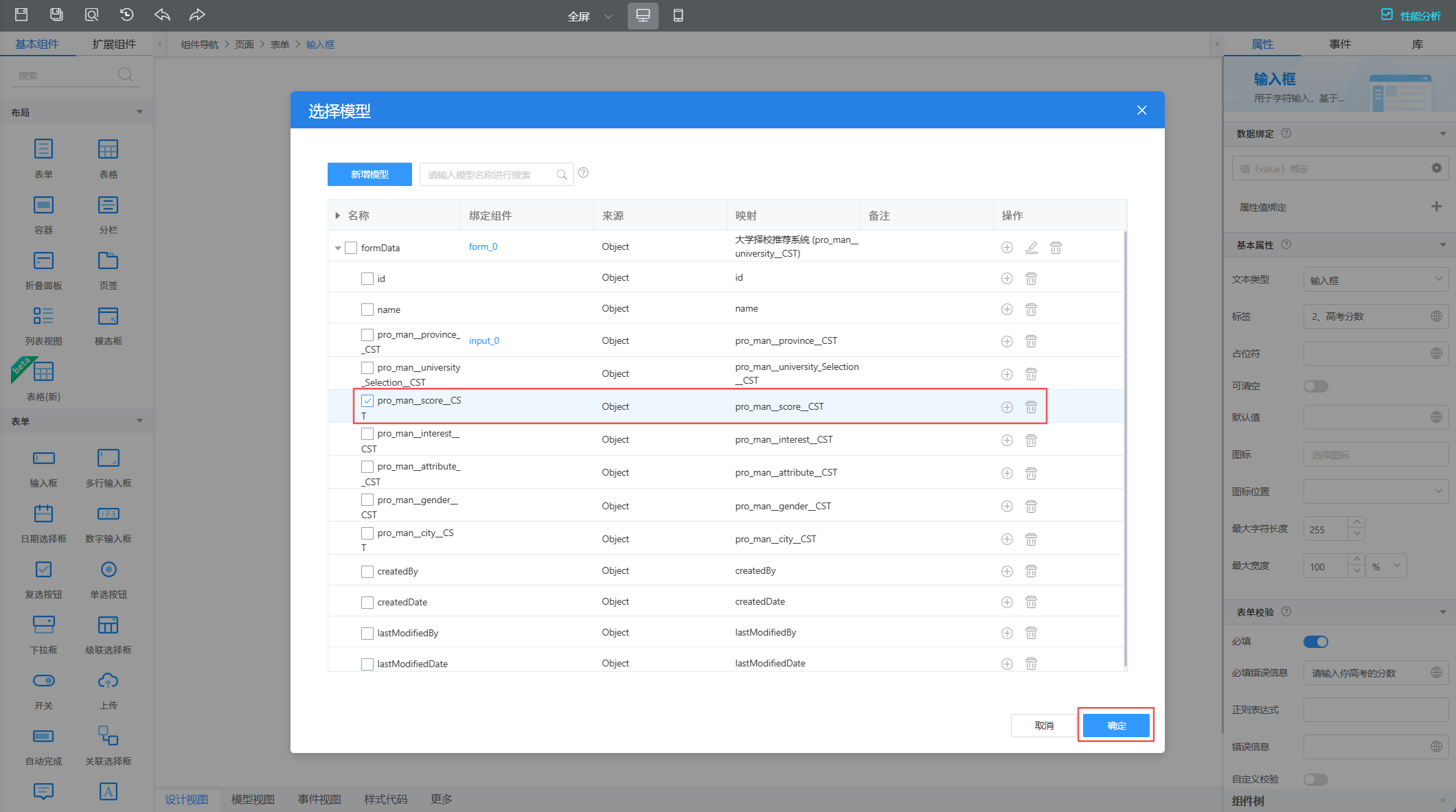 在右侧属性 > 数据绑定,点设置图标。在弹出的选择模型对话框中勾选,formData > xxxx__university_Selection__CST,然后单击确定。