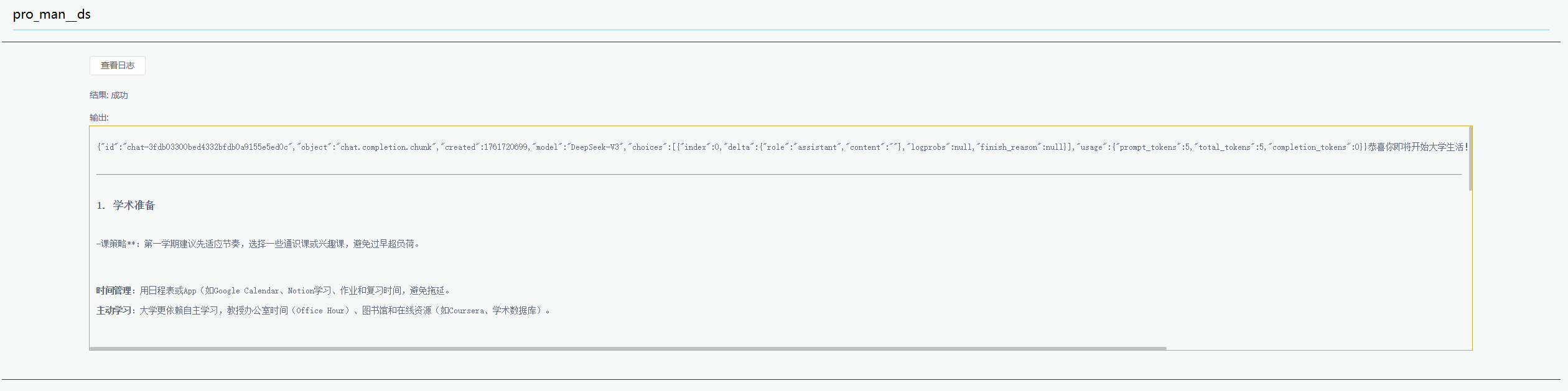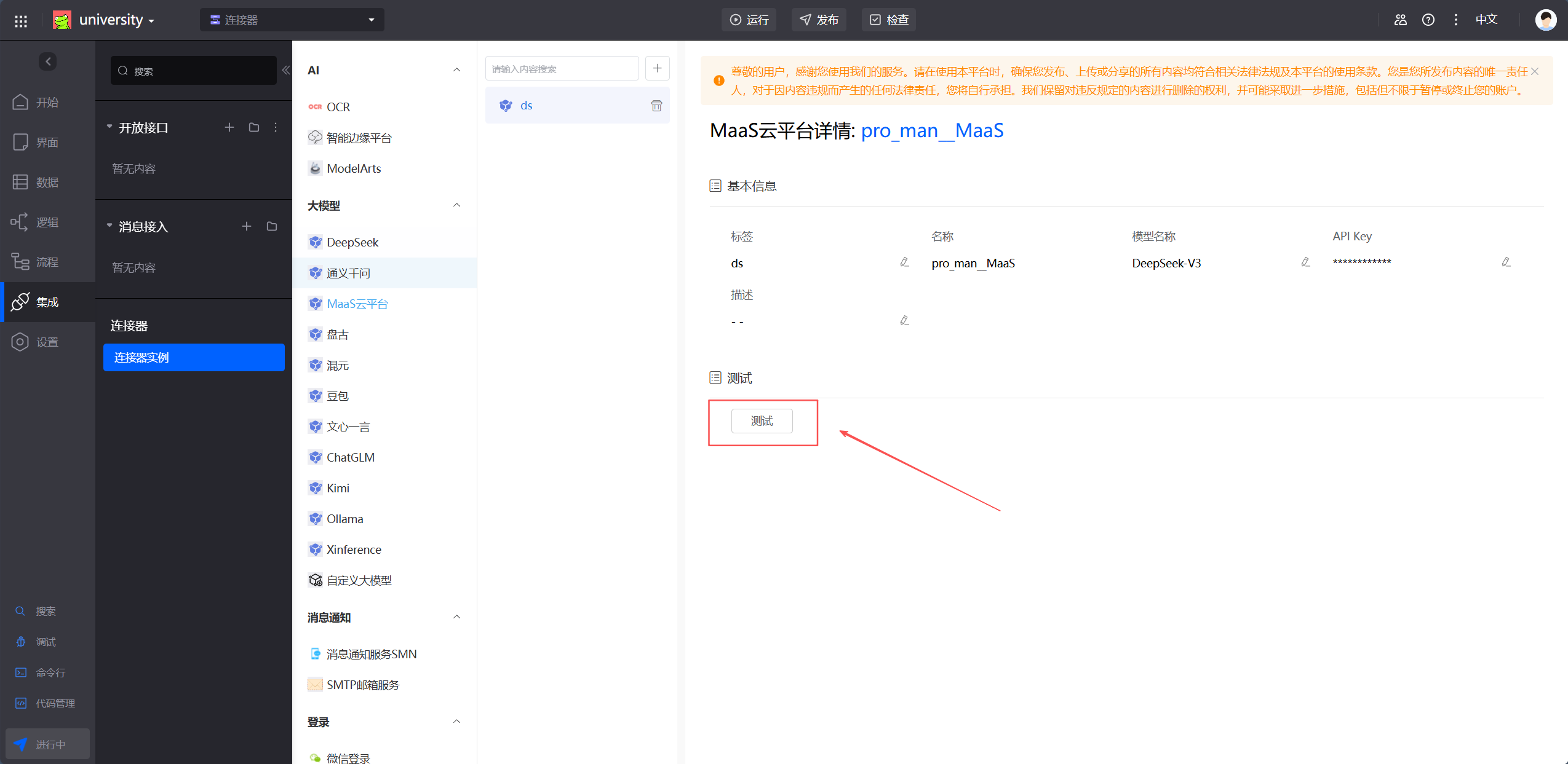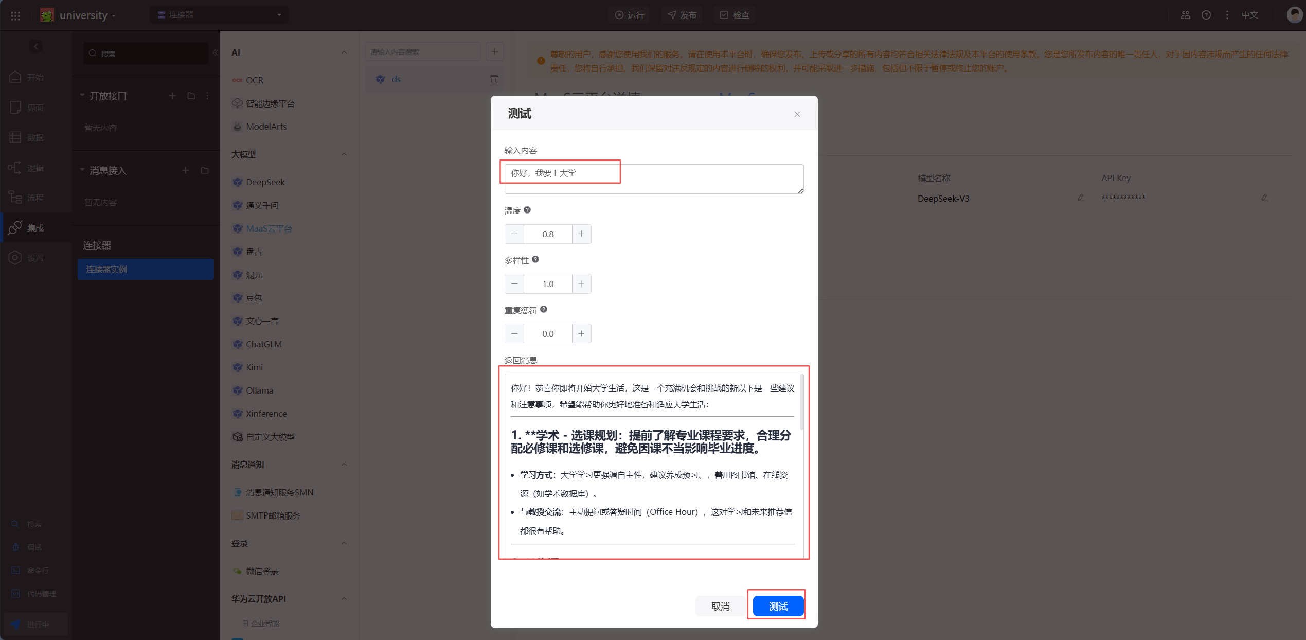 点击测试等待返回结果。如上图正常返回消息,说明MaaS云平台DeepSeek- V3大模型添加成功。