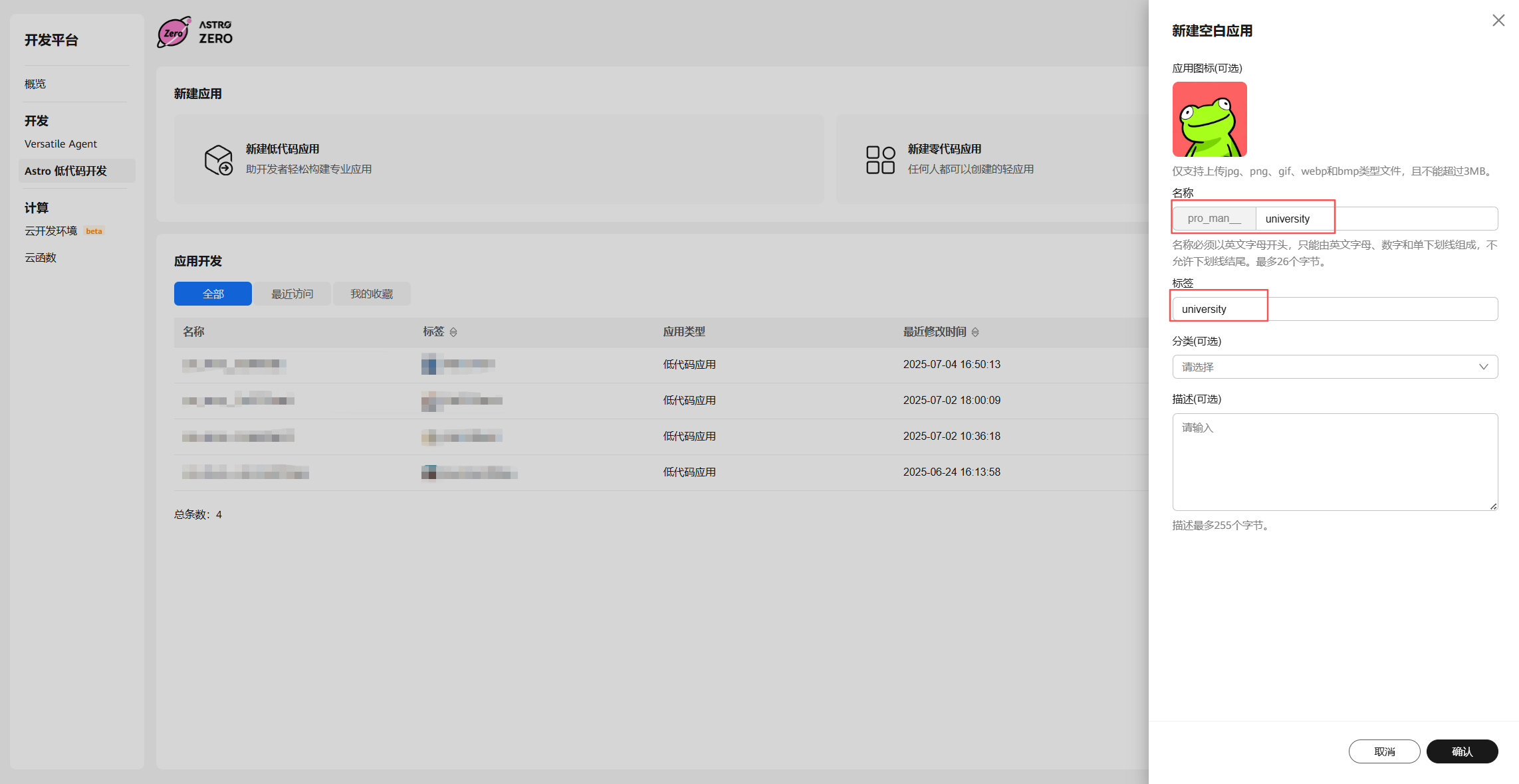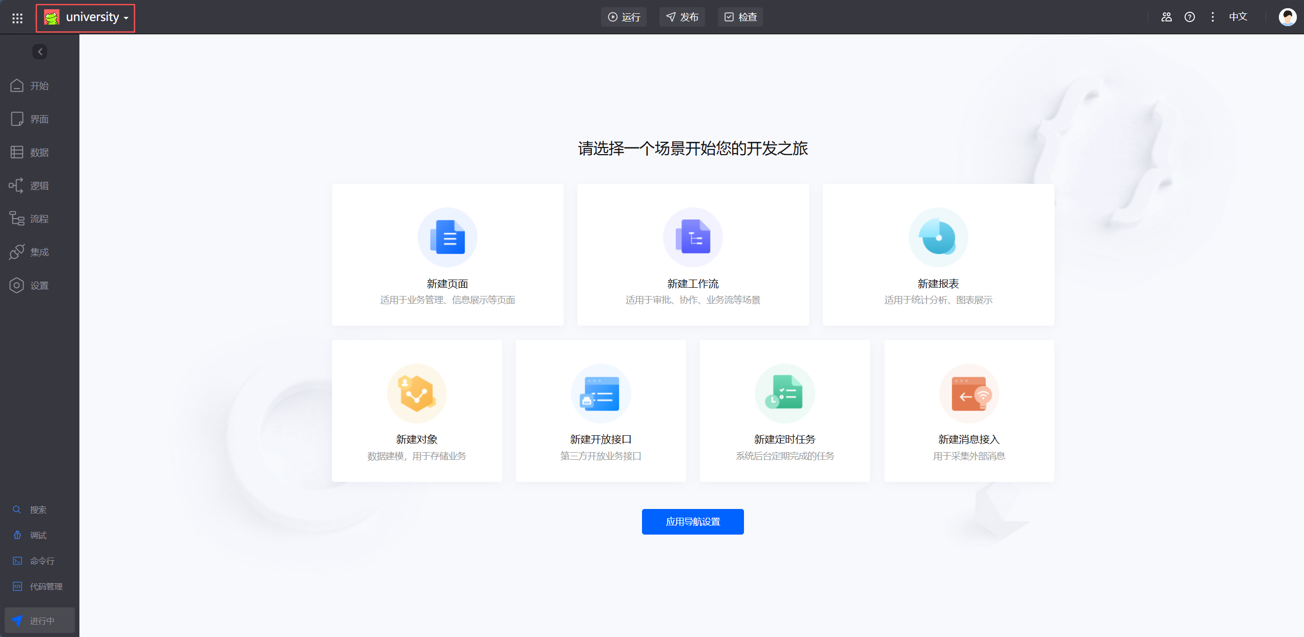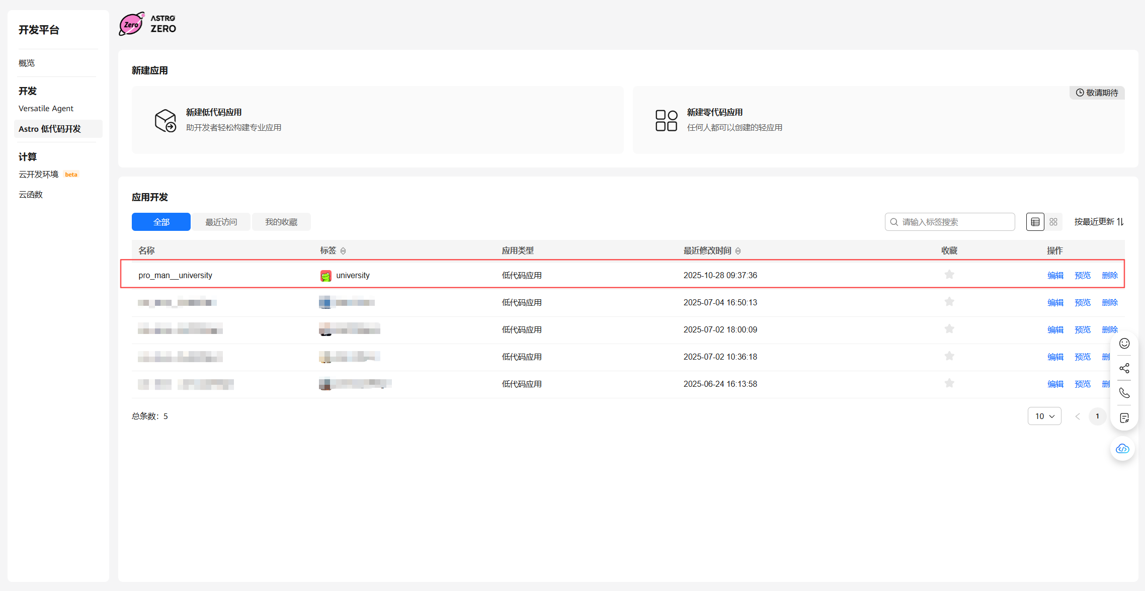 注:在点击确认后,在Astro低代码开发平台,应用开发列表中,新增一条刚才创建的名称为xxxx_university的应用。