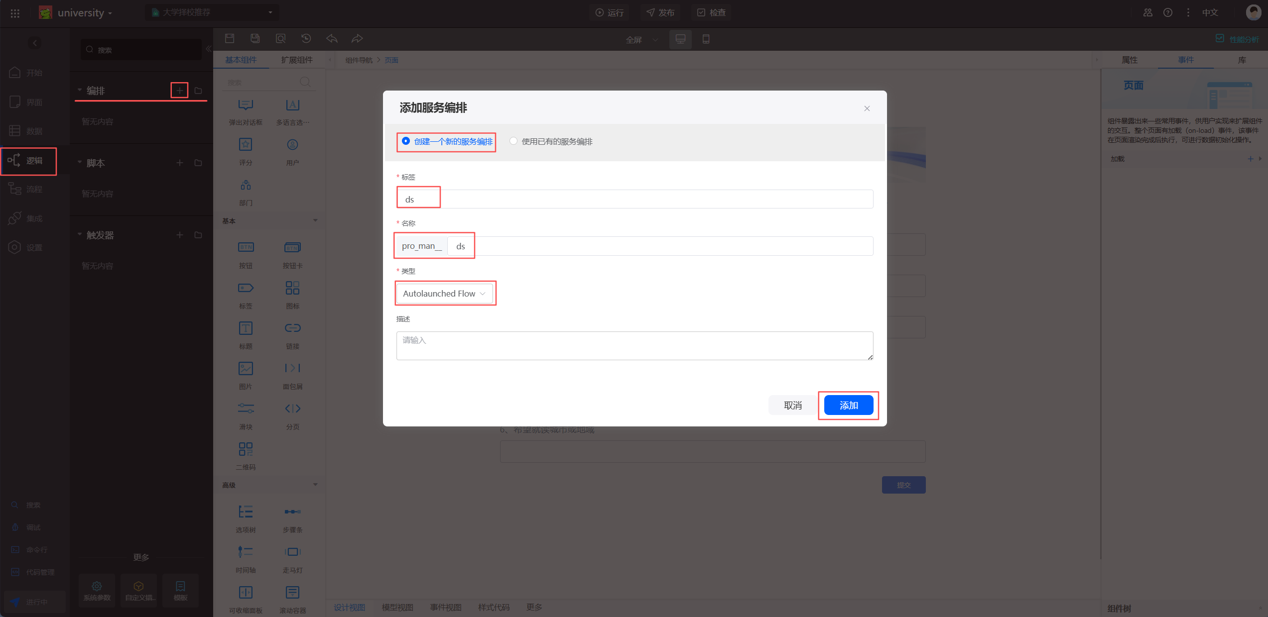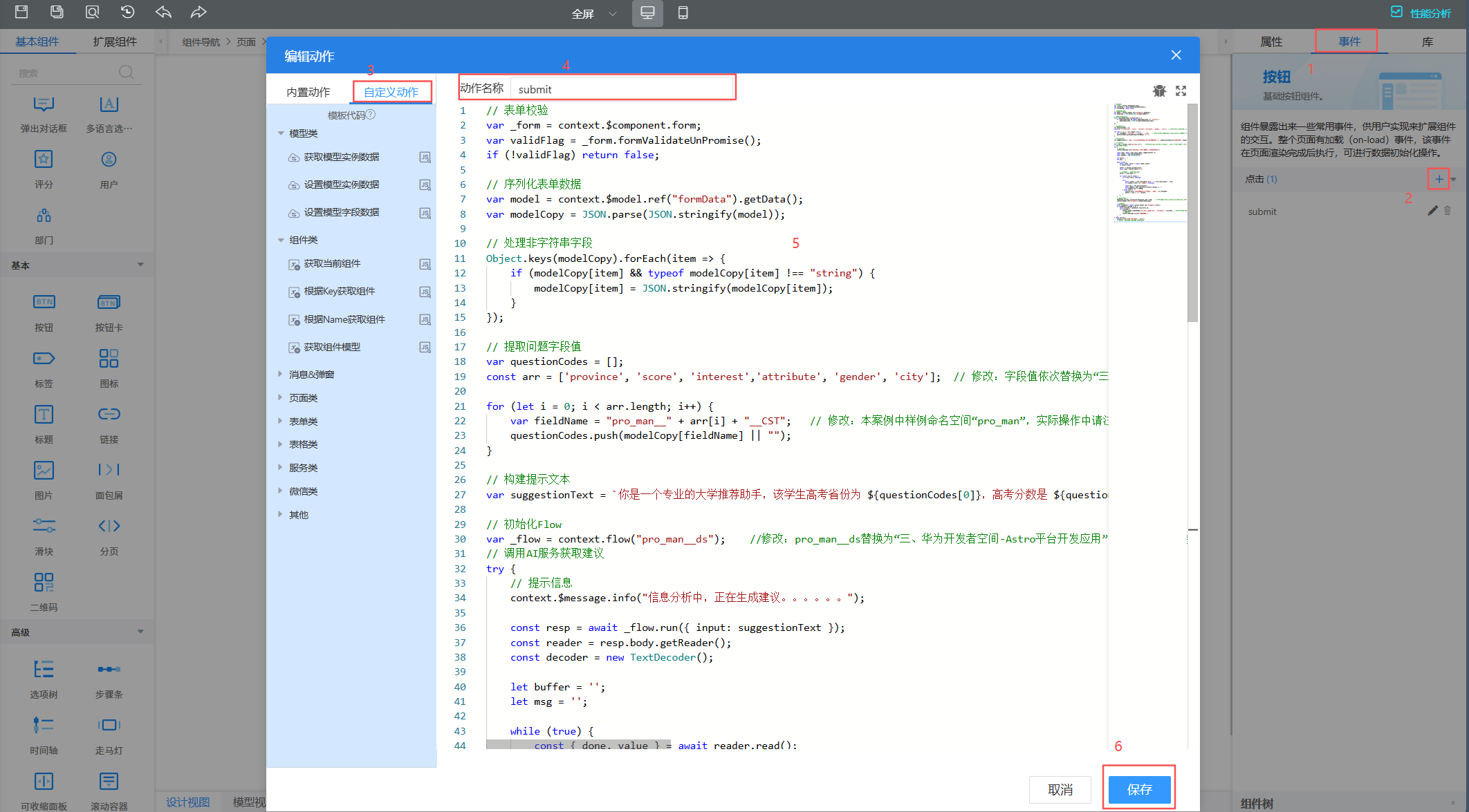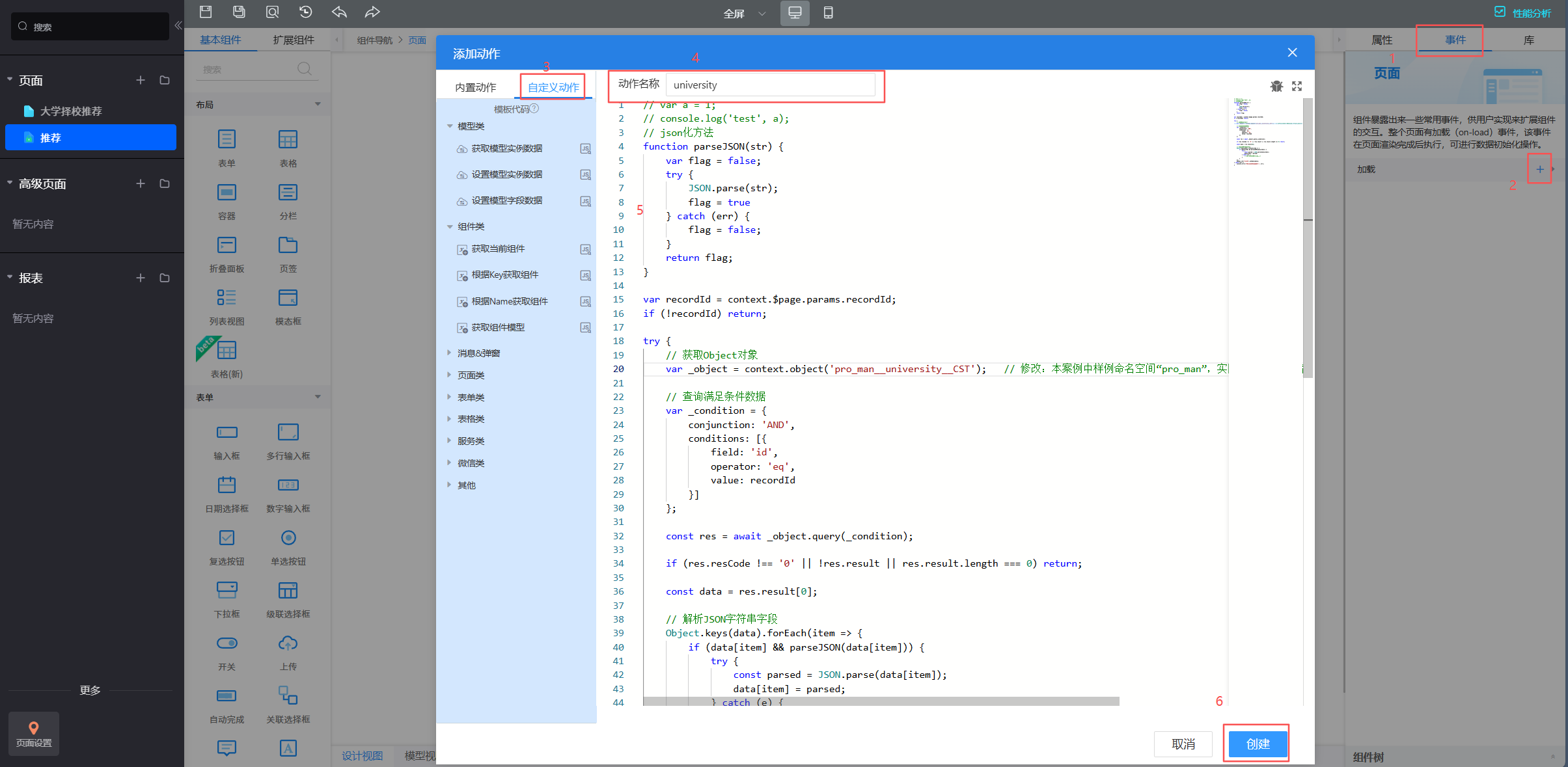 切换到事件标签,单击“+”,在添加动作弹窗中,页签选择自定义动作,在动作名称一栏设置JS代码名称:university,其下方的代码区域中输入以下代码,然后点创建/保存。