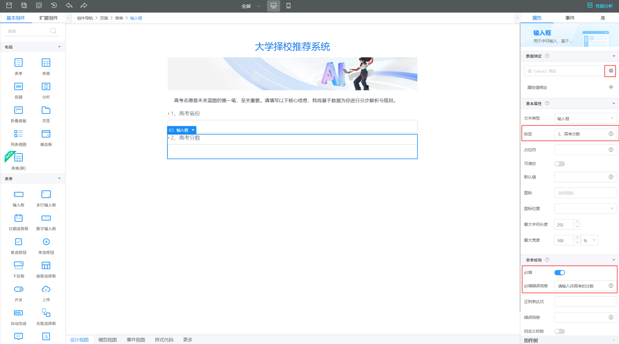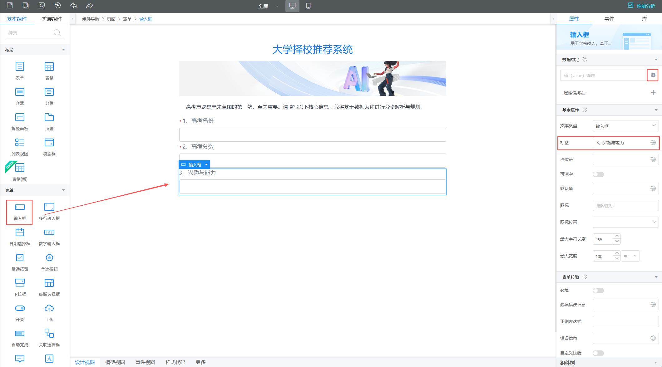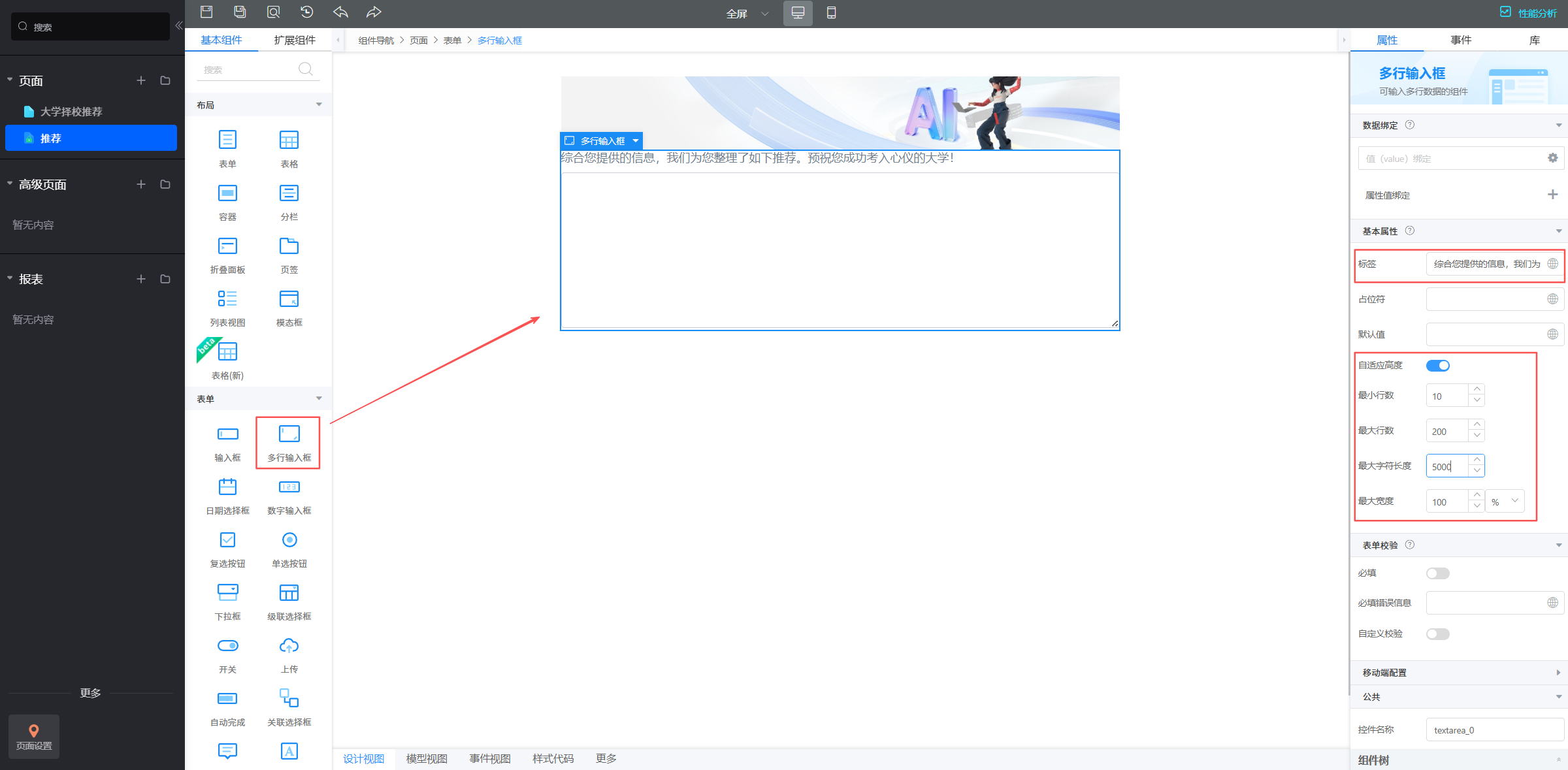 选中表单中的多行输入框组件,在右侧属性 > 基本属性,设置其基本属性: