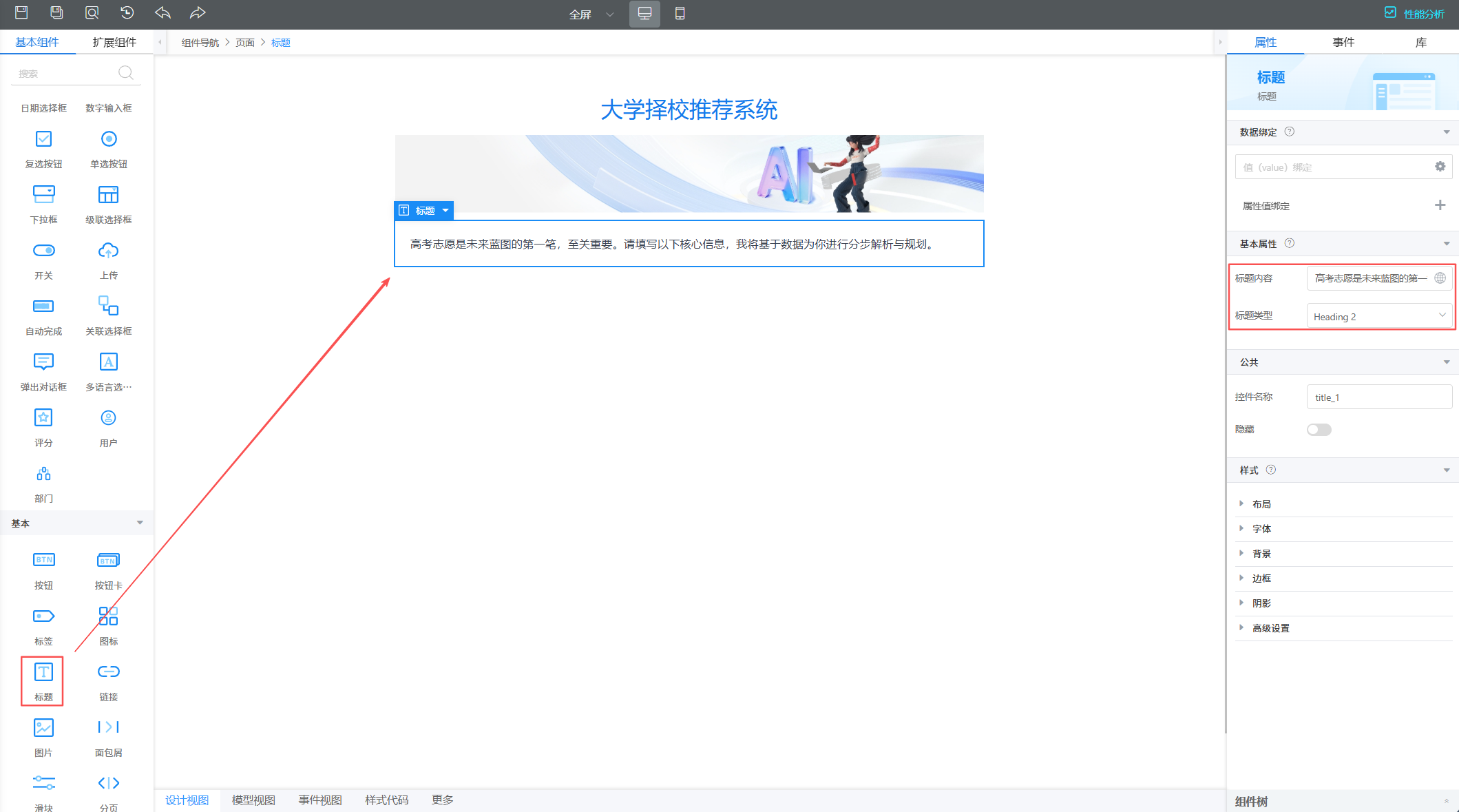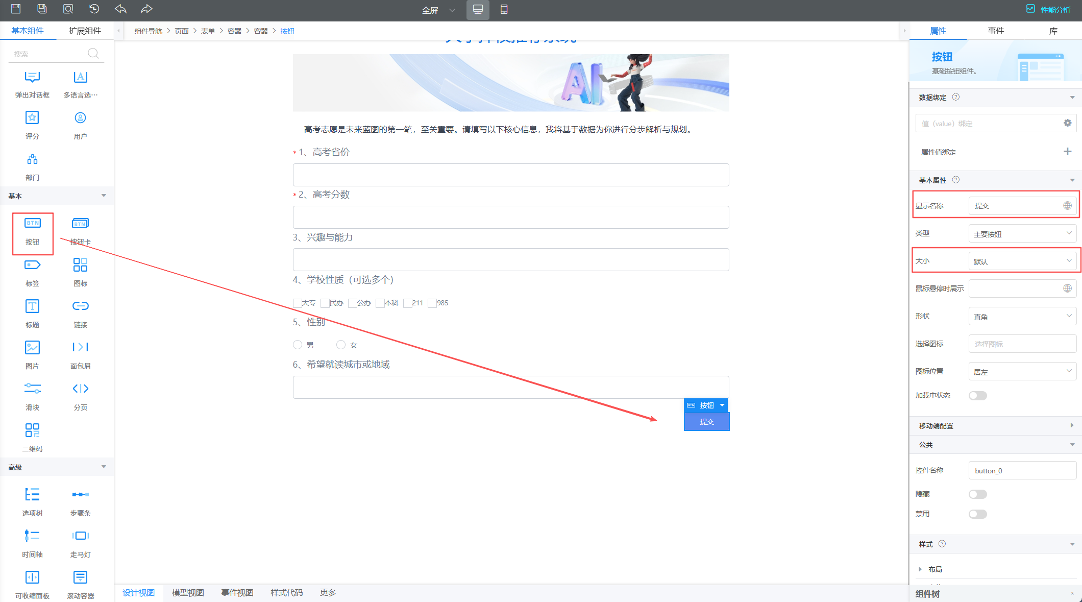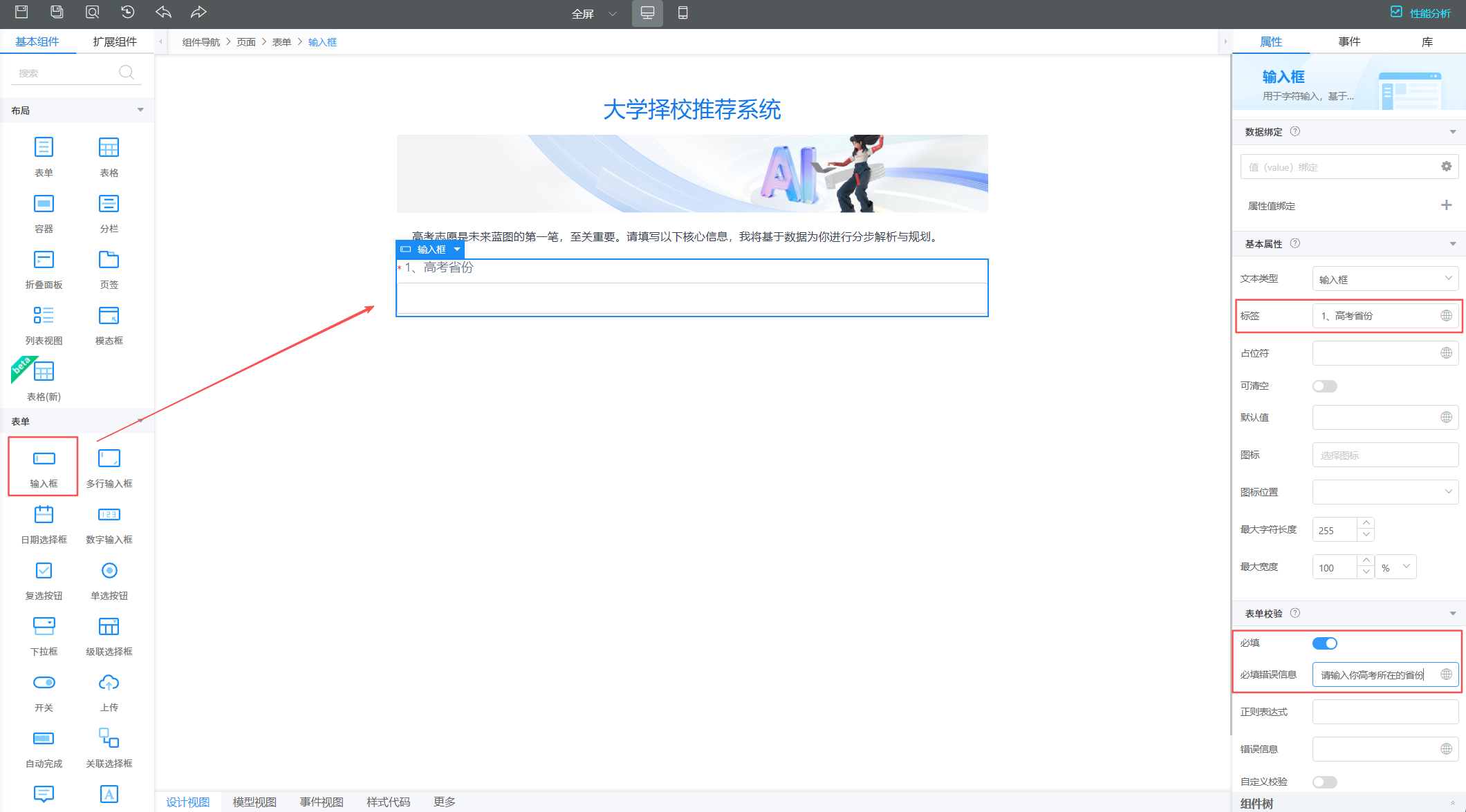 选中表单中的多行输入框组件,在右侧属性 > 基本属性,设置其基本属性:
