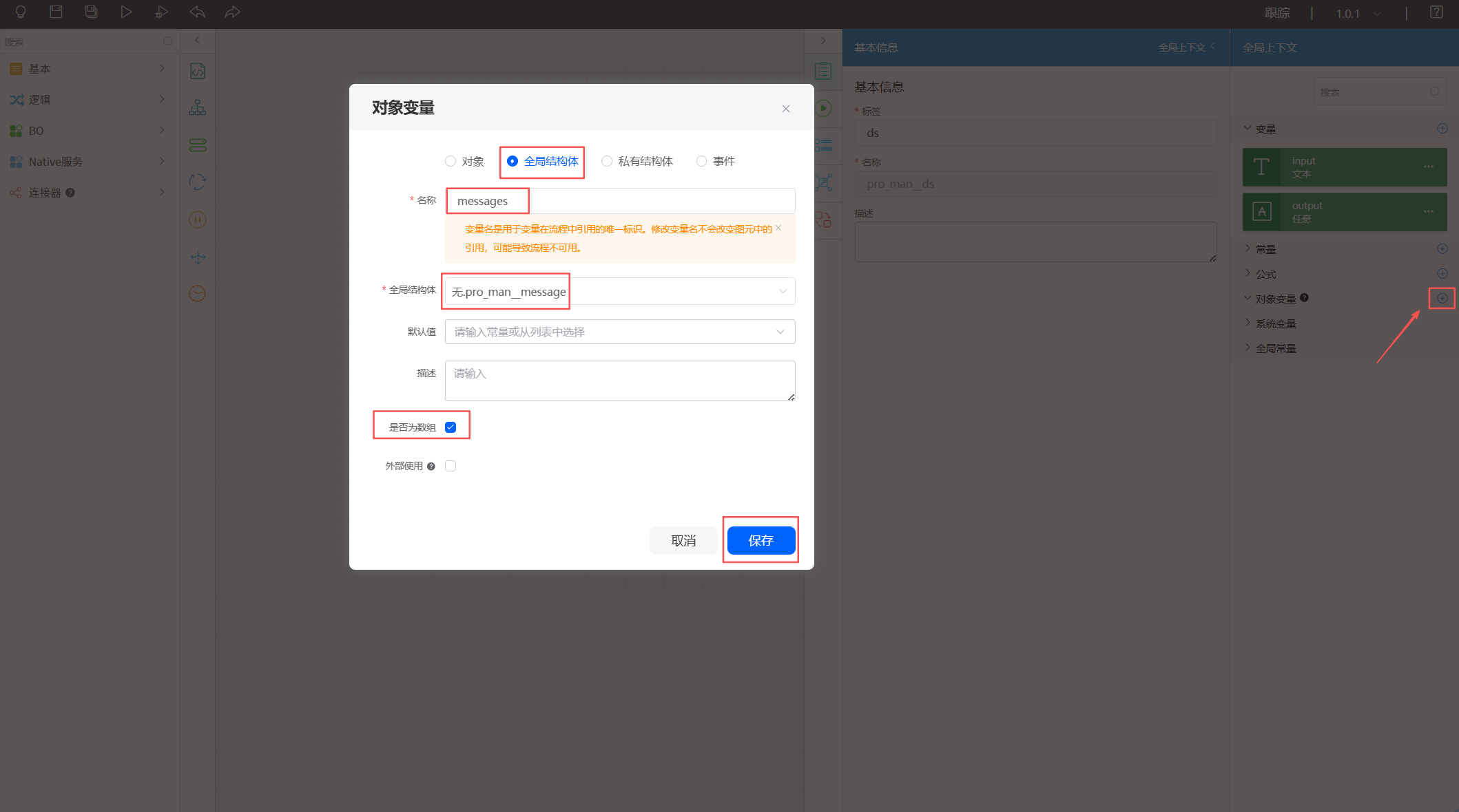 message,将之前创建的对象变量messages拖拽到源; - 输出参数,点新增行,源选择