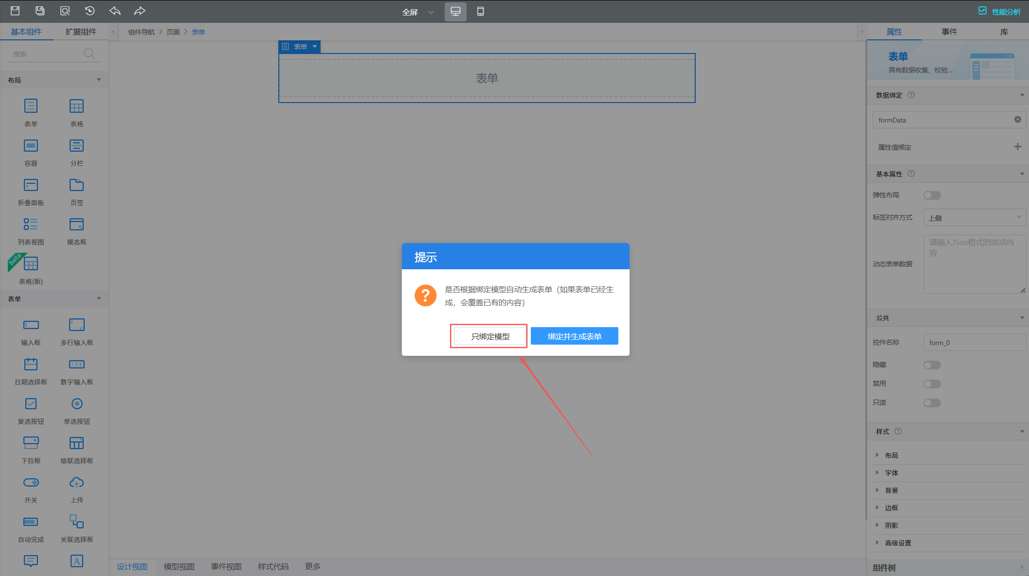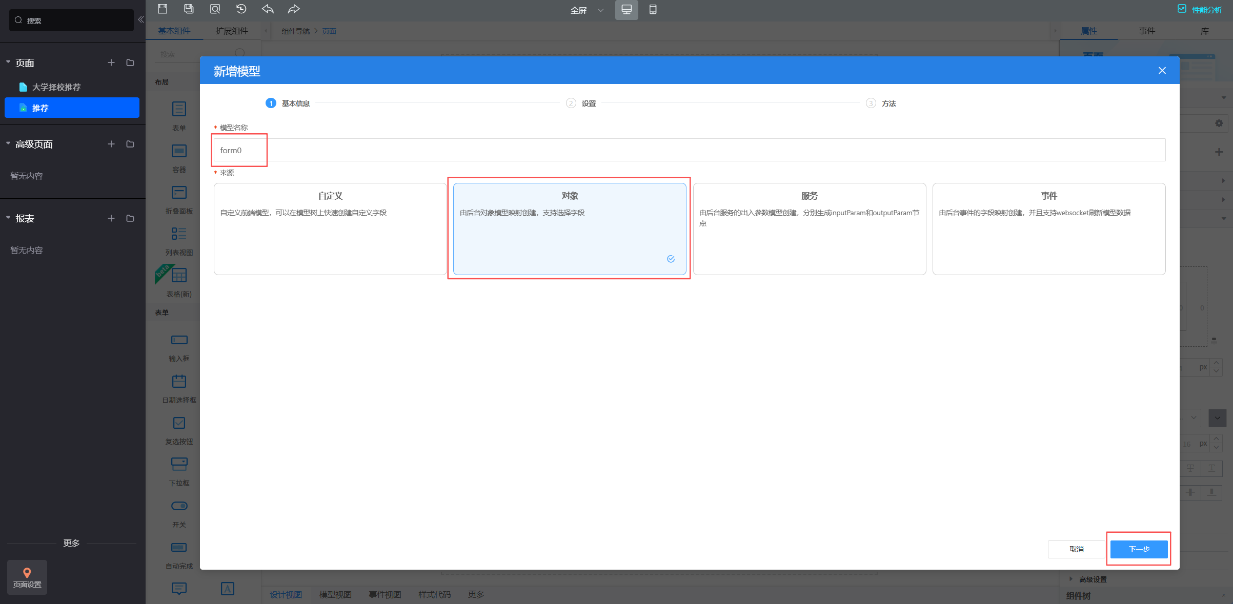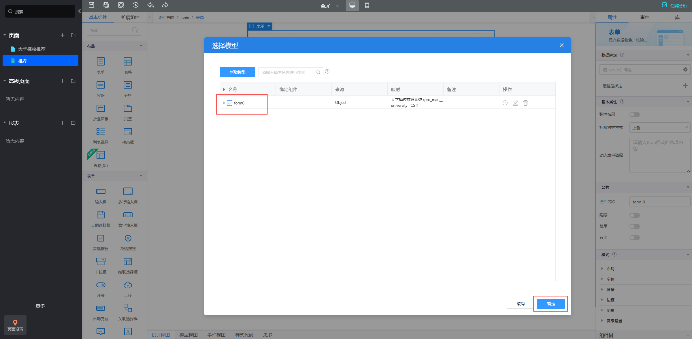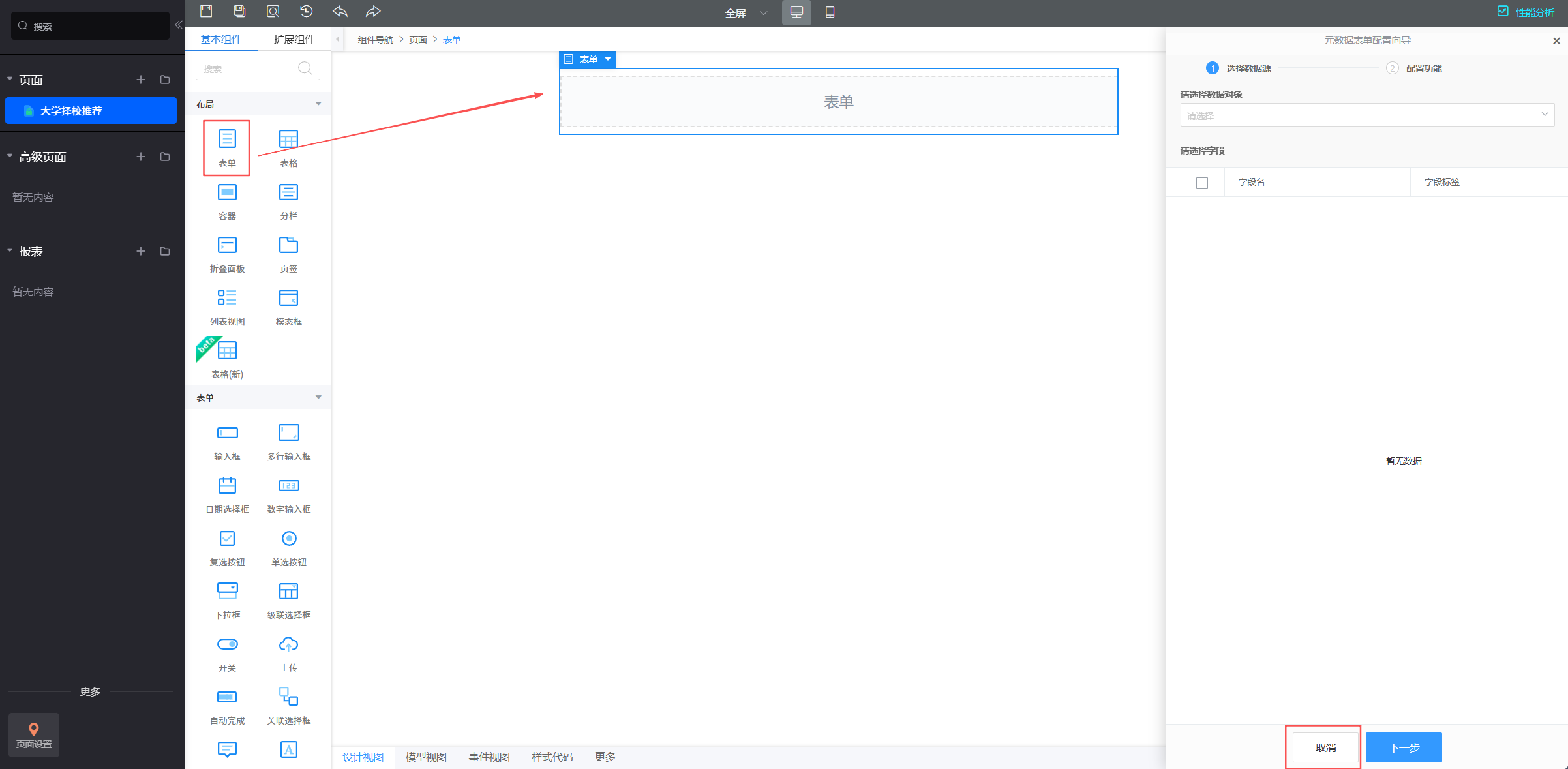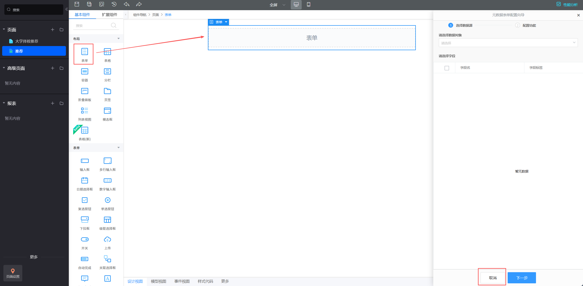 左侧选中页面 > 推荐,在基本组件 > 布局中将组件表单拖拽到页面中间。取消右侧的元数据表单配置向导。
