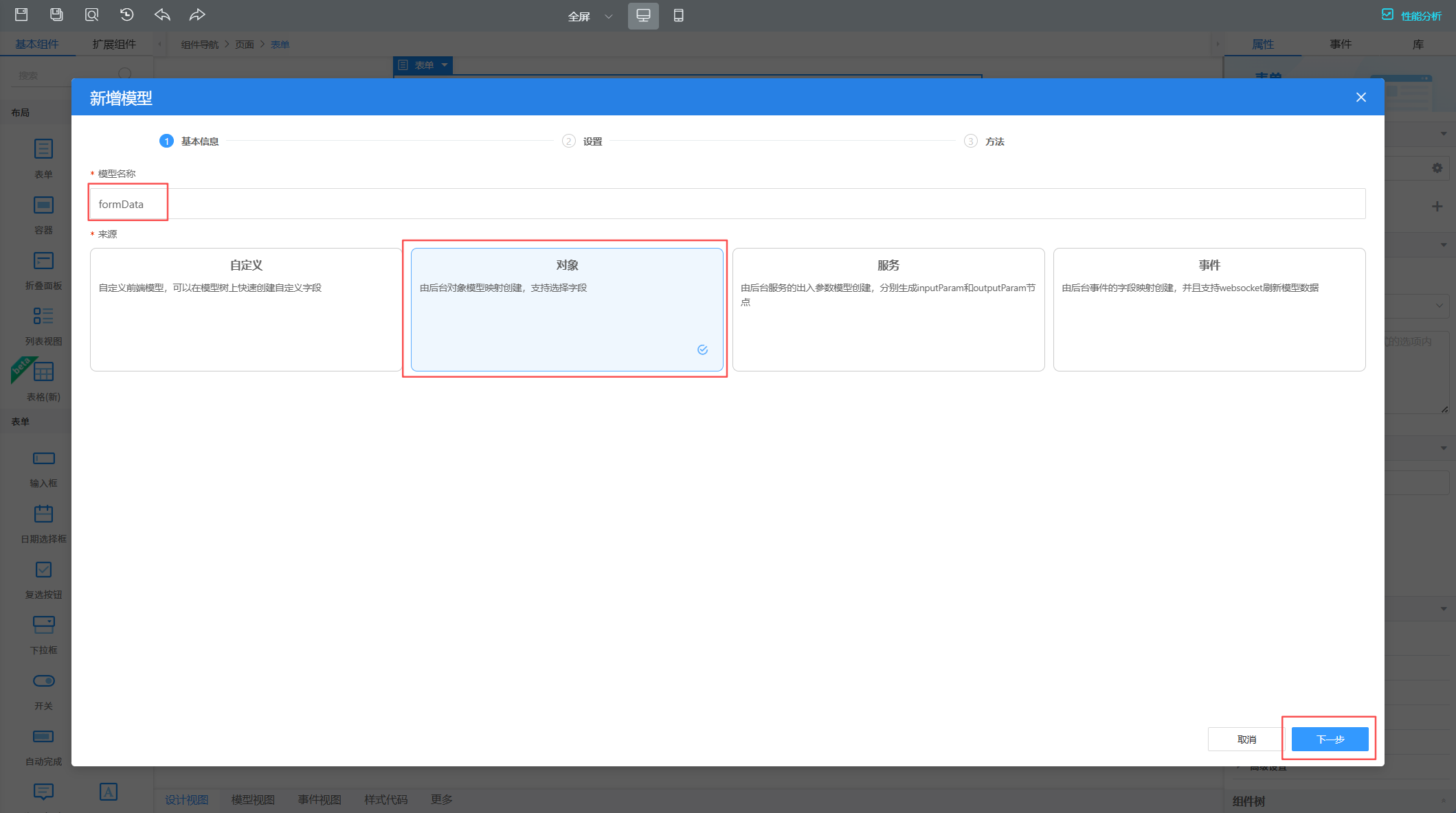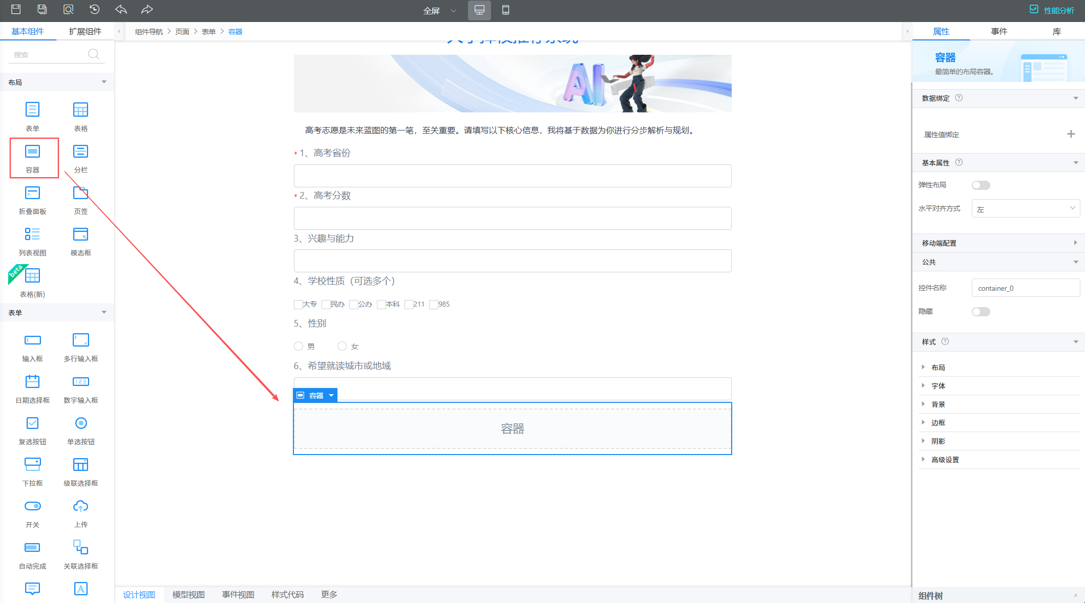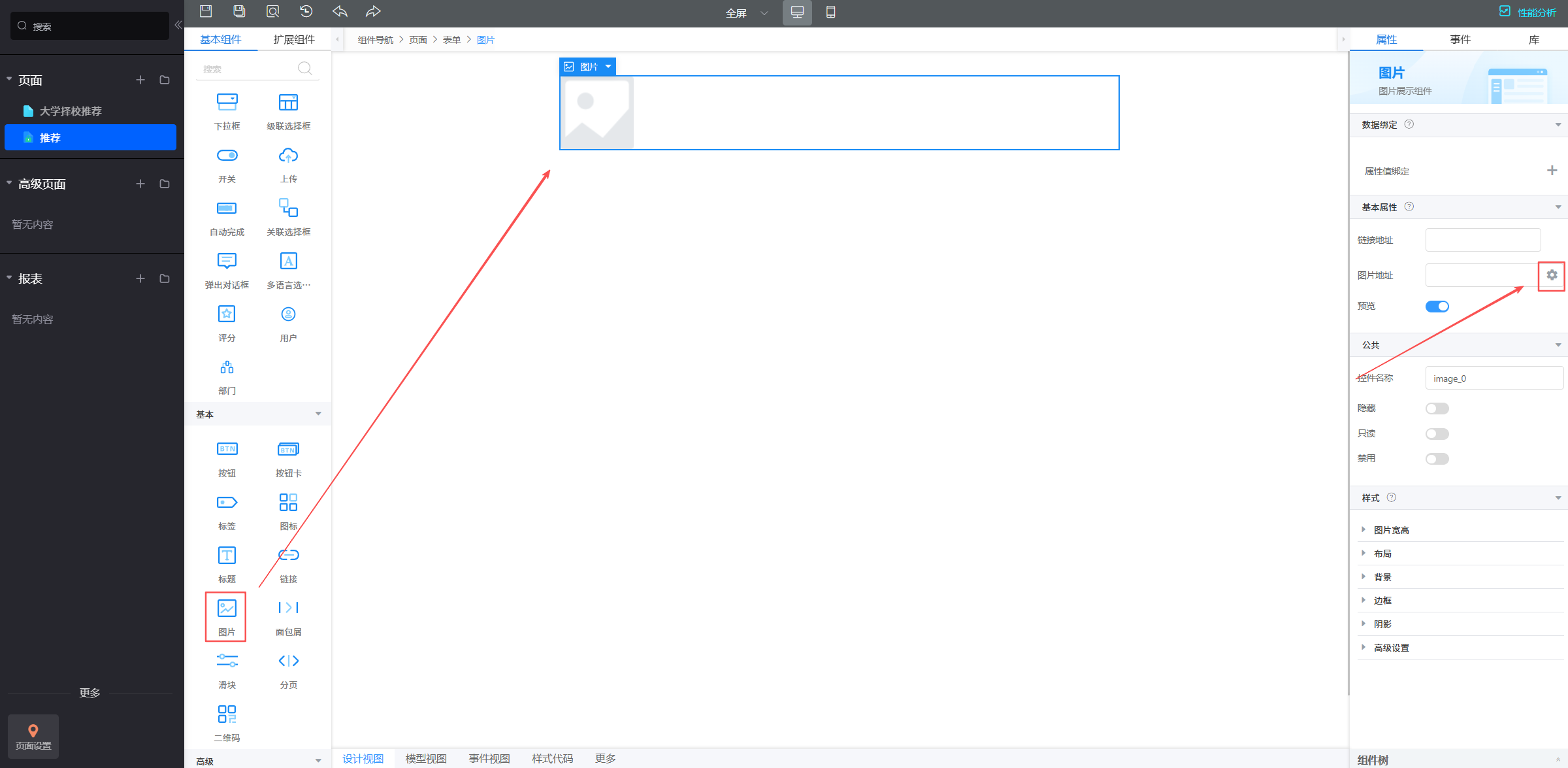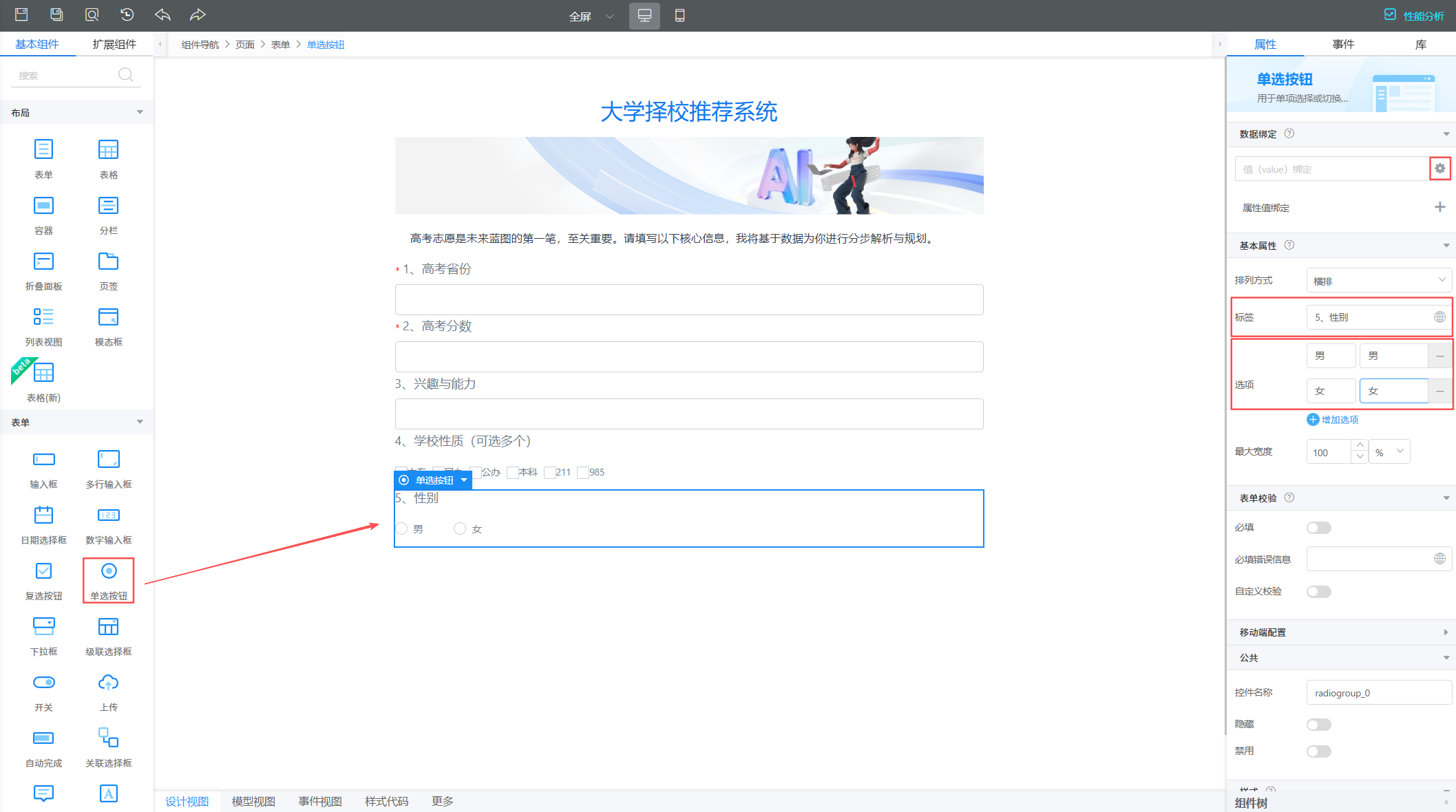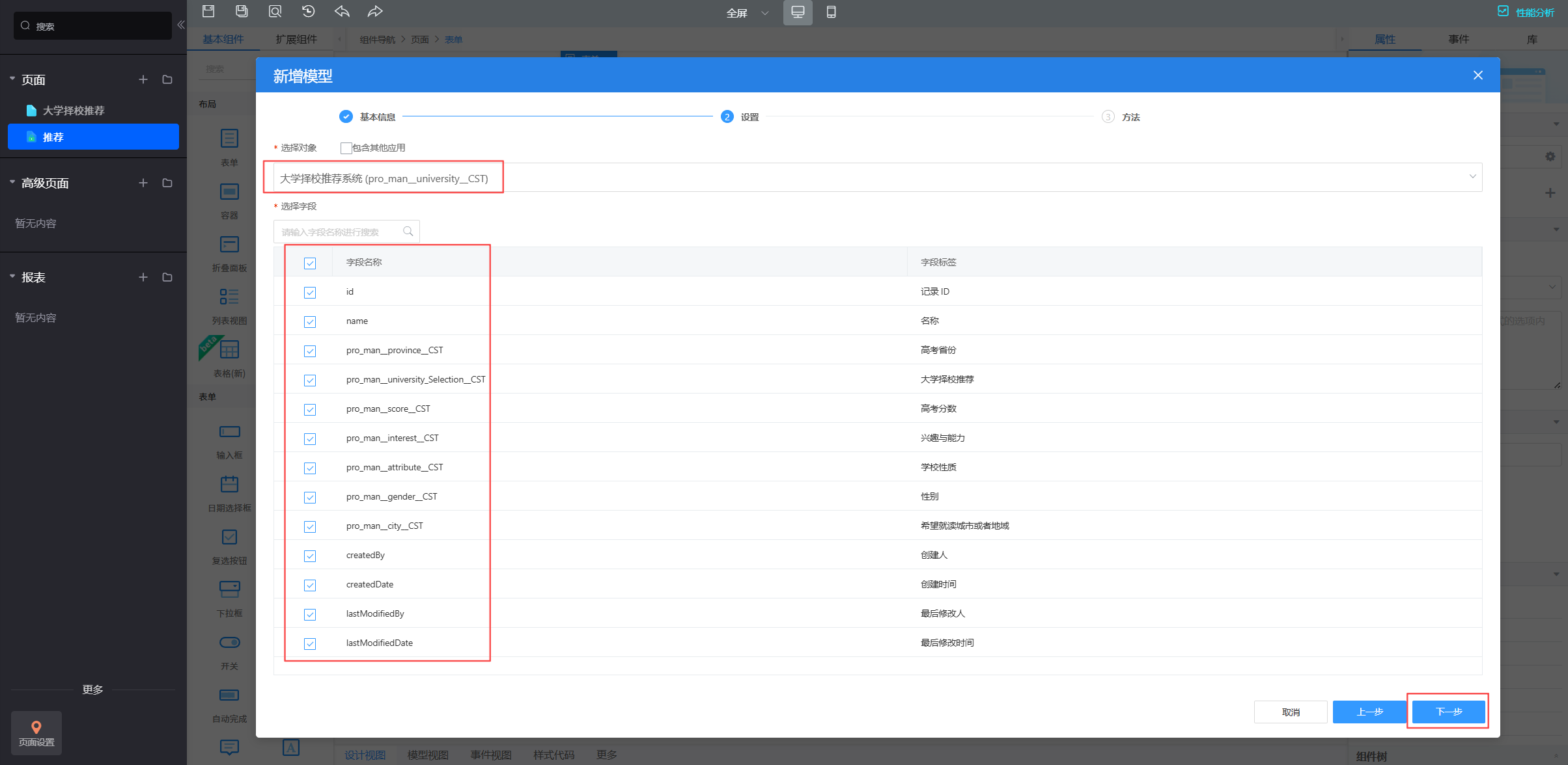 左侧选中页面 > 推荐,在基本组件 > 布局中将组件表单拖拽到页面中间。取消右侧的元数据表单配置向导。