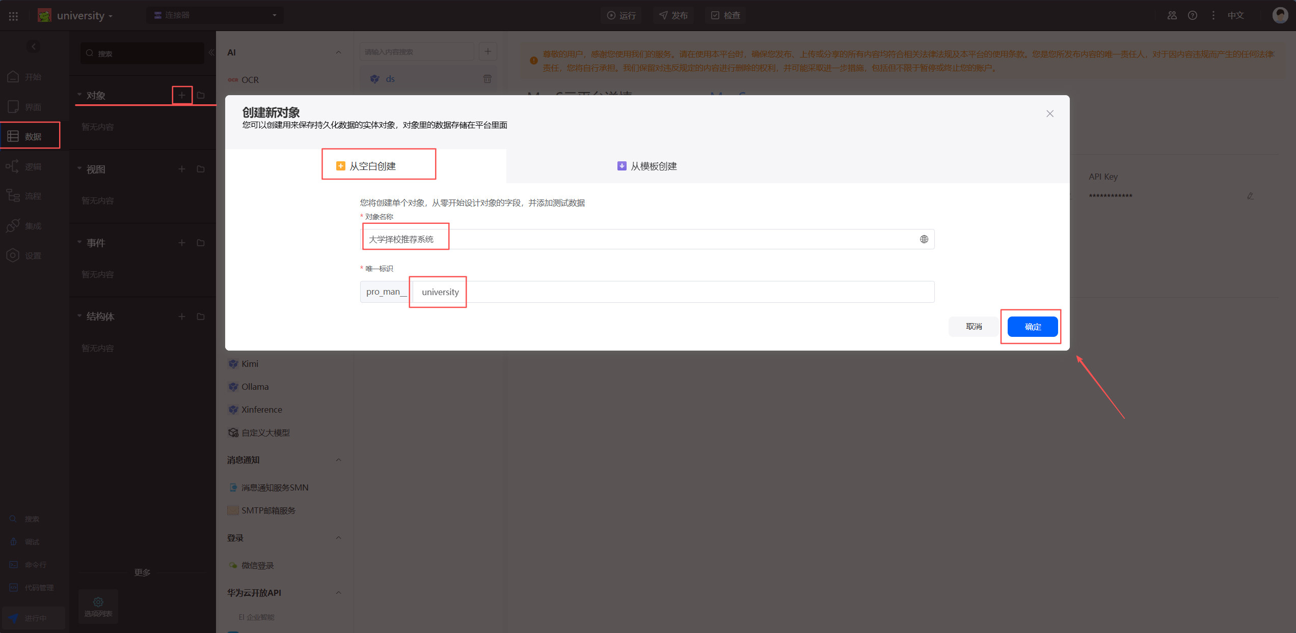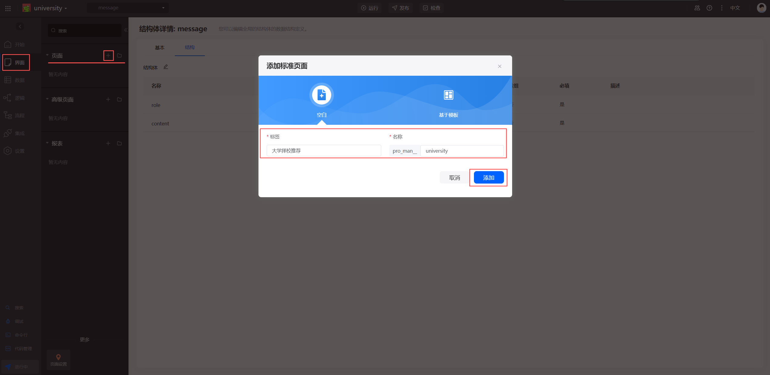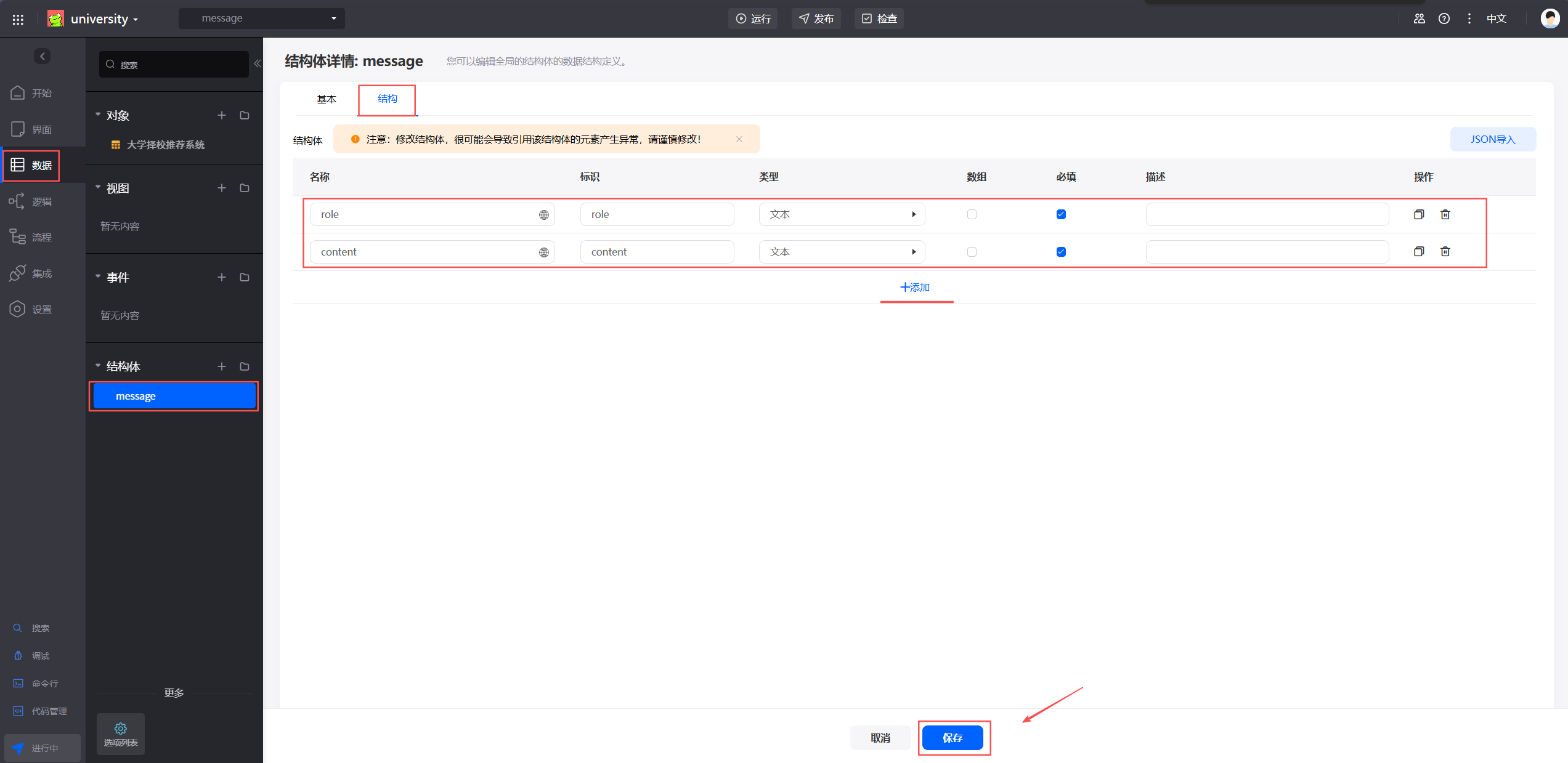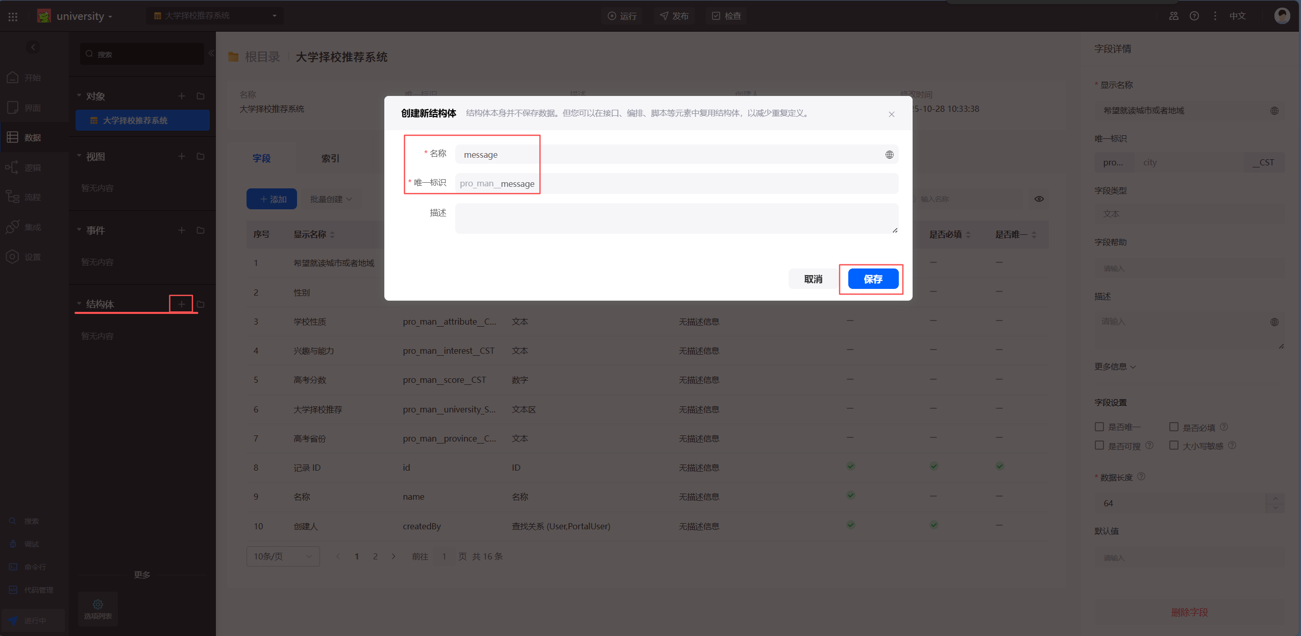 - 点击右下角确认按钮,进入刚才创建的名为university的Astro轻应用配置页面。