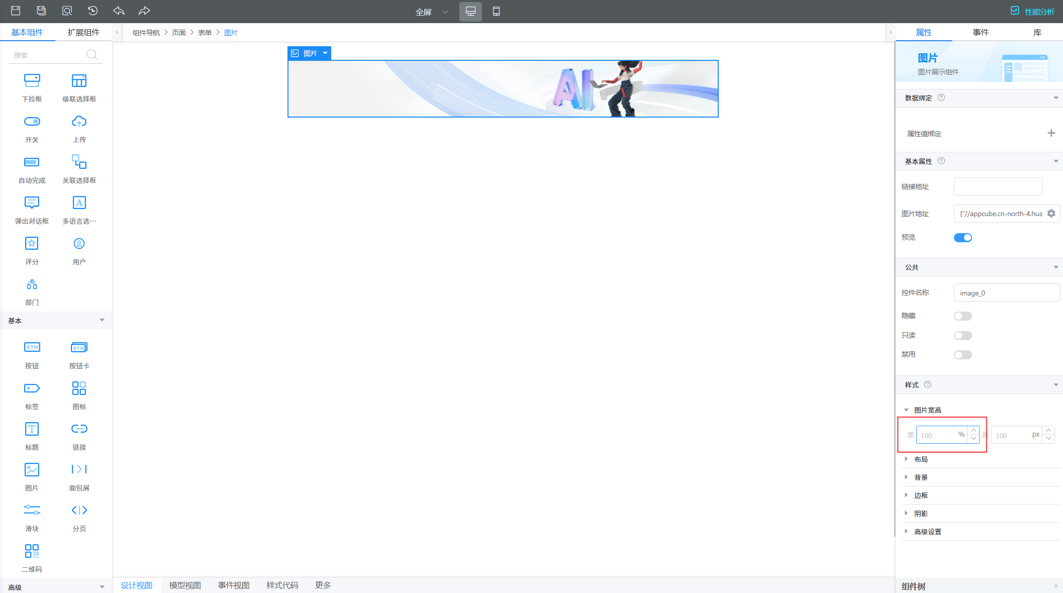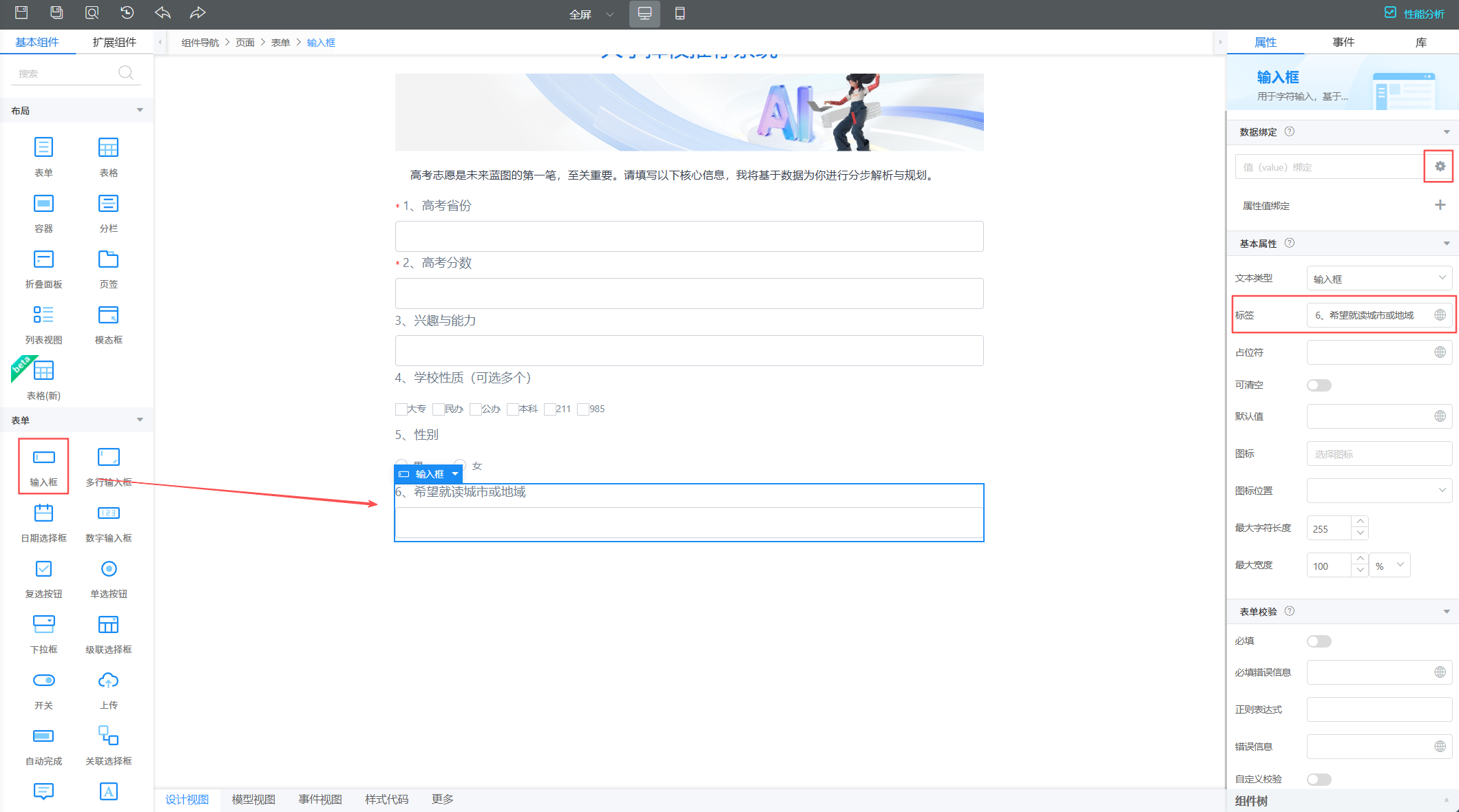 - 在基本组件 > 表单中将组件多行输入框拖拽到表单中间,图片组件下方。