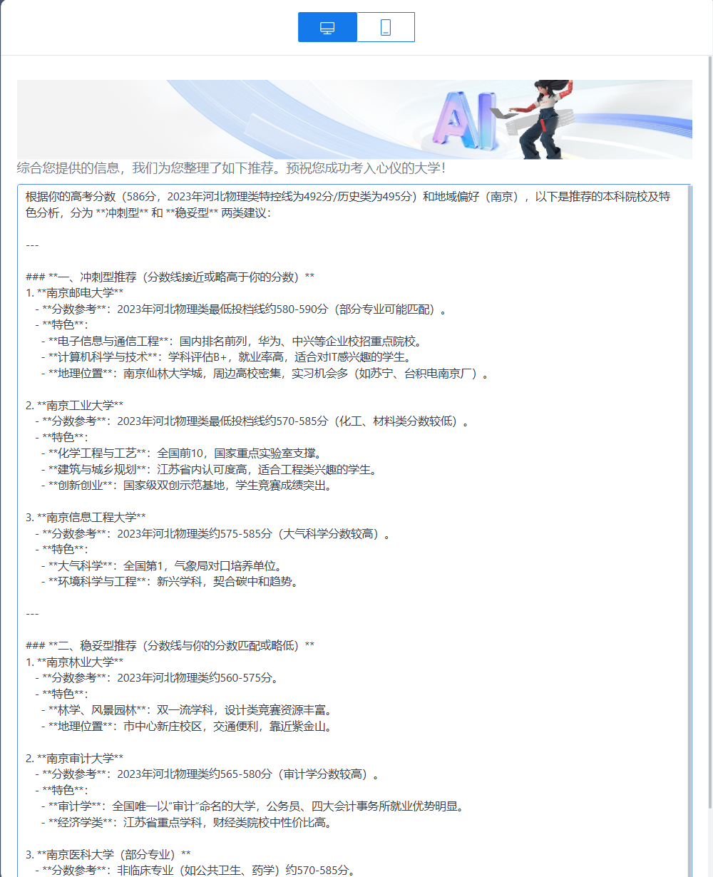 为此,我们开发了一套基于人工智能的高考志愿推荐系统。该系统依托DeepSeek大模型,结合学生成绩、专业偏好与地域倾向,为其智能生成院校志愿填报方案。