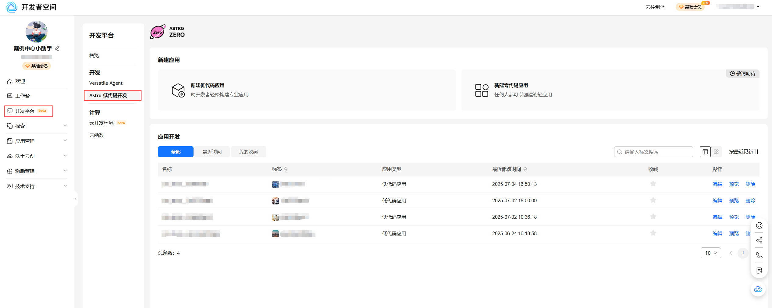 登录华为开发者空间,在左侧菜单列表选择华为开发者空间 -> 开发平台 -> Astro 低代码开发,进入华为开发者空间-低代码应用开发平台。