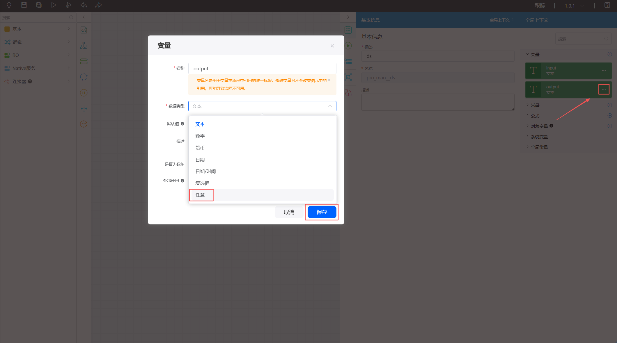 {!input},自动生成,将全局上下文 > 变量中的input变量拖拽到值。