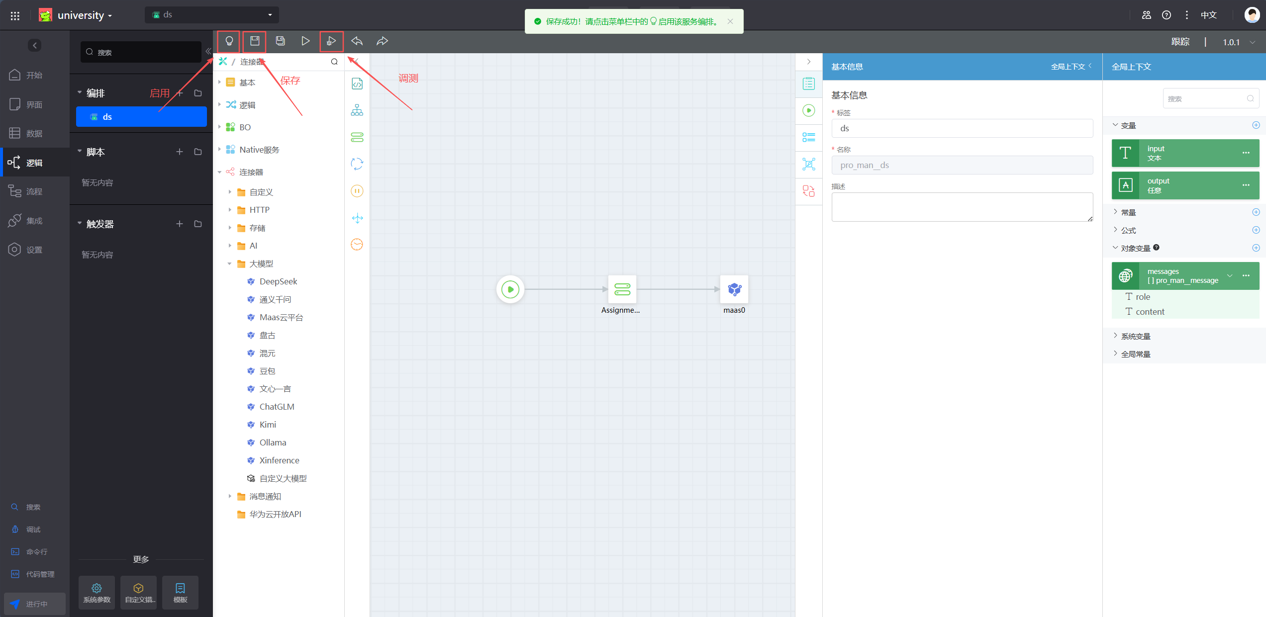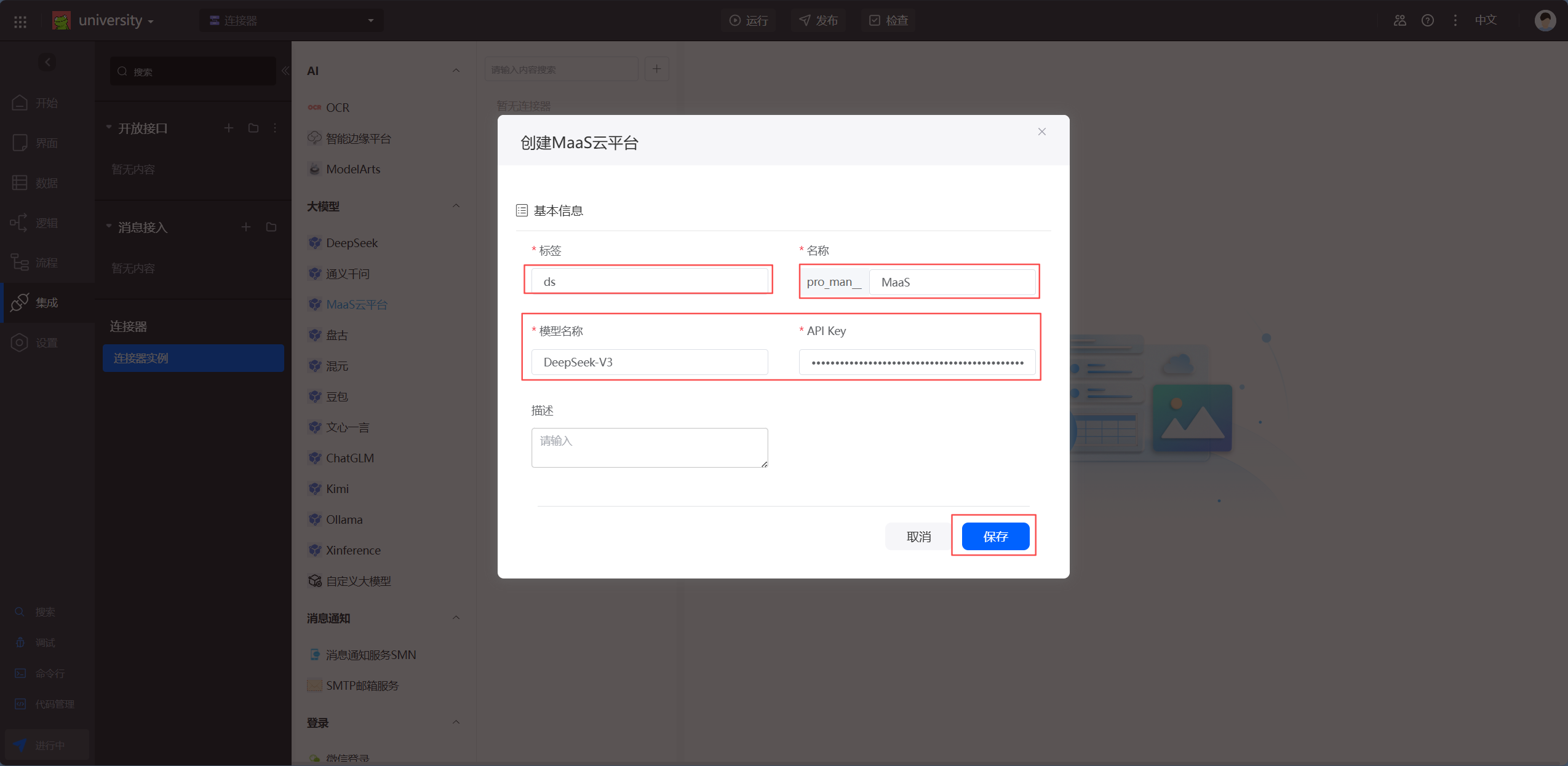 点击右上角“+”,创建自定义连接器。在创建MaaS云平台弹窗,配置其基本信息,然后点保存: