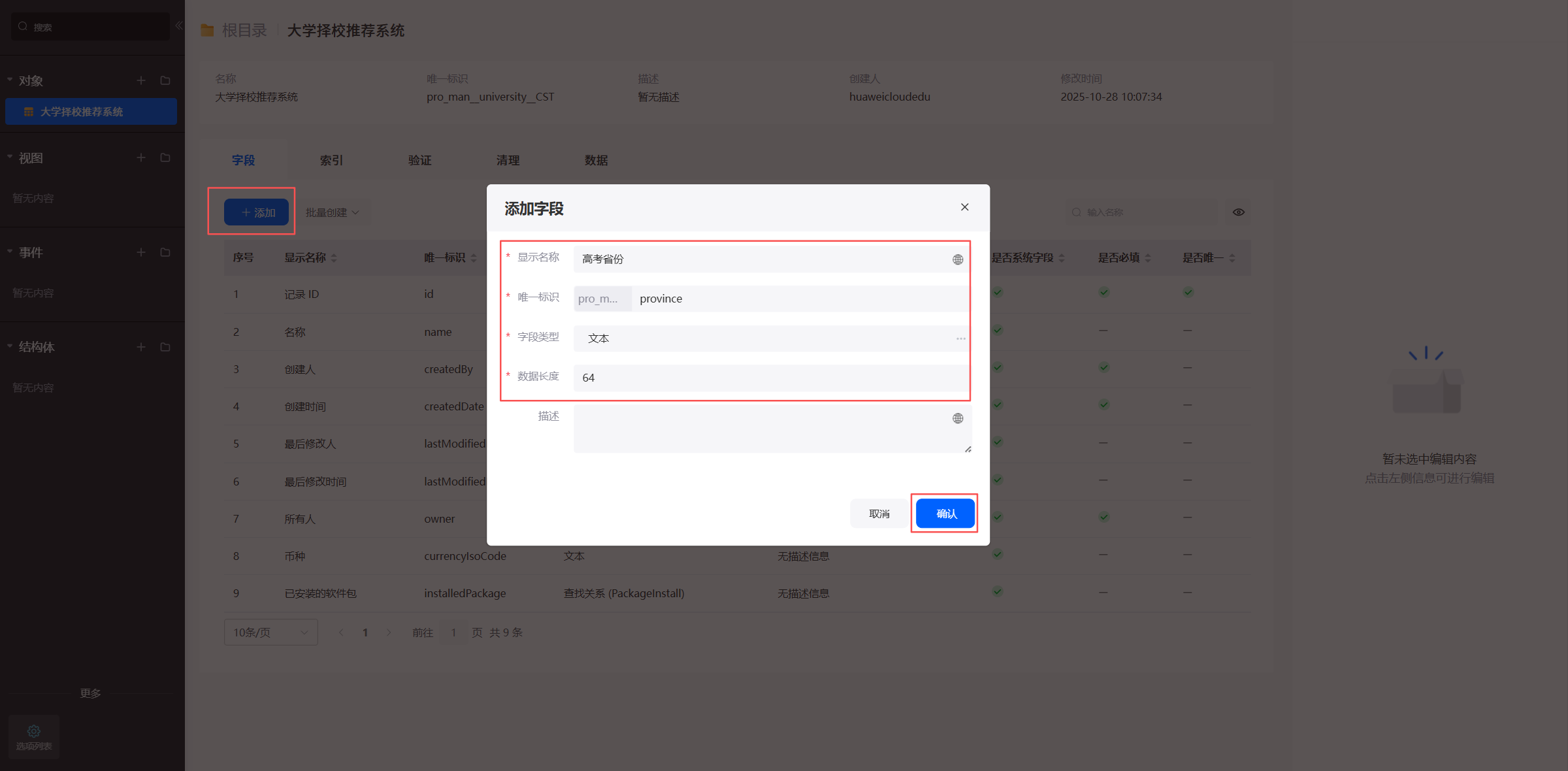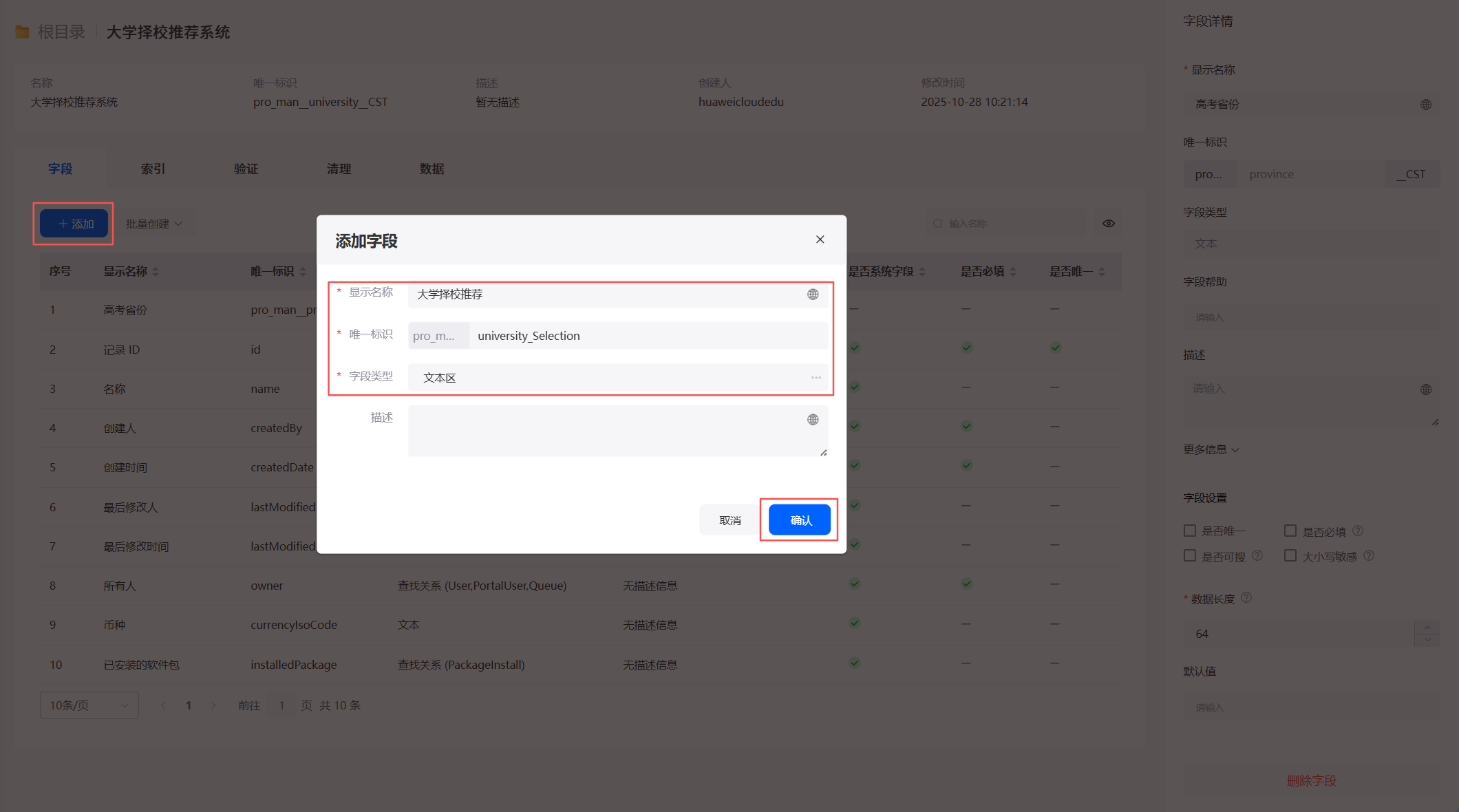 - 在对象详情页,点击“添加”,添加字段,配置字段属性:
