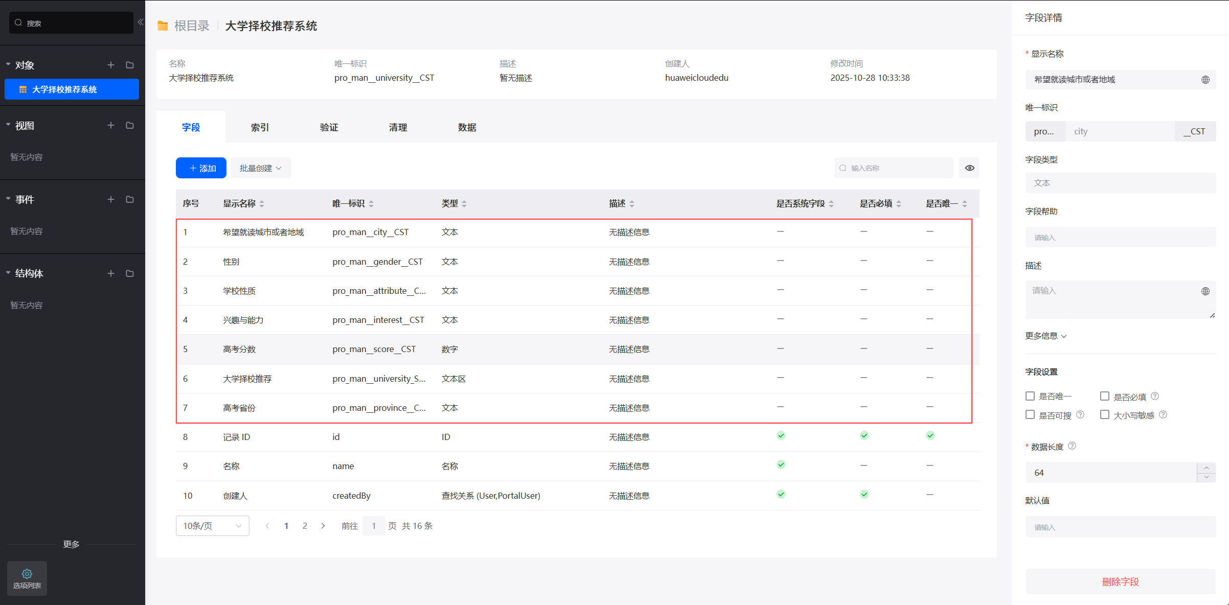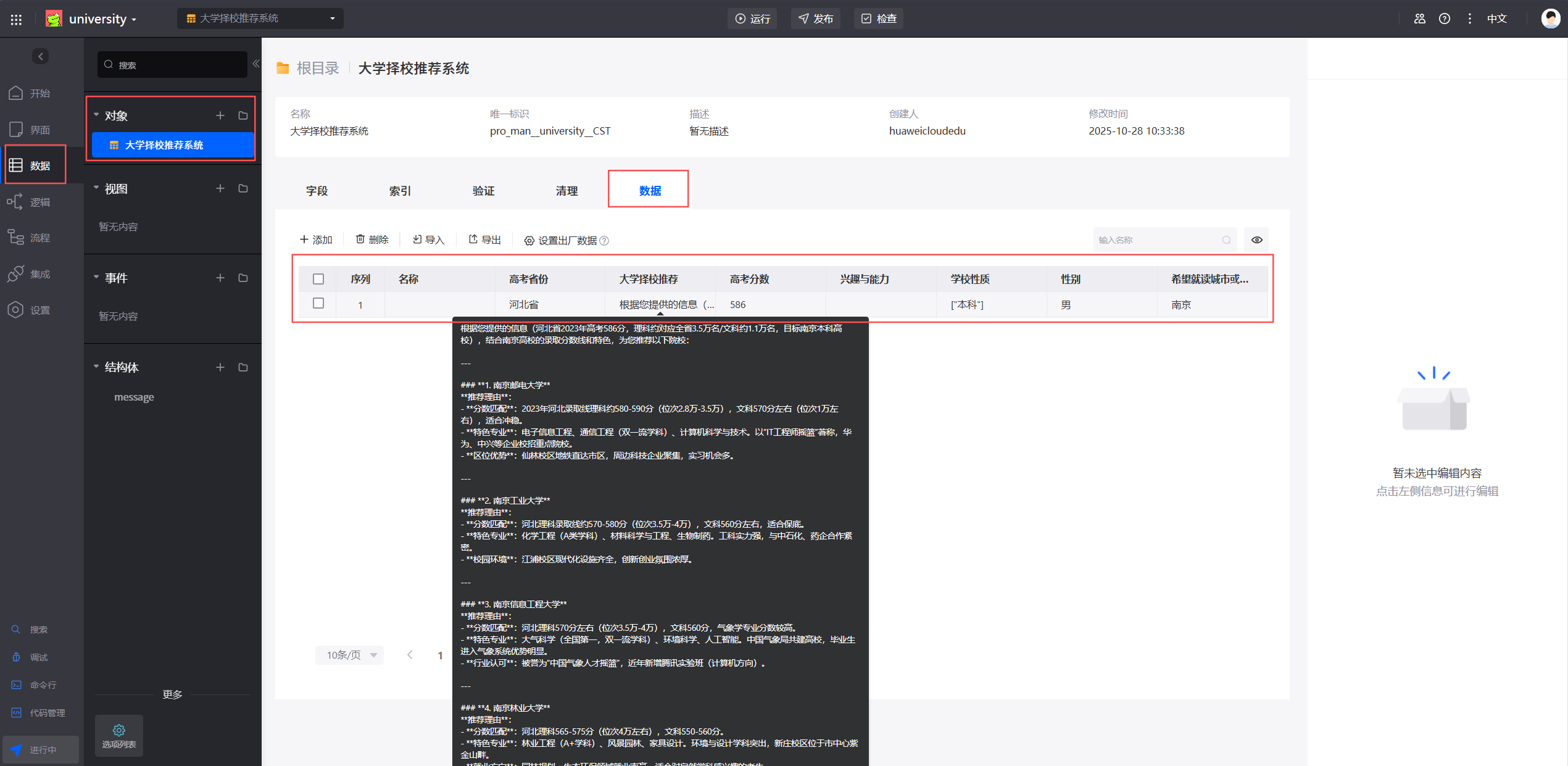 注:请求与返回数据可以在数据后台查看。左侧菜单栏数据 > 对象 > 大学择校推荐系统,在右侧详情页面选择数据标签,在此处我们可以看到之前请求测试的数据。