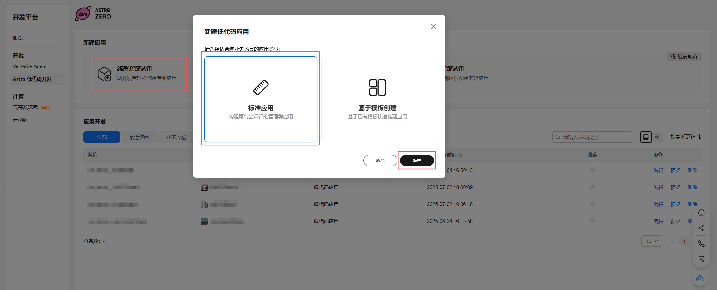- 华为开发者空间-低代码应用开发平台页面点击新建低代码应用,在弹出的新建低代码应用对话框中,选择标准应用,点击确定按钮。