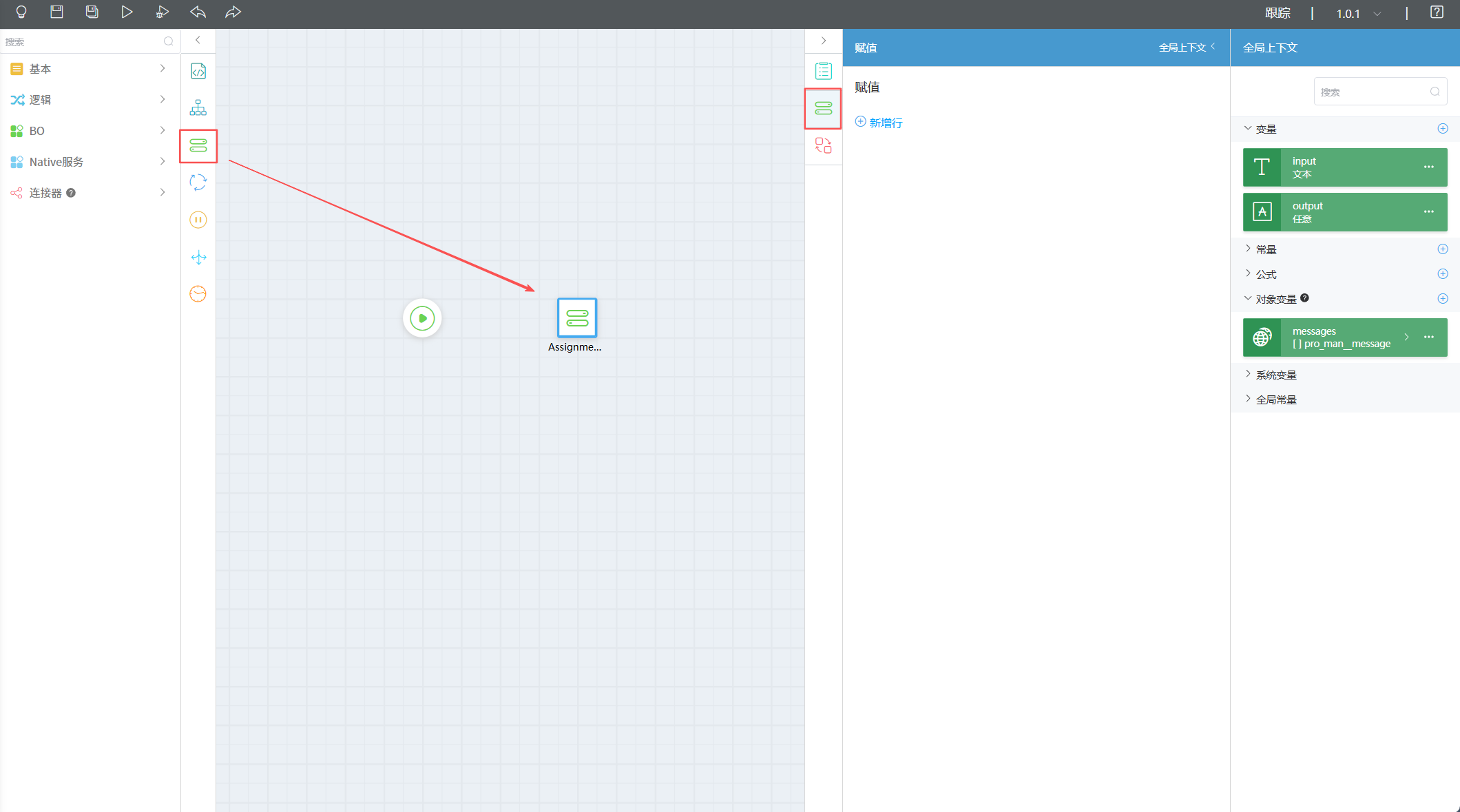 在图元栏,找到赋值图元,并将其拖曳到画布中。