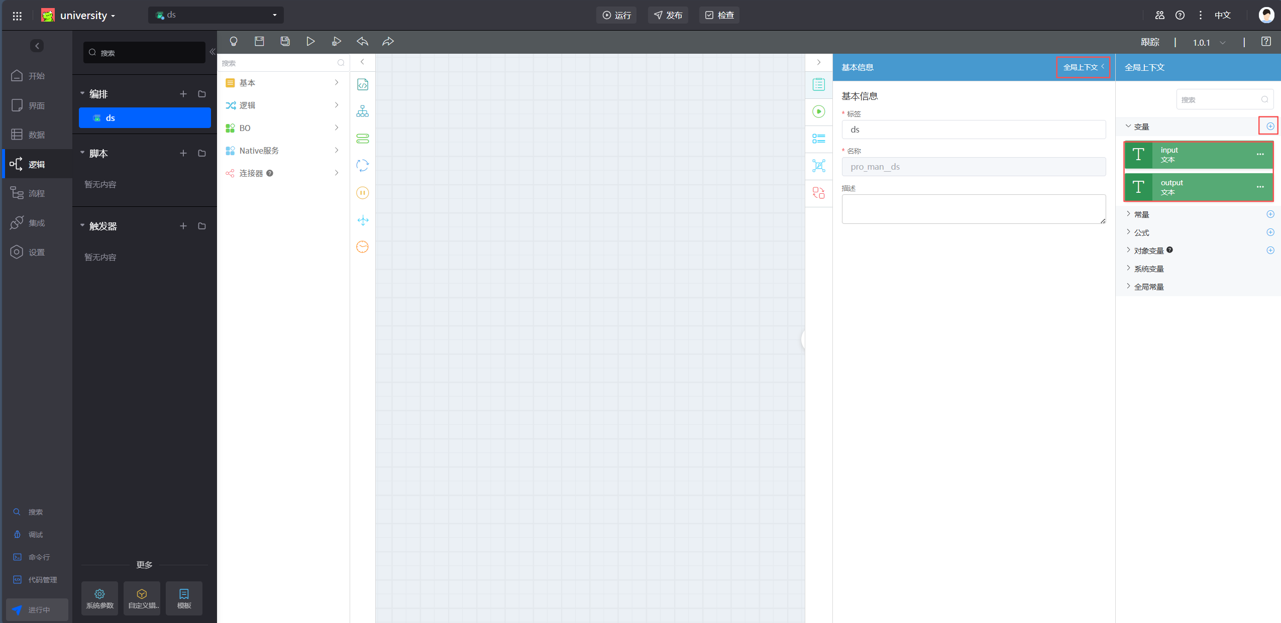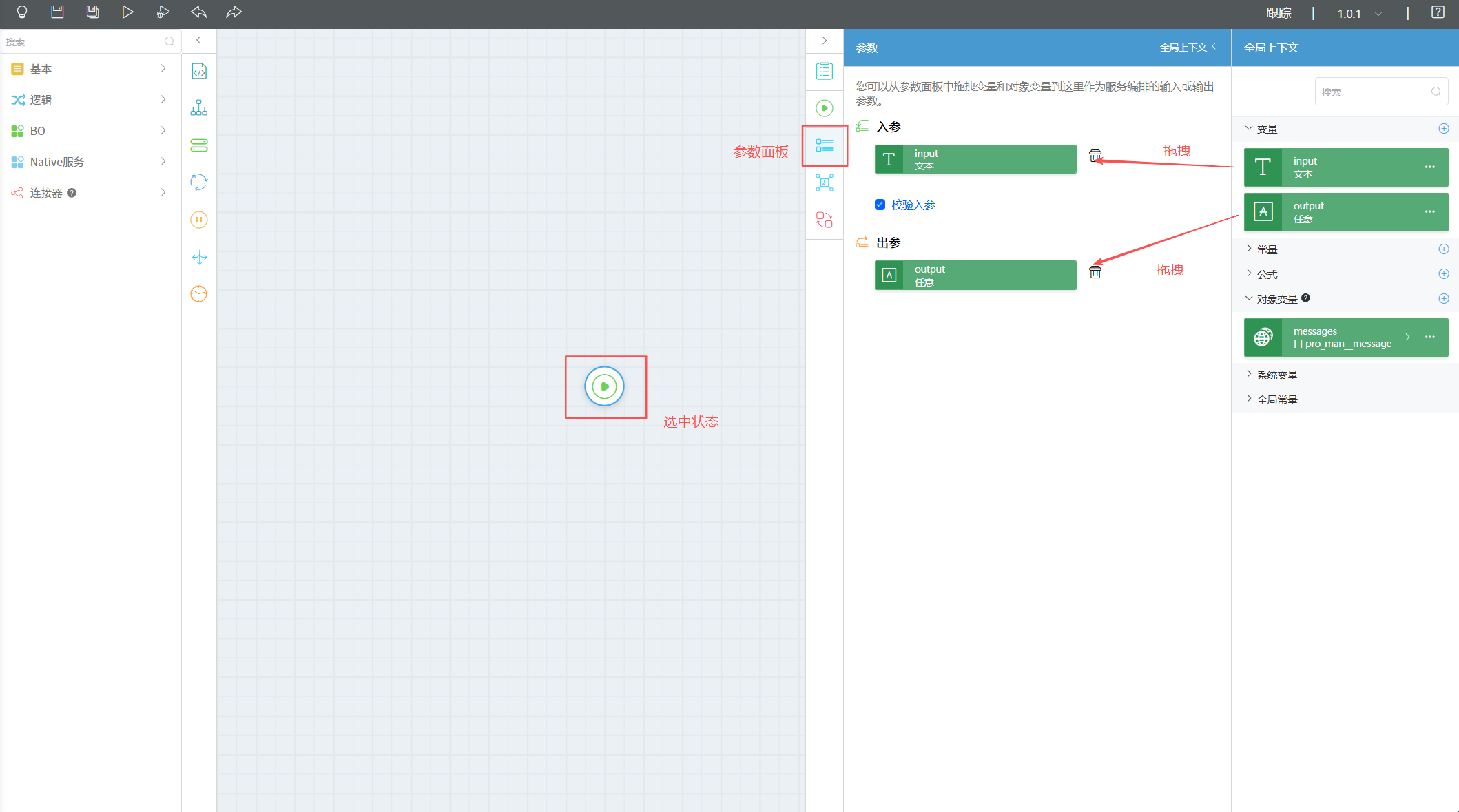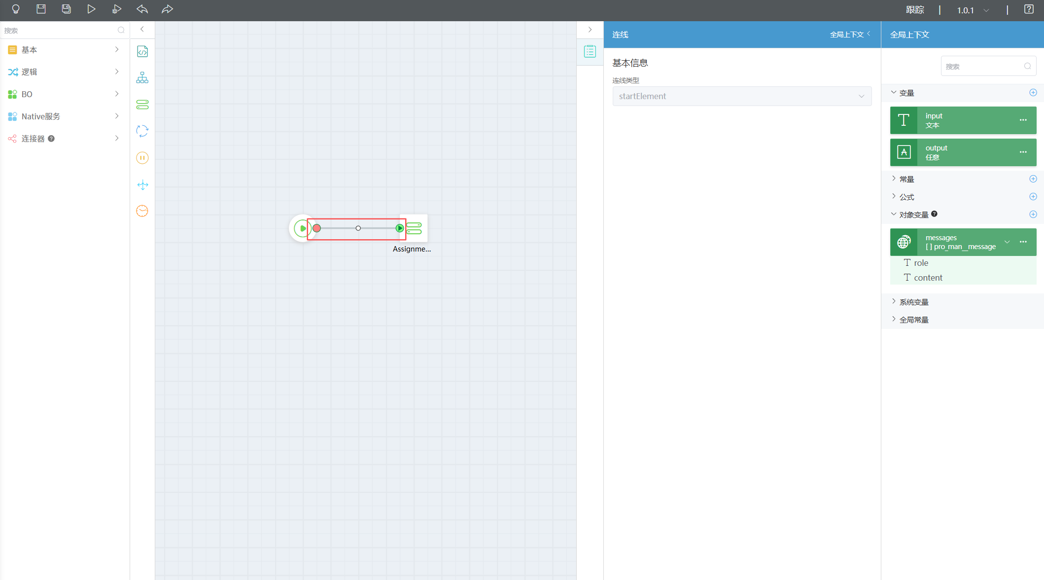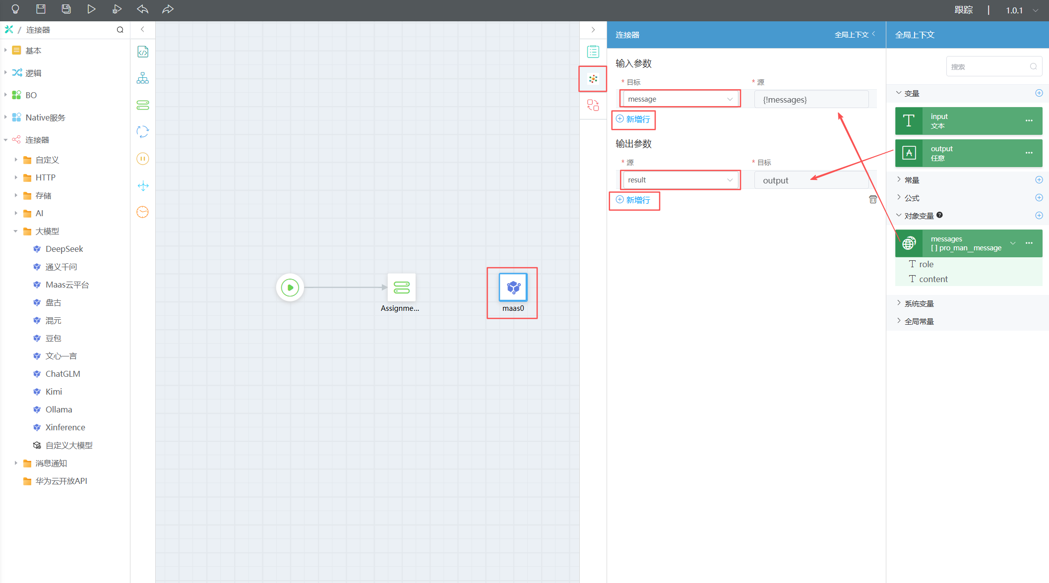 选中连接器图元,在全局上下文点连接器图标,展开连接器面板,配置其输入参数、输出参数。