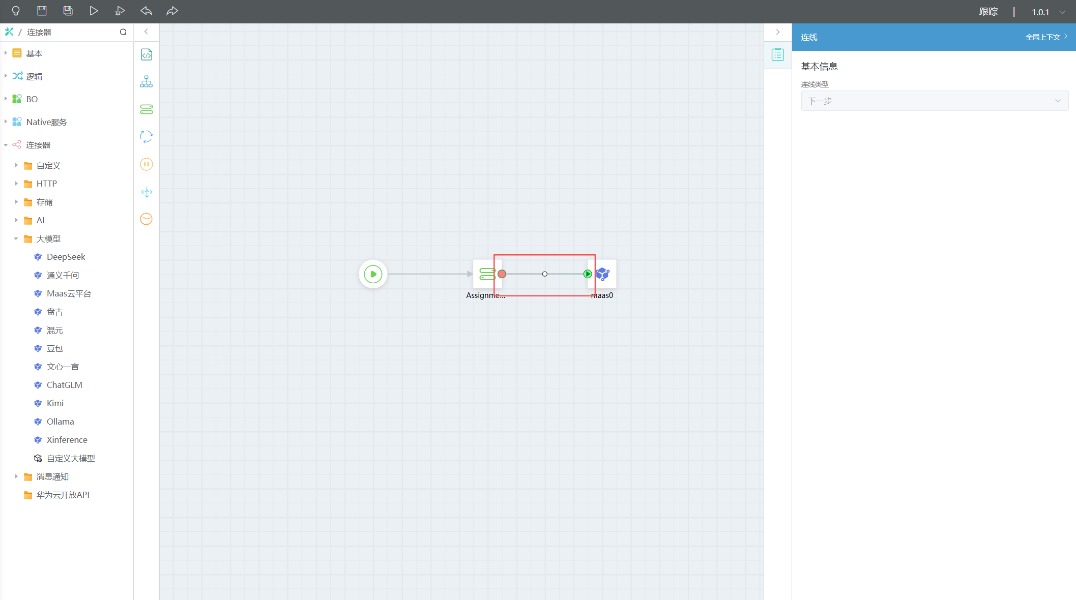 在左侧工具栏连接器 > 大模型中找到 MaaS云平台,并将其拖曳到画布中。
