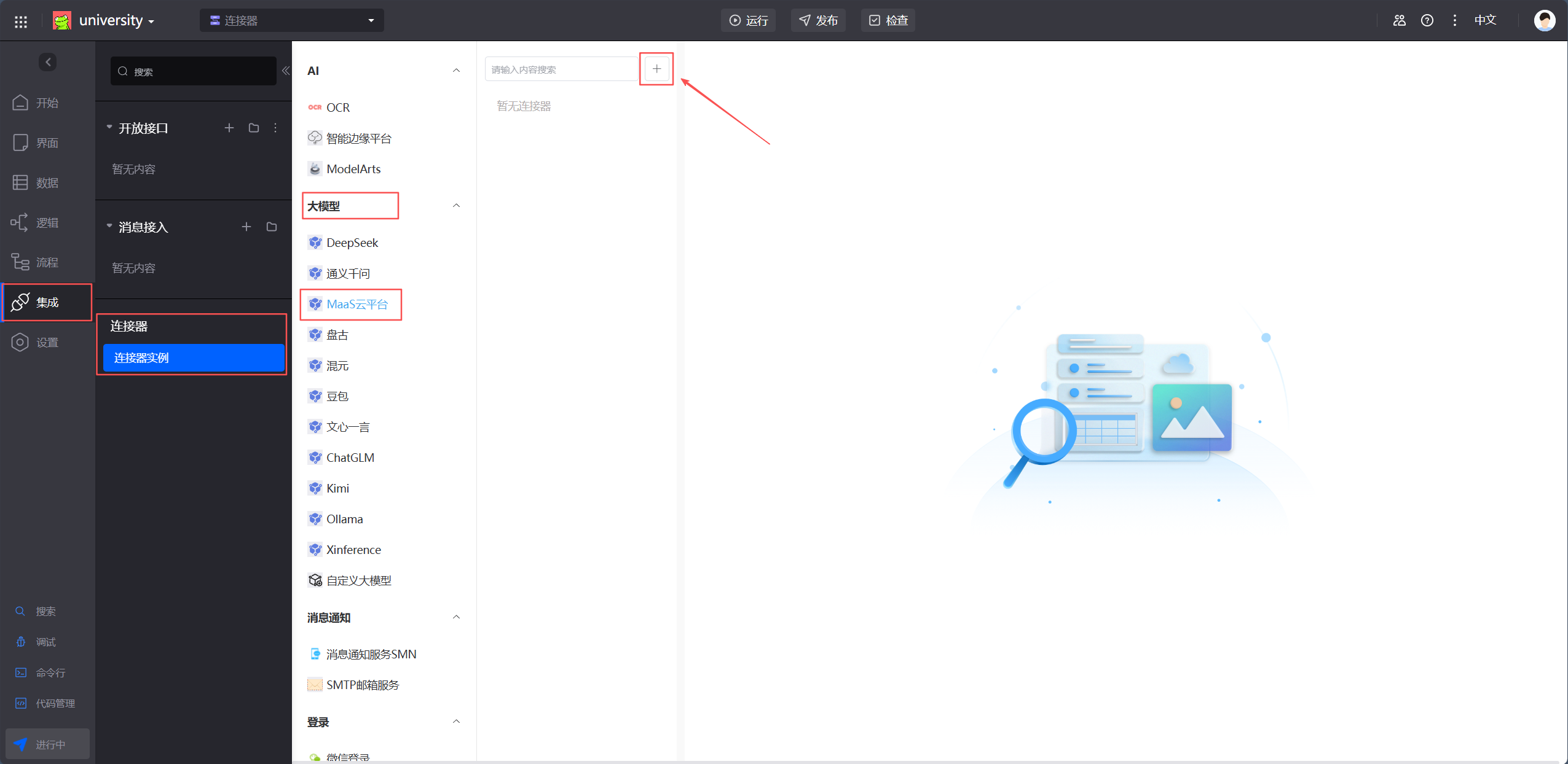 在应用左侧菜单栏,依次点集成 > 连接器 > 连接器实例 > 大模型 > MaaS云平台。