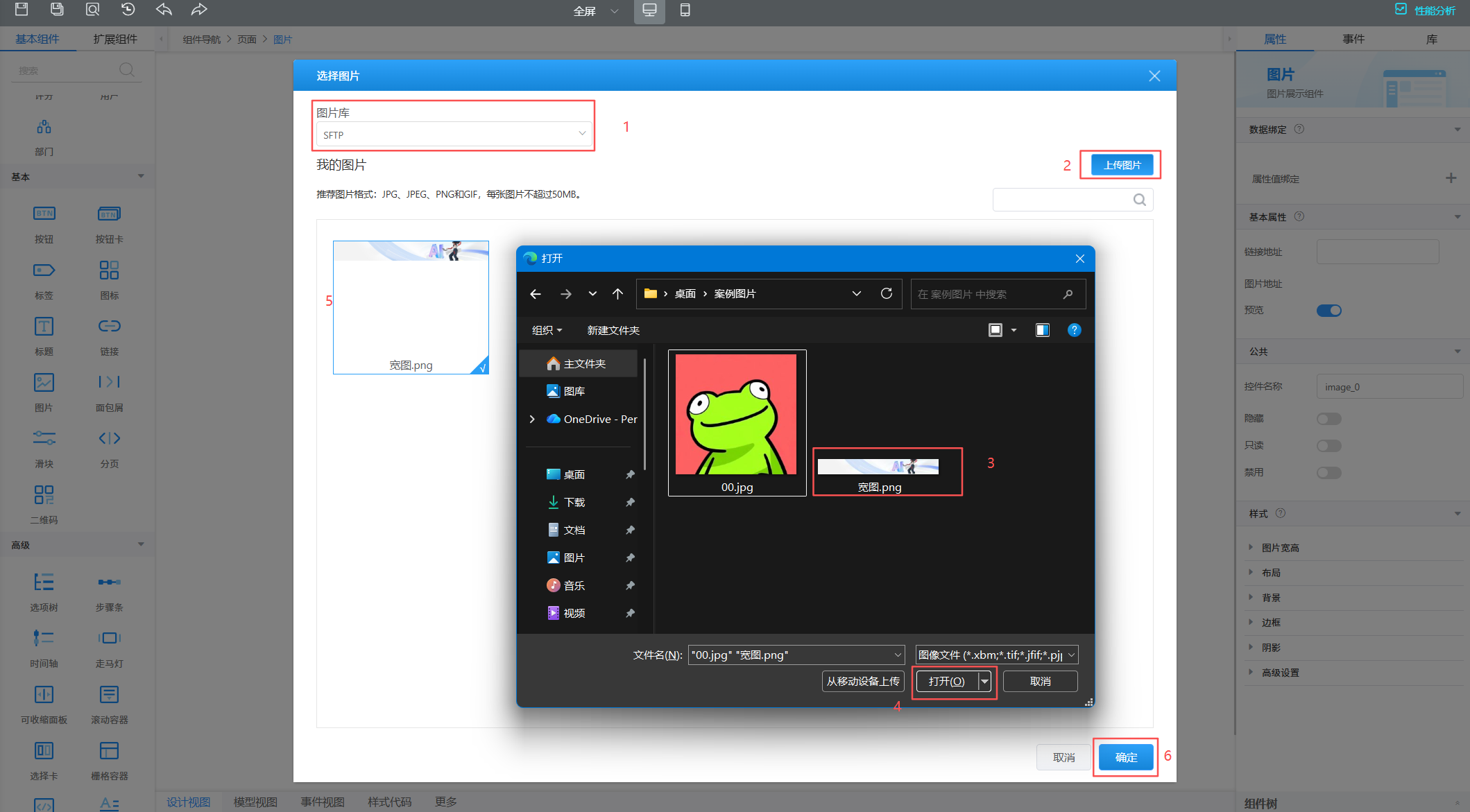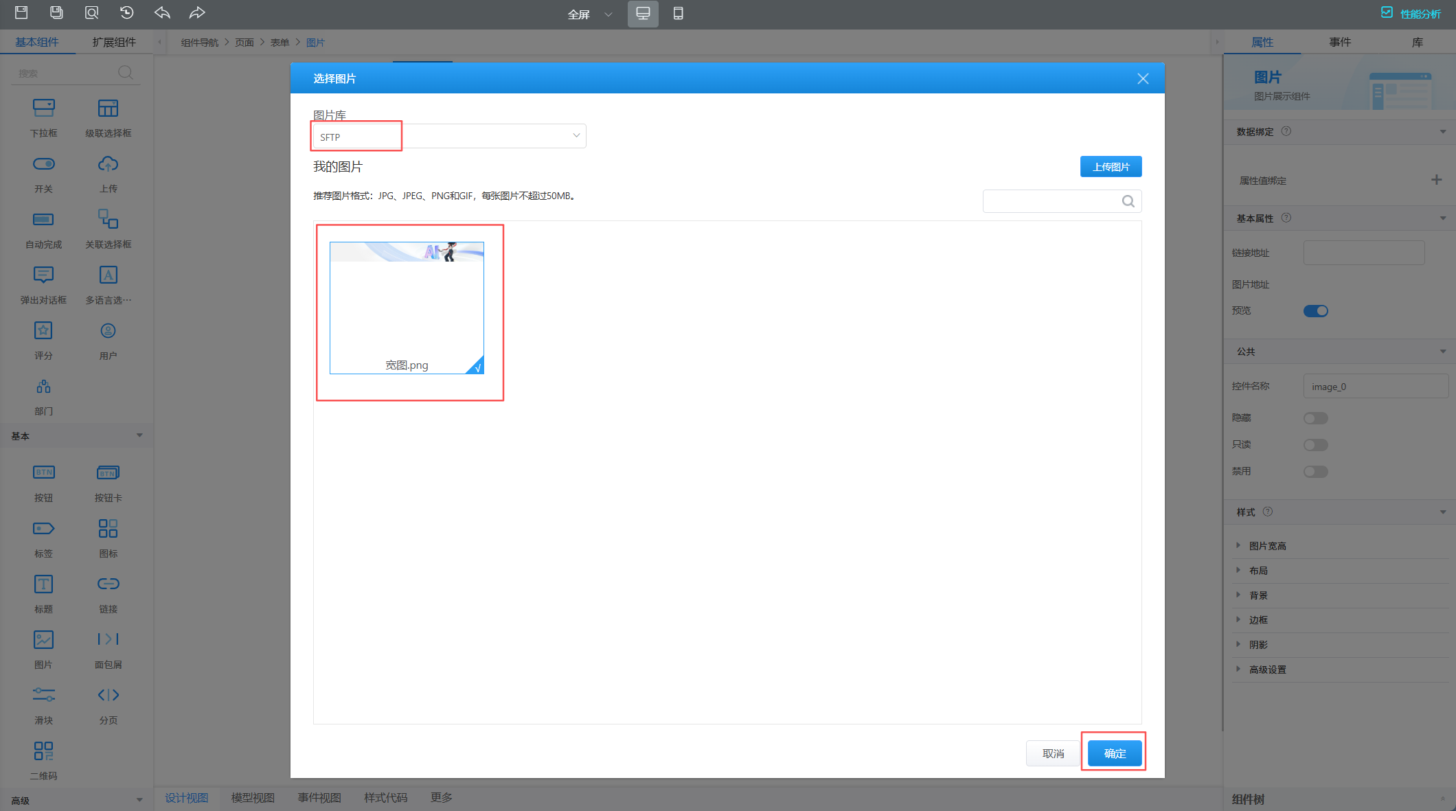 单击图片地址后的选择图片图标。在选择图片界面,图片库选择SFTP,选中图片,点确定。