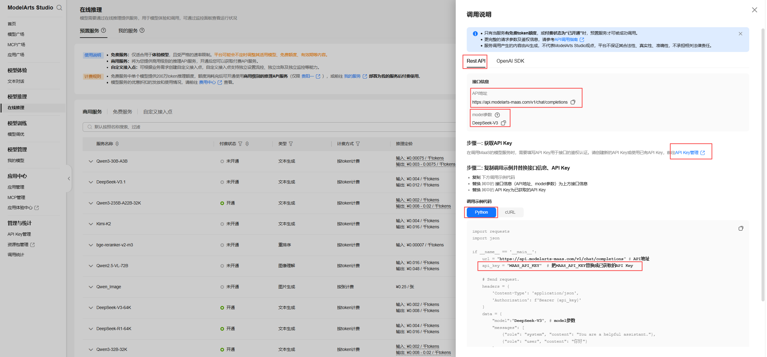 完成上述步骤后,将获得API地址、model参数、API Key等关键参数。