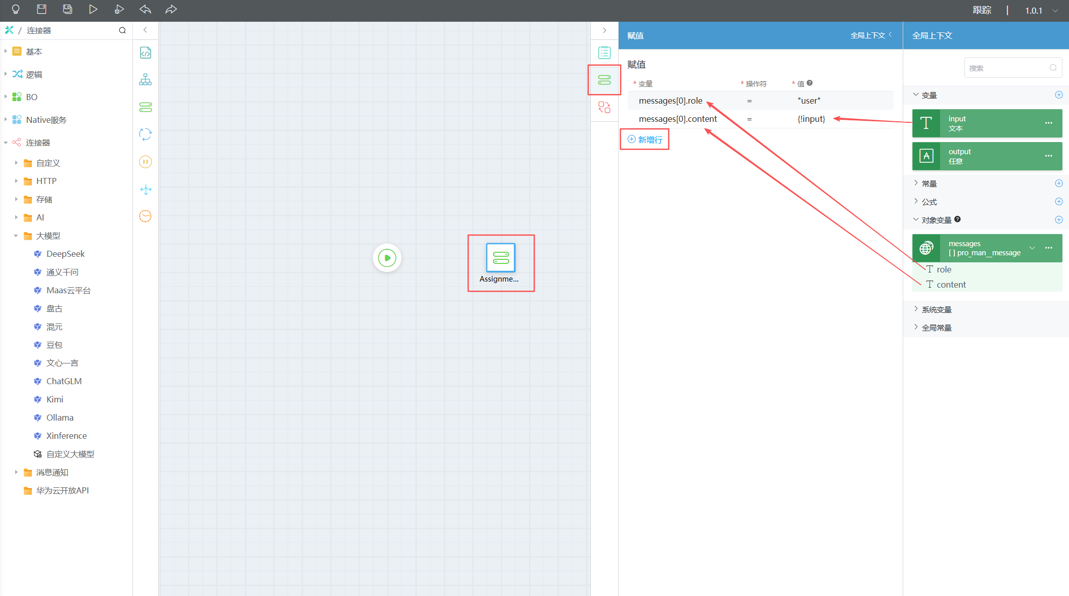 messages[0].role,自动生成,将全局上下文 > 对象变量中messages的role字段拖拽到变量; - 操作符: