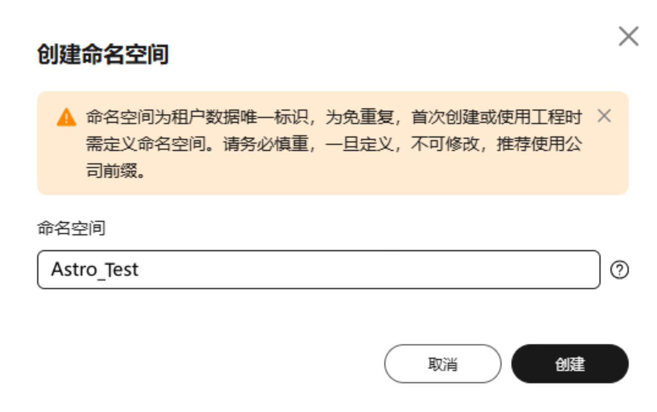 注:命名空间为租户数据唯一标识,为免重复,首次创建或使用工程时需定义命名空间。请务必慎重,一旦定义,不可修改,推荐使用公司前缀。本案例中使用pro_man作为命名空间。