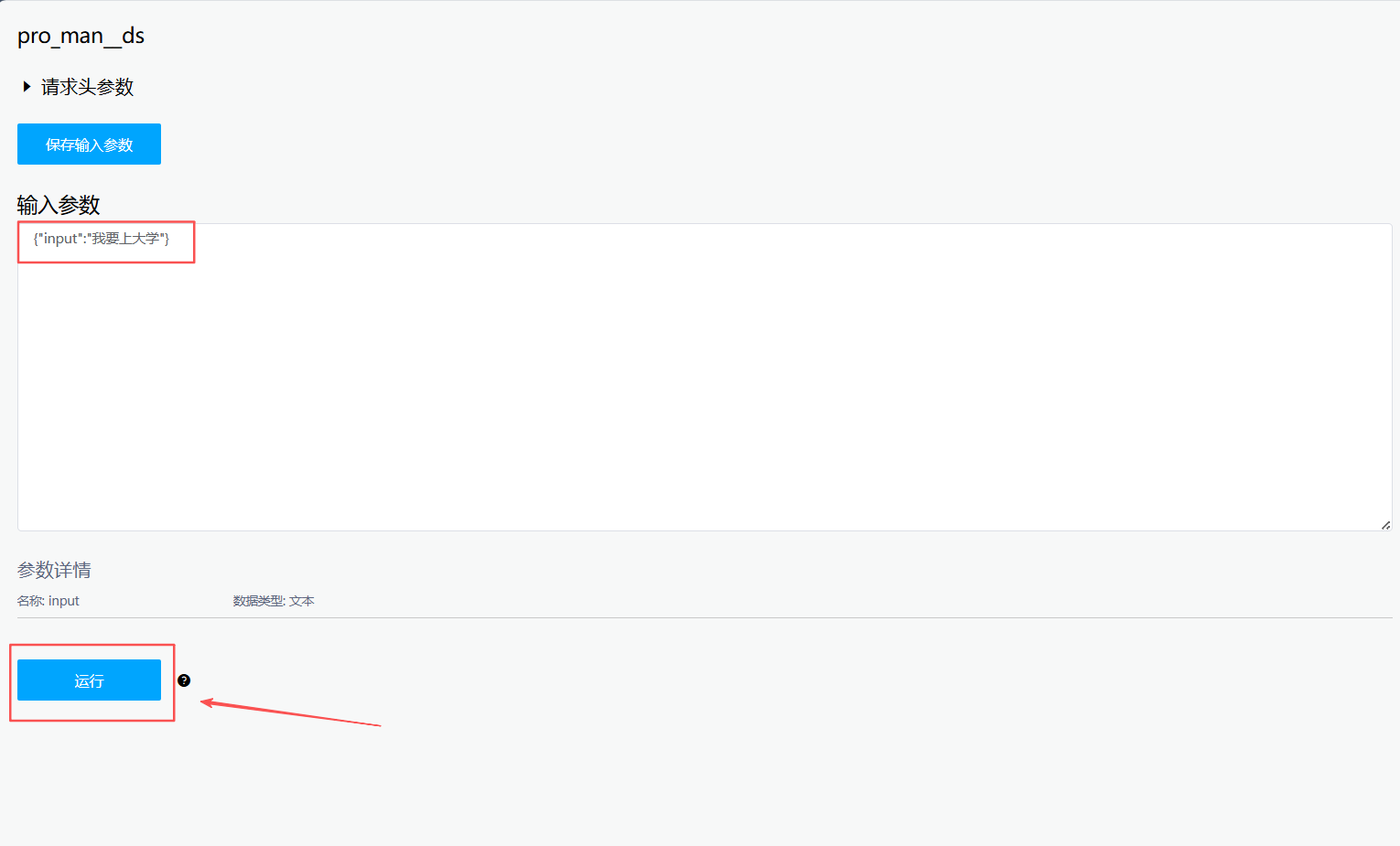 在输入参数栏输入:{"input":"我要上大学"},然后点运行。