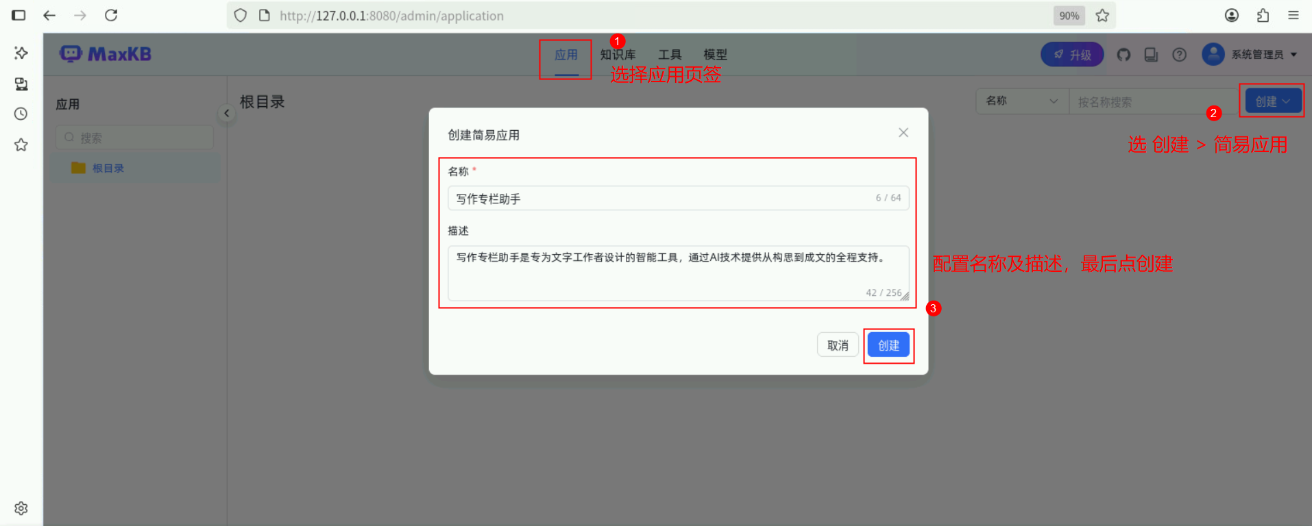 在MaxKB工作台页面应用 > 创建 > 简易应用,在创建简易应用对话框编辑名称及描述,然后点创建。