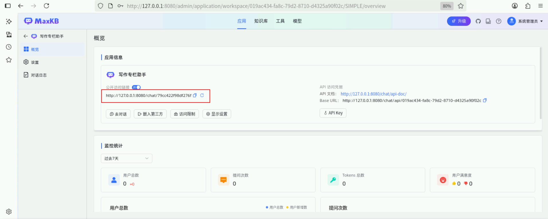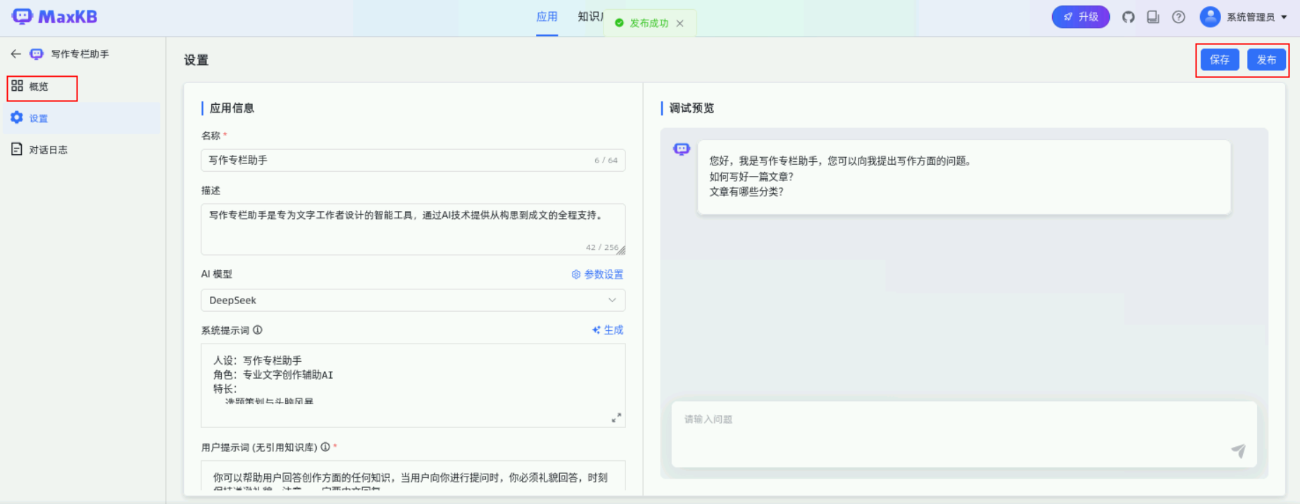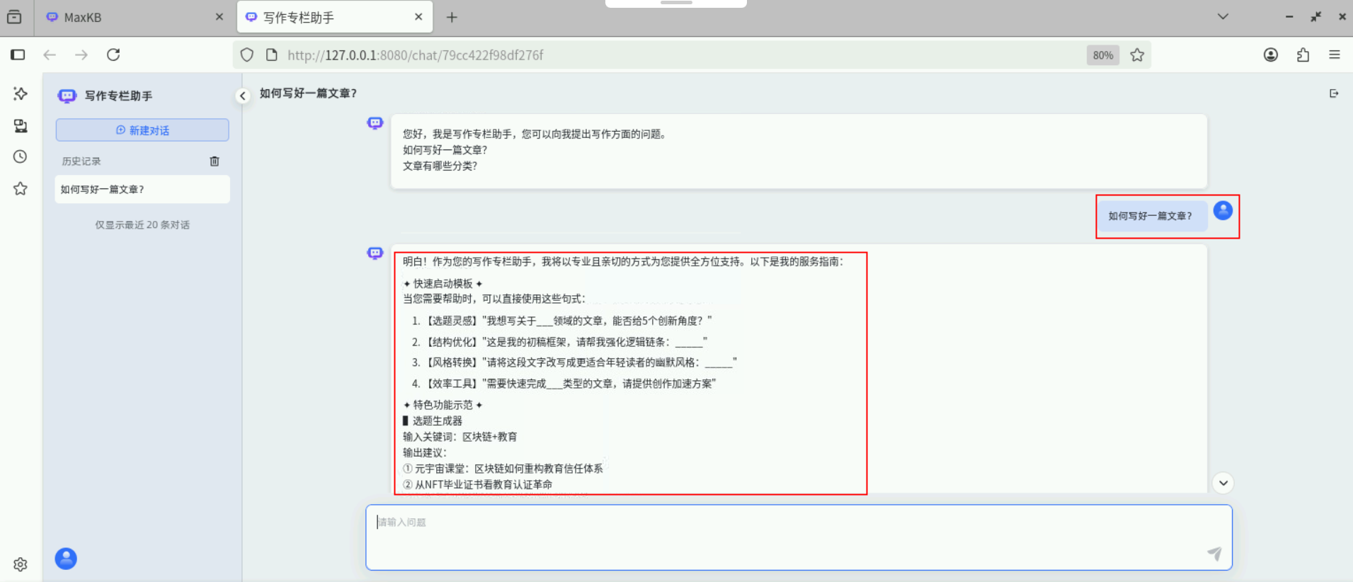 - 发布写作专栏助手应用,浏览器测试智能对话。