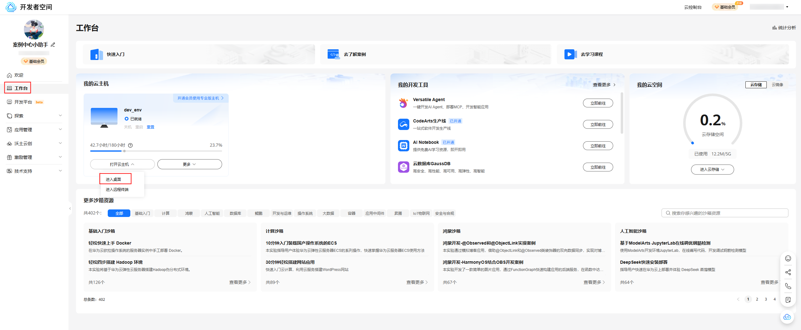 进入华为开发者空间-工作台,在我的云主机卡片,点打开云主机 > 进入桌面。