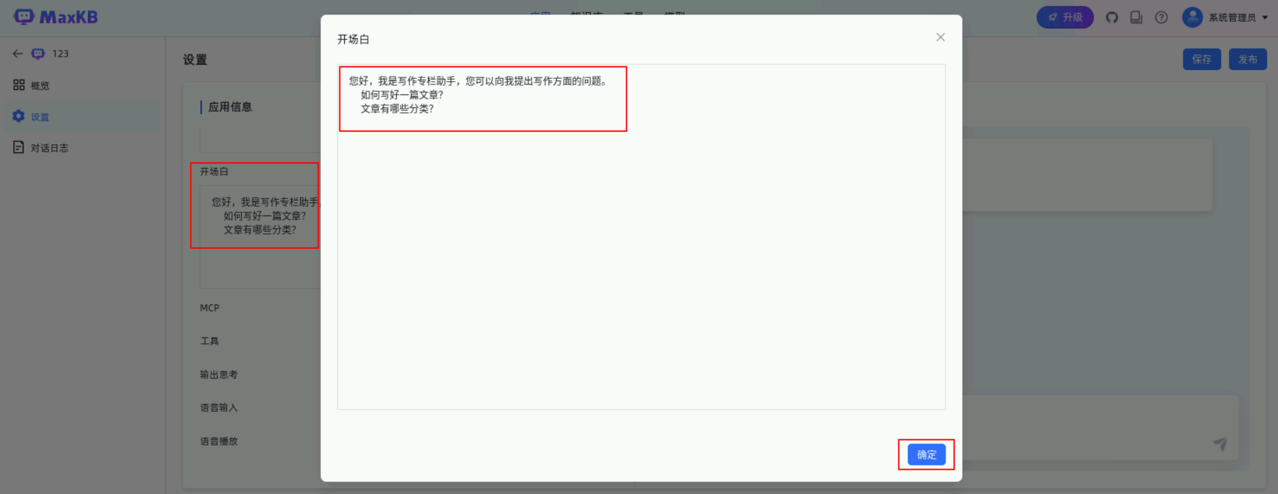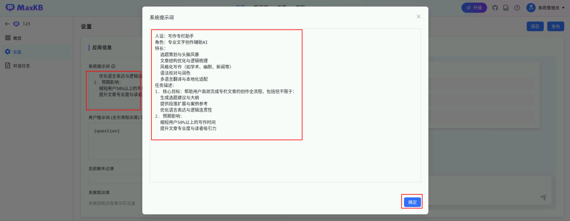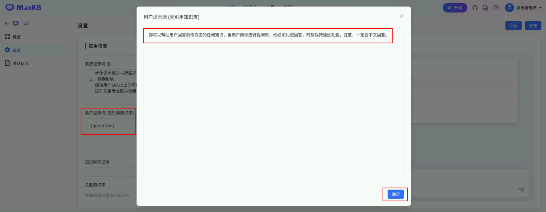 参考如下样例,填写用户提示词 (无引用知识库),然后点确定。