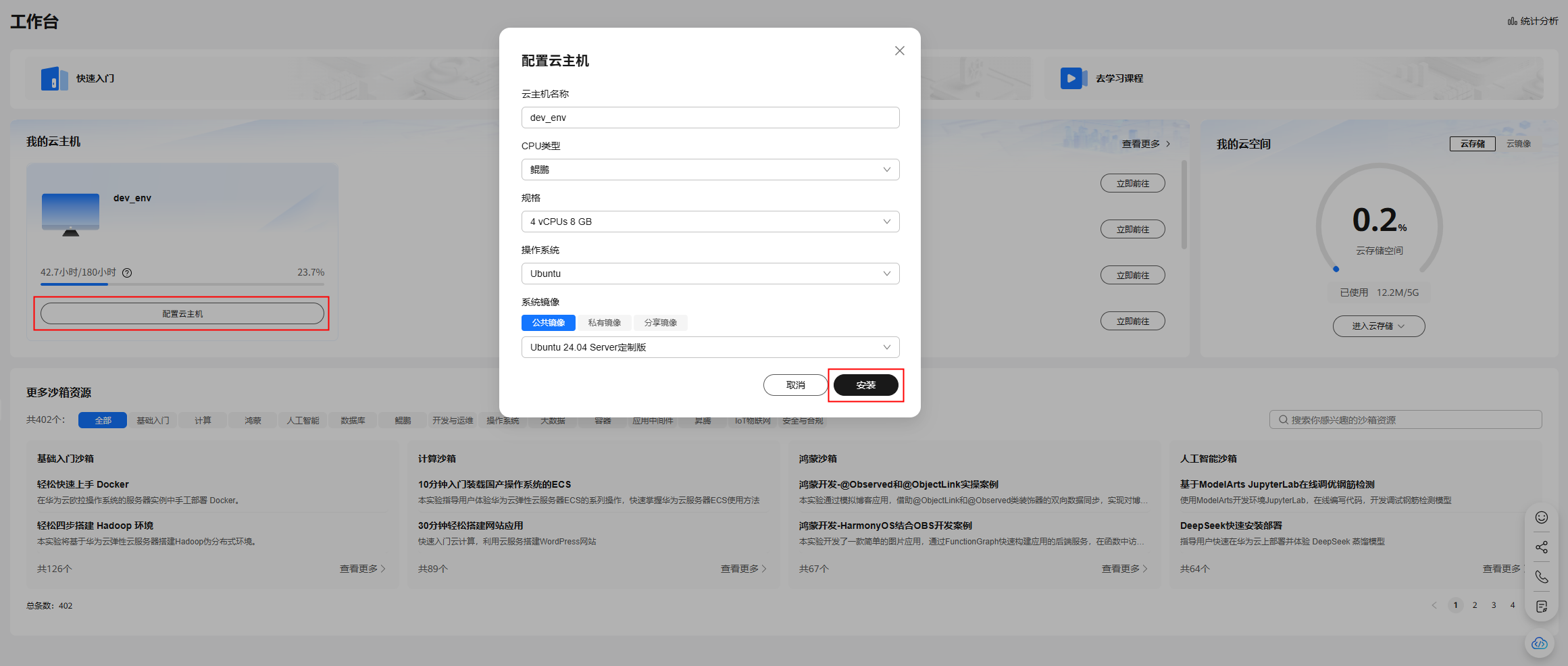 注:若尚未配置云主机,在工作台界面点配置云主机,参考下图配置信息配置,最后点安装。