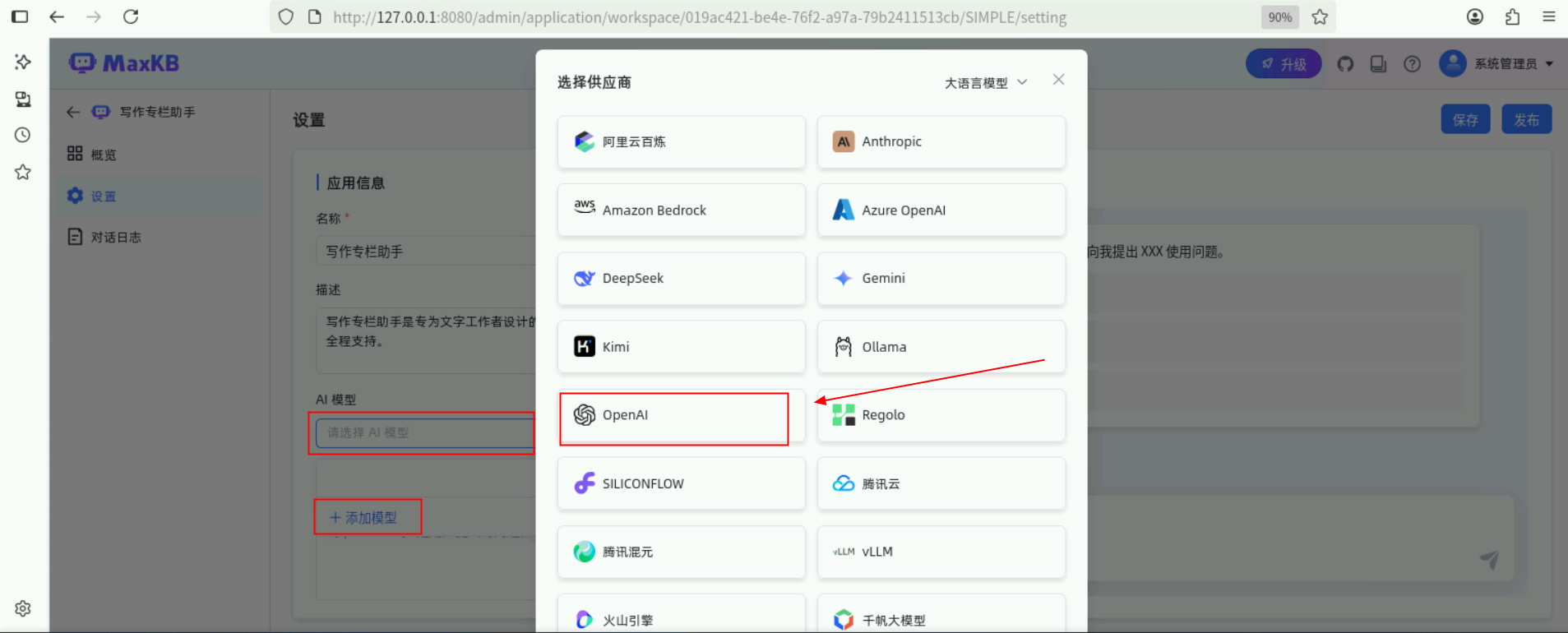 完成创建后,进入应用设置界面,点AI模型 > 添加模型。选择模型供应商OpenAI,然后配置OpenAI。