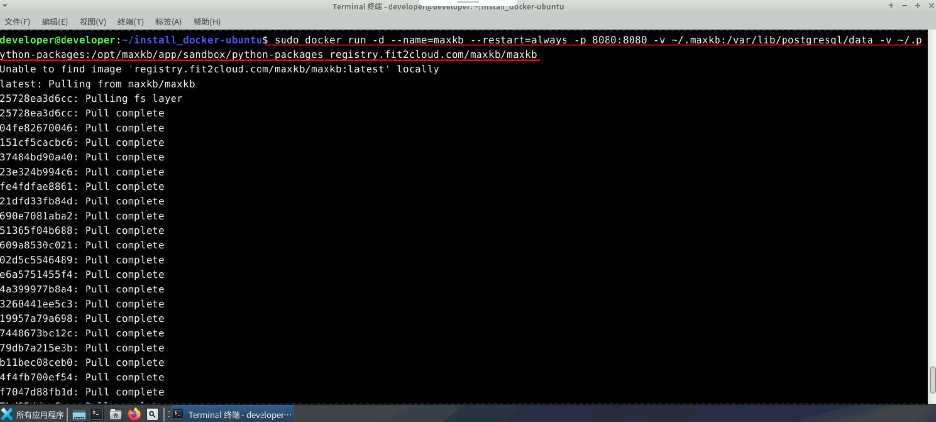 在命令行窗口输入以下命令,自动拉取MaxKB镜像,启动Docker容器。